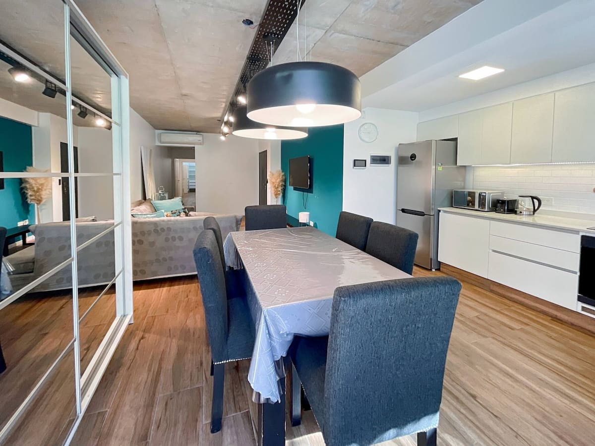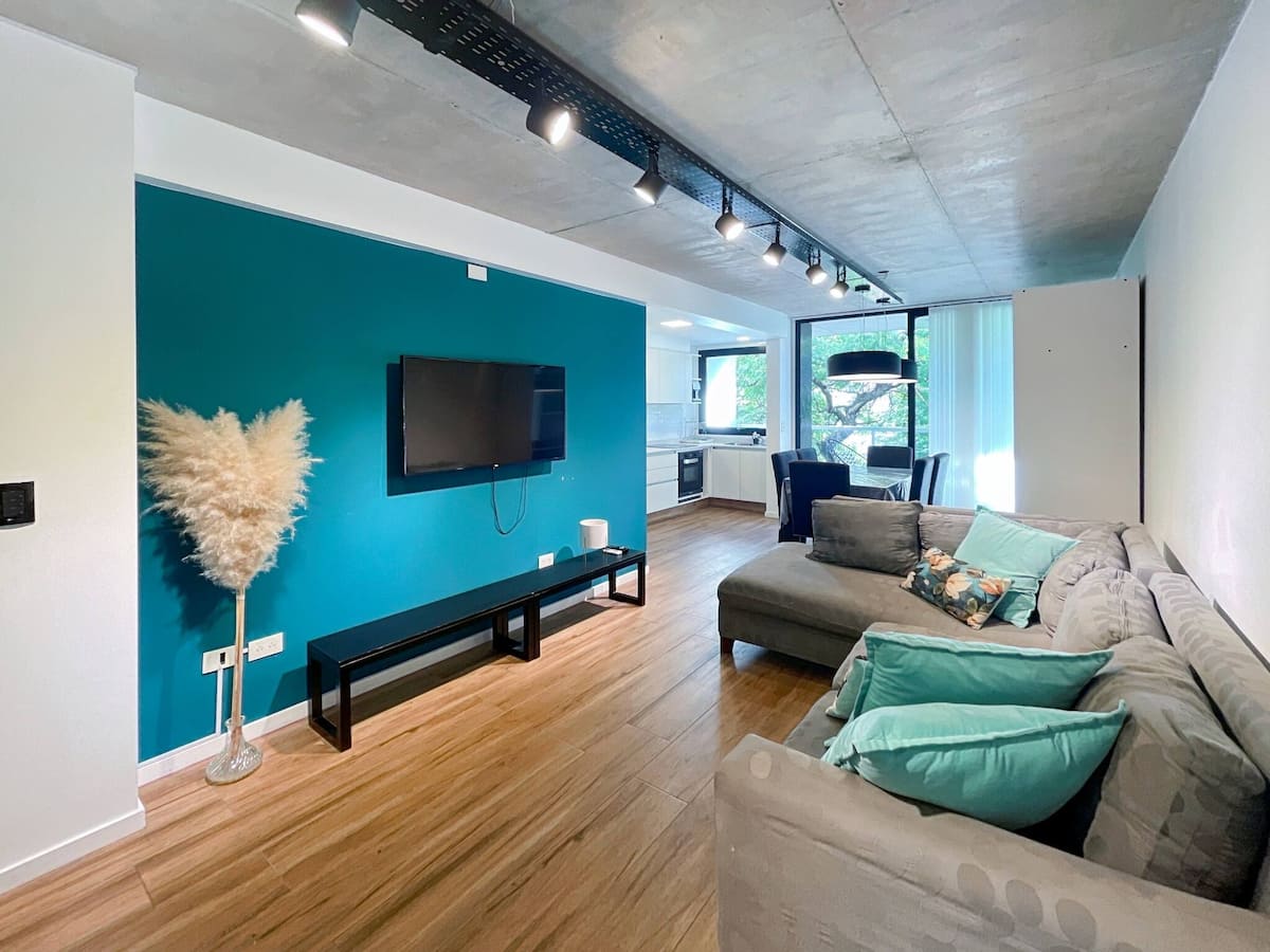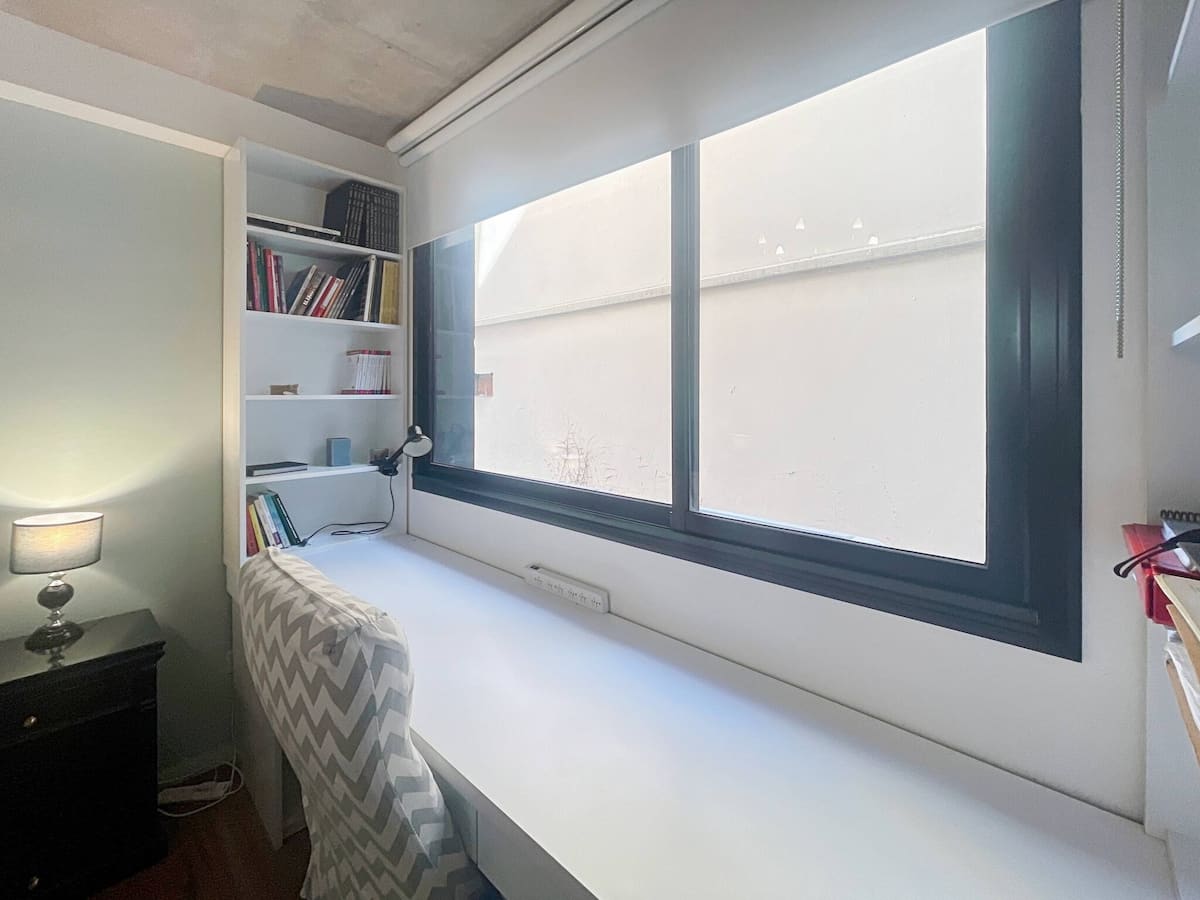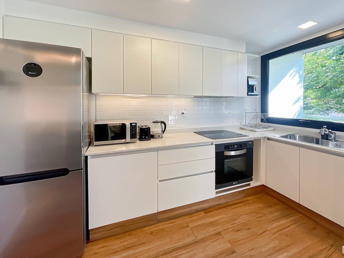 Departamento de 2 dormitorios con balcón en Villa del Parque. Cuenta con 2 baños y cocina equipada, con heladera, horno, microondas y lavavajillas. Presenta un área de estar de concepto abierto y acceso a 1 cuadra de la estación de tren. La publicación indica que los precios se fijan en moneda extranjera (euros o dólares).