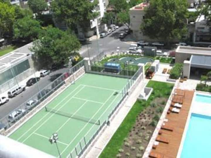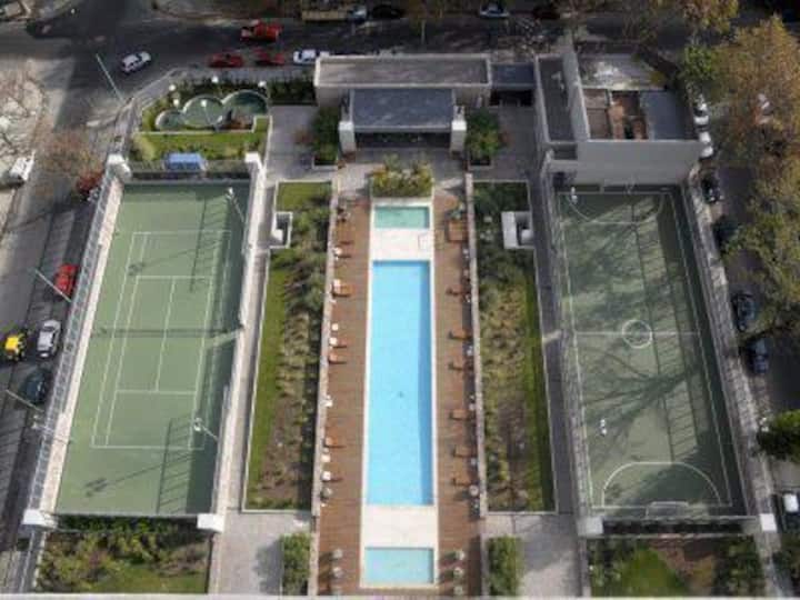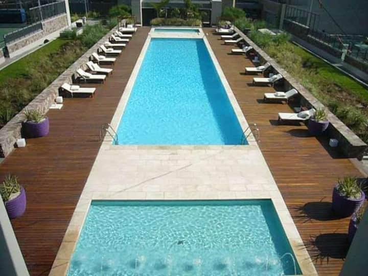 Departamento en edificio Quartier Boulevard, en piso alto, con 2 dormitorios en suite. Cocina con lavarropas y living-comedor con vista. Incluye cochera fija, además de pileta, gimnasio, parrilla, cancha de tenis, cancha de fútbol, laundry y vigilancia 24 horas.