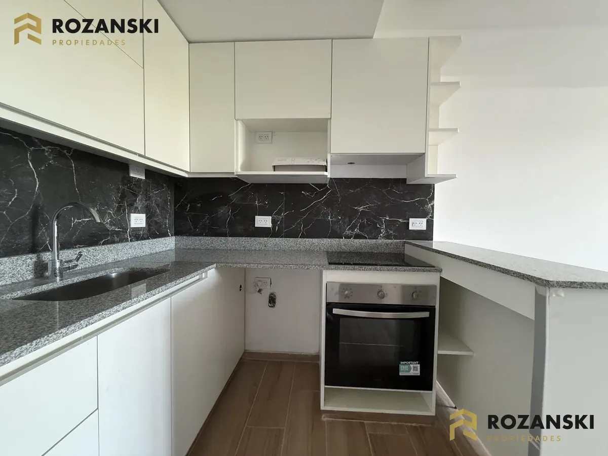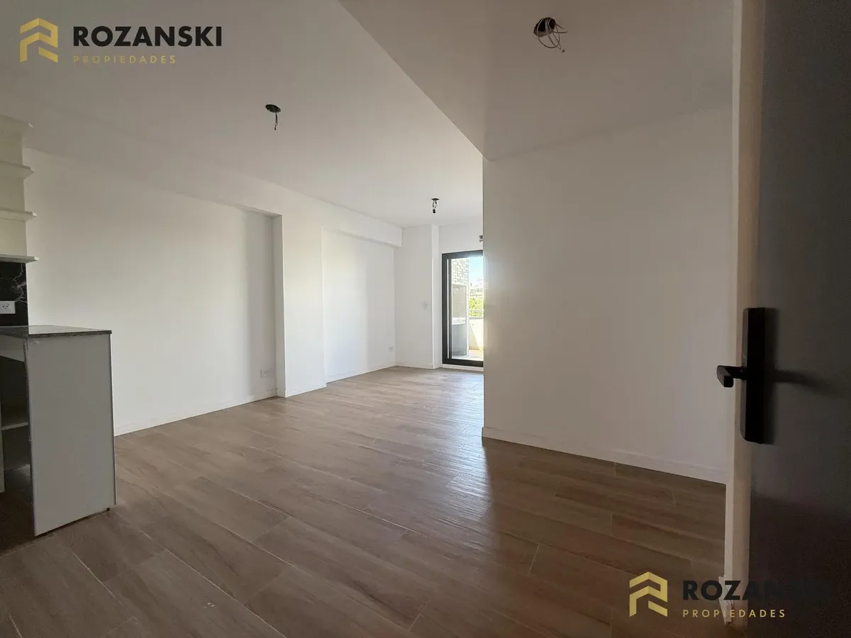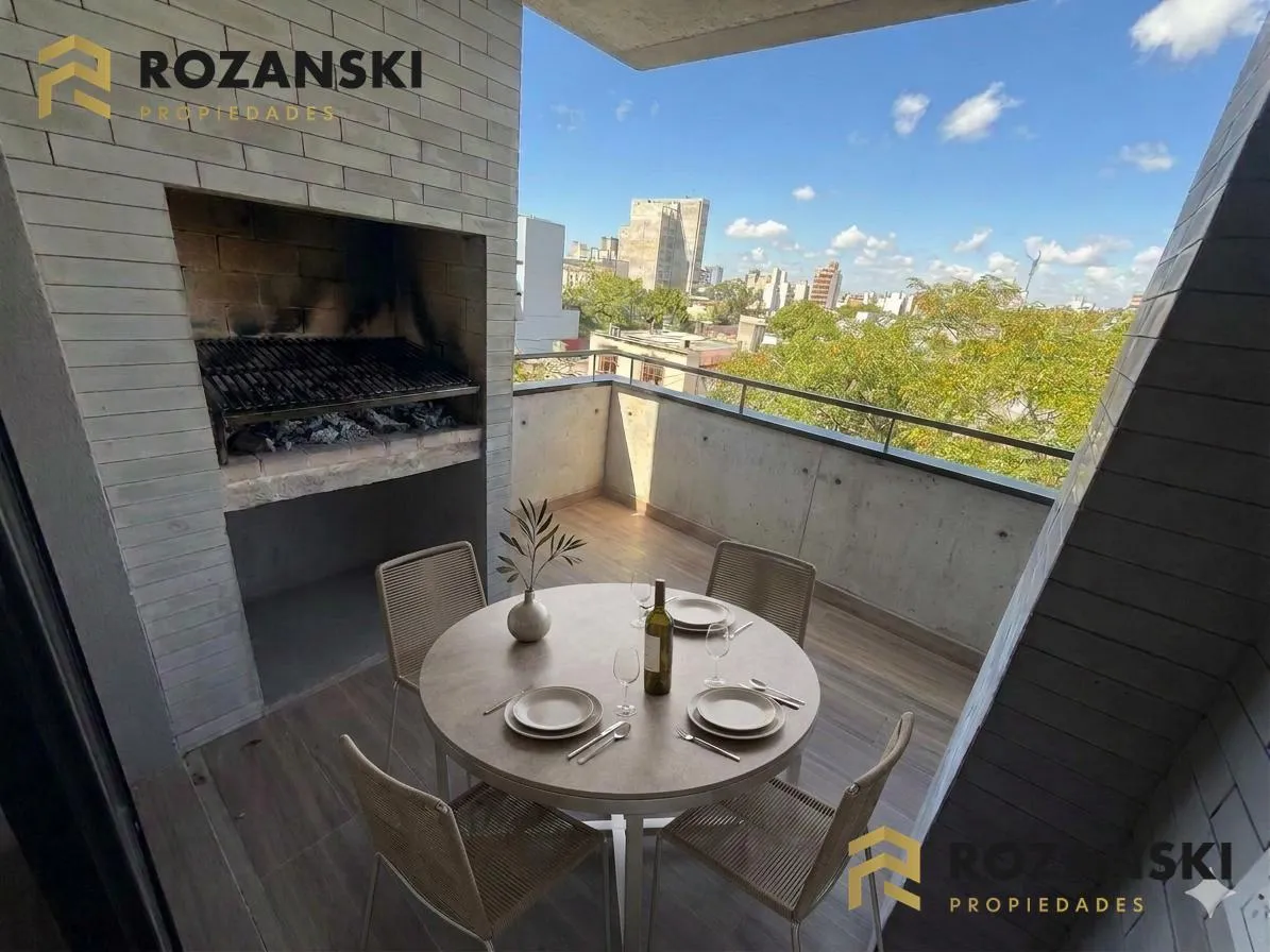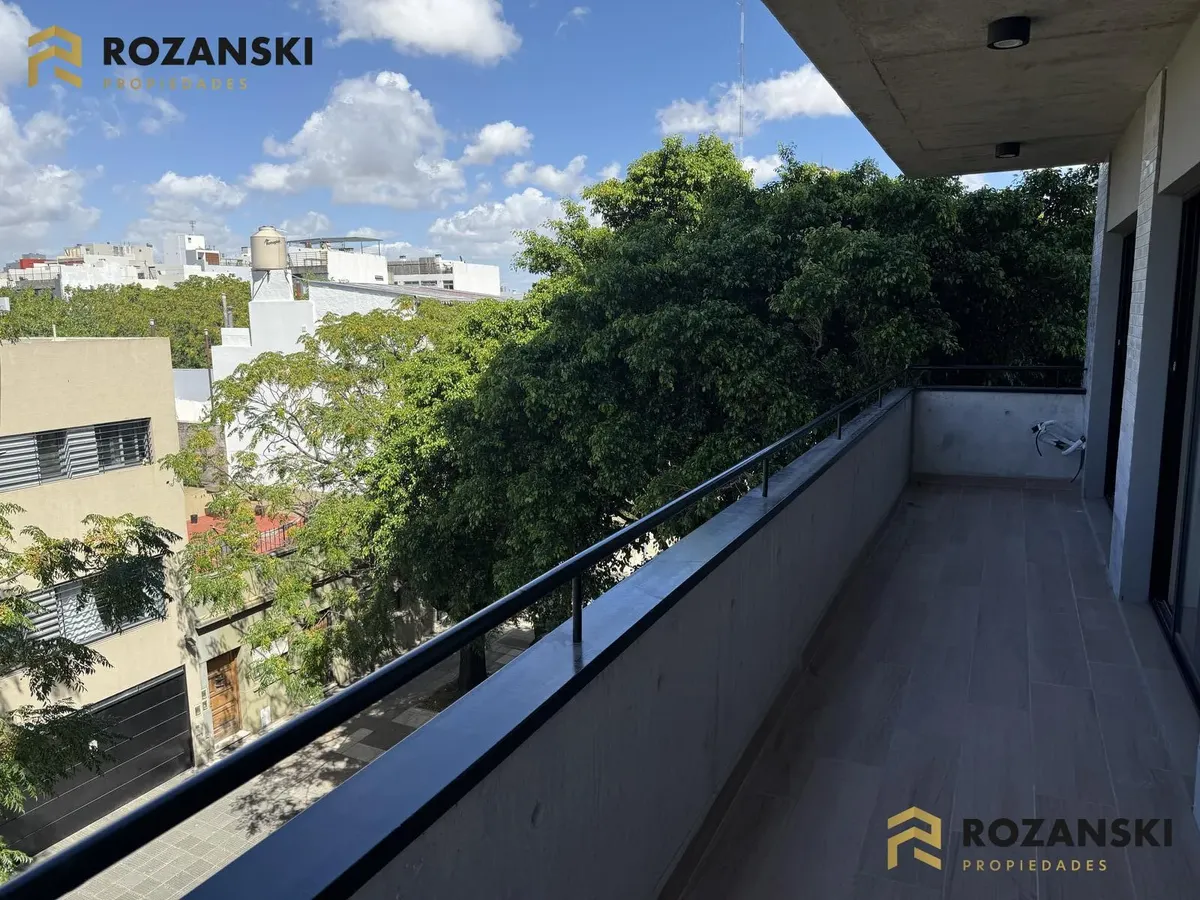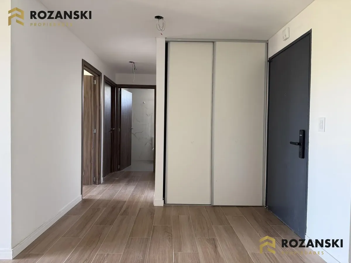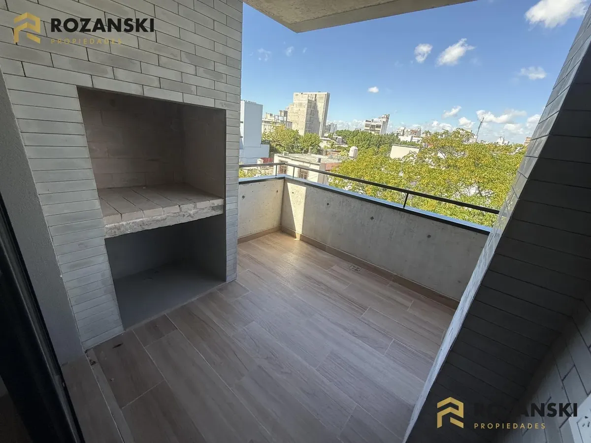 Departamento de 3 ambientes al frente, 3er piso, a estrenar, con balcón terraza y parrilla privada. Incluye cochera. Tiene cocina con muebles sobre y bajo mesada, termotanque individual eléctrico y cocina eléctrica, además de splits frío/calor por ambientes. Cuenta con 1 toilette de visitas y 1 baño completo con luz natural, 2 dormitorios con placar de doble hoja y salida a balcón desde living y dormitorios. El edificio dispone de espacio bicicletero.