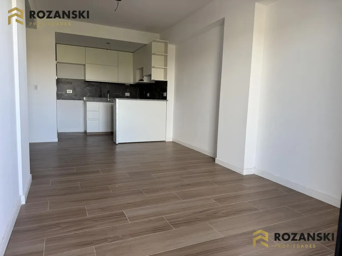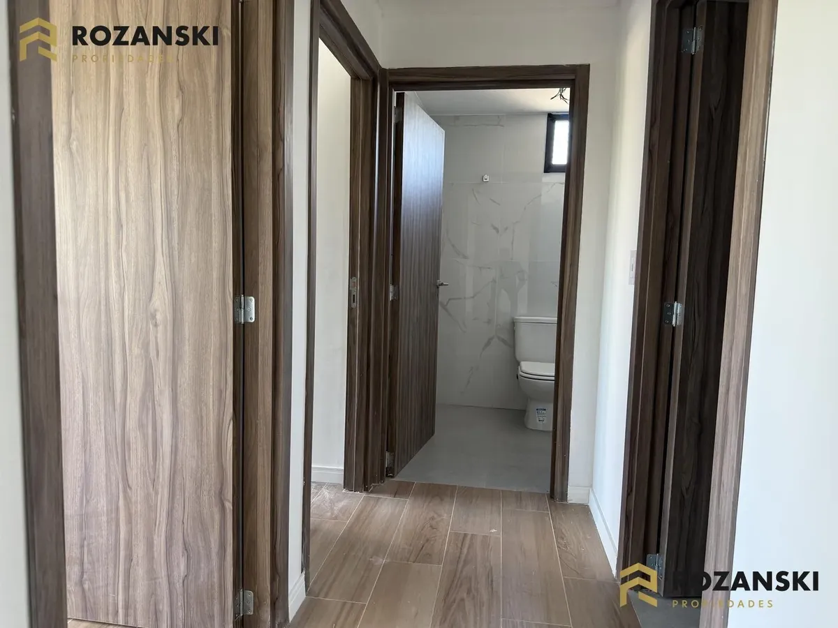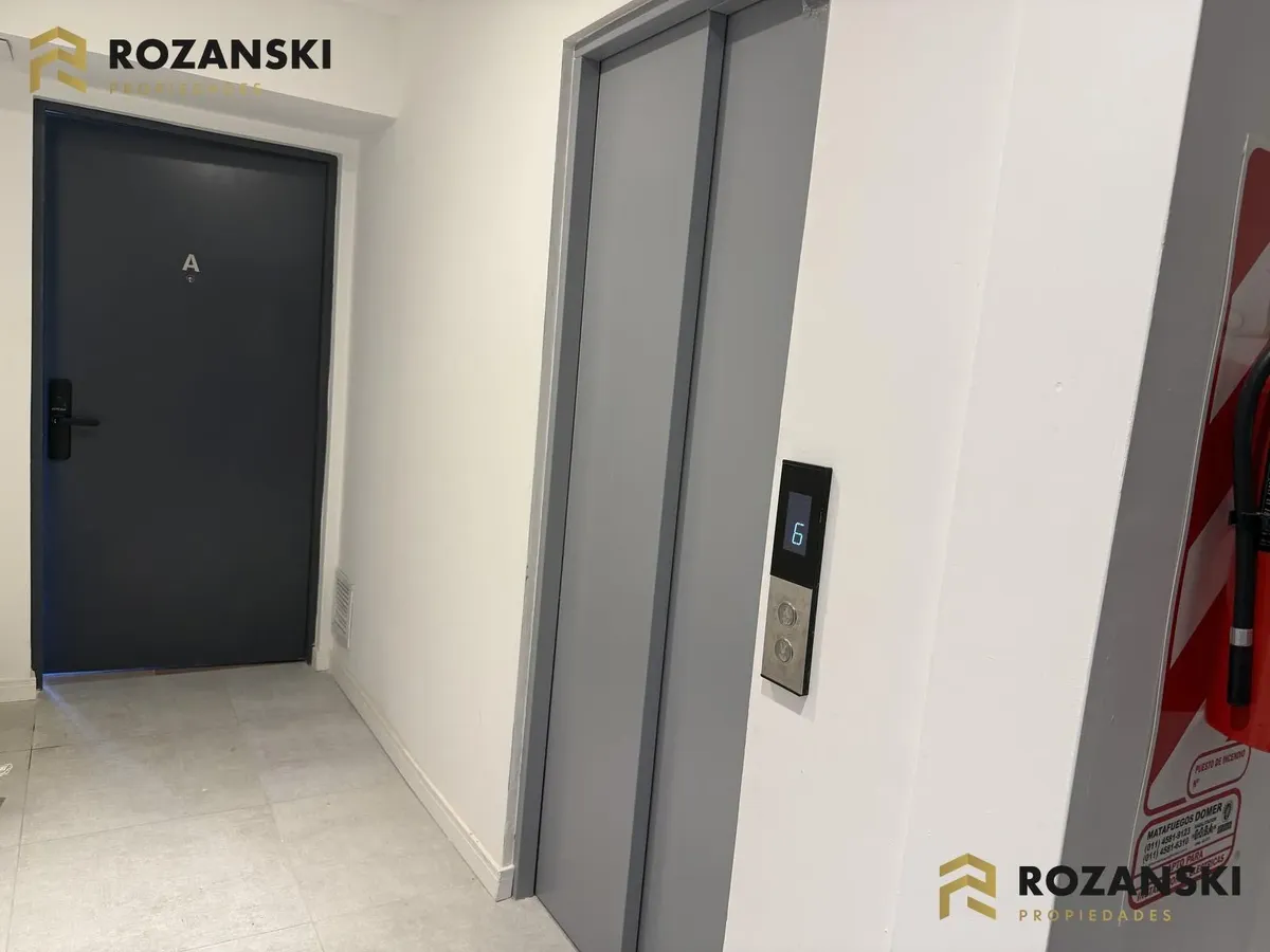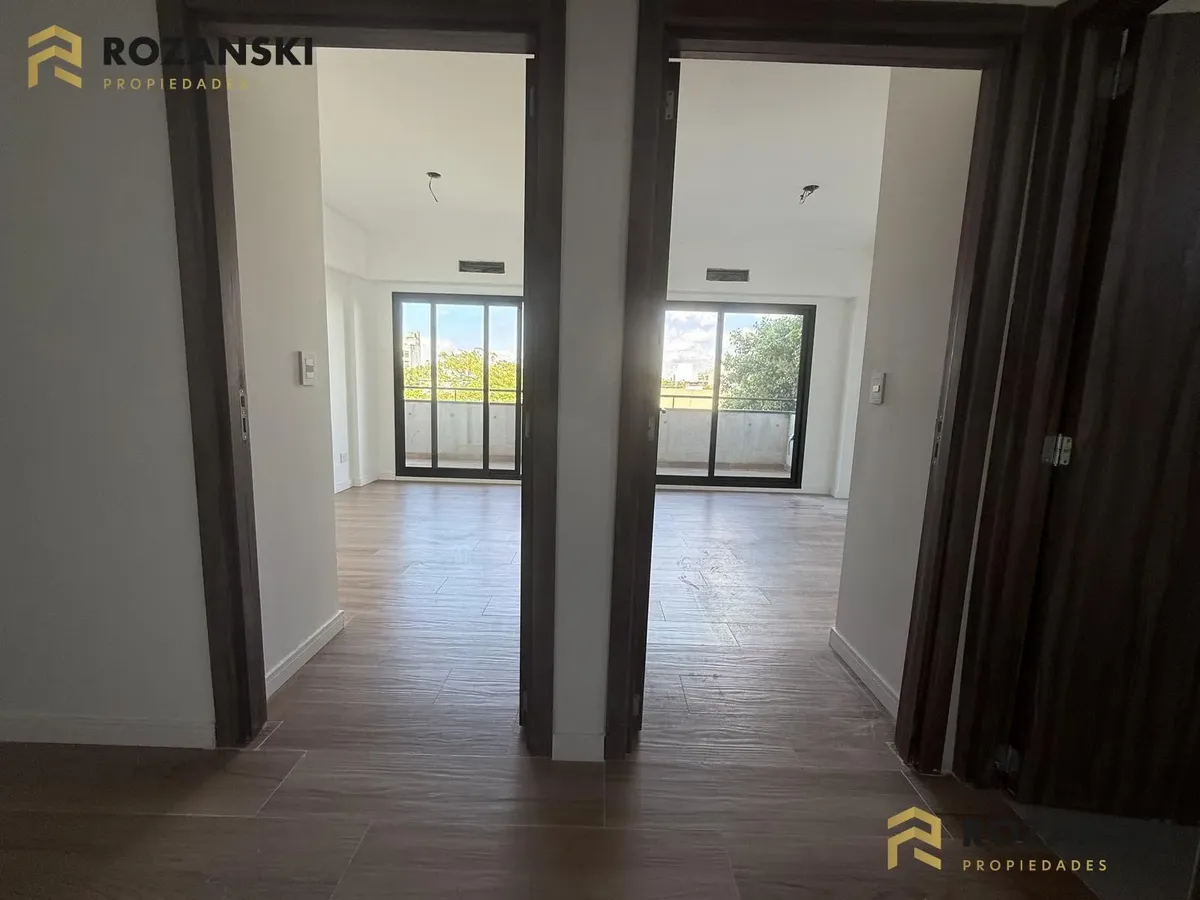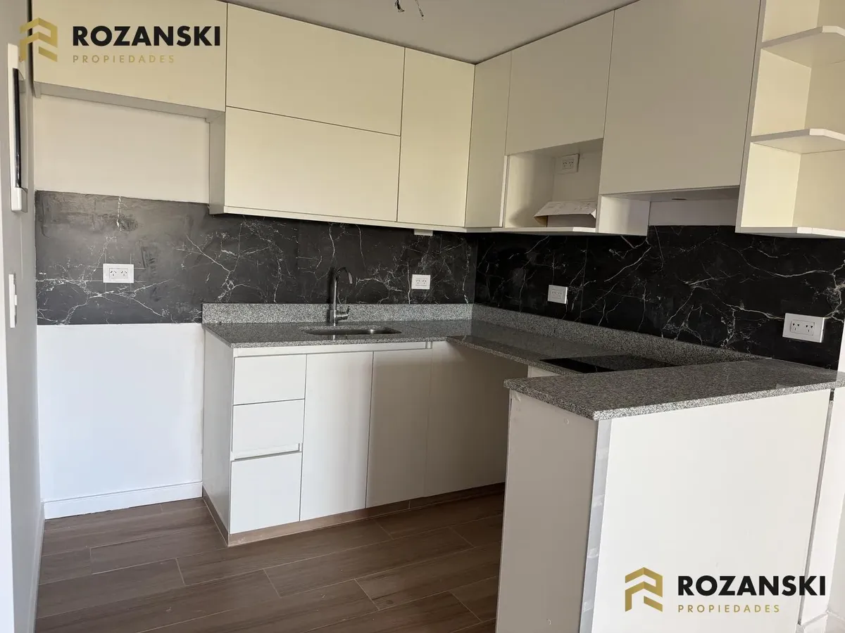Departamento de 3 ambientes al frente, 3er piso, a estrenar, con balcón terraza y parrilla privada. Incluye cochera. Tiene cocina con muebles sobre y bajo mesada, termotanque individual eléctrico y cocina eléctrica, además de splits frío/calor por ambientes. Cuenta con 1 toilette de visitas y 1 baño completo con luz natural, 2 dormitorios con placar de doble hoja y salida a balcón desde living y dormitorios. El edificio dispone de espacio bicicletero.