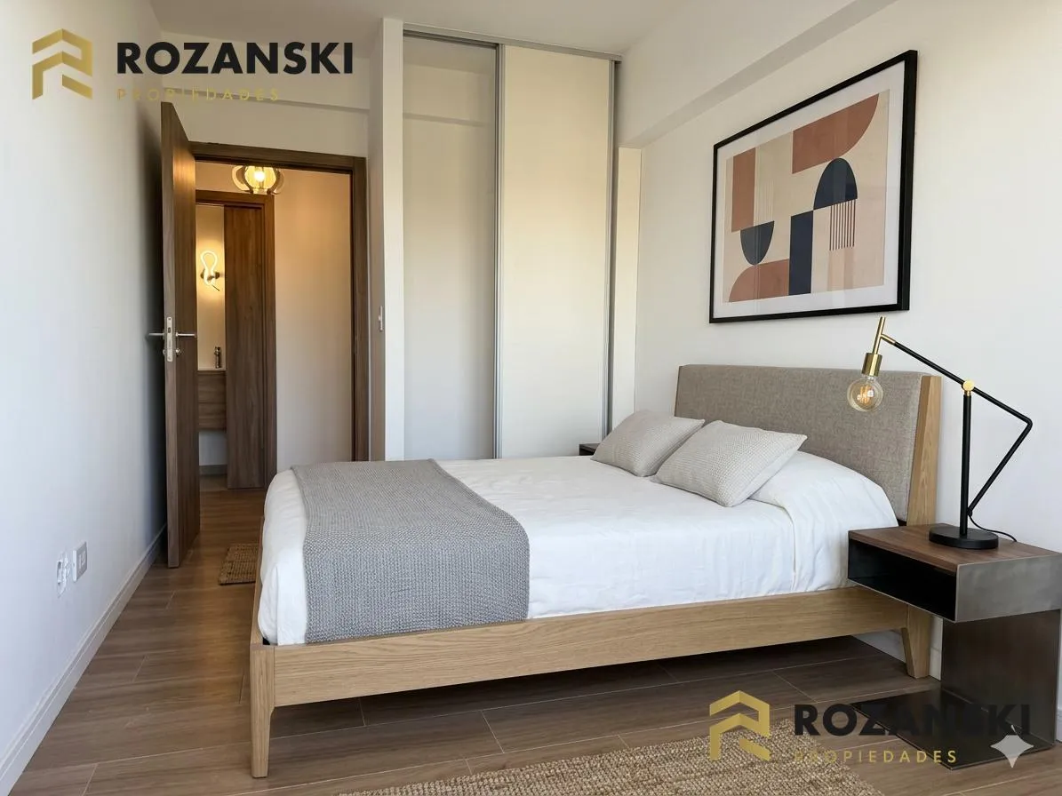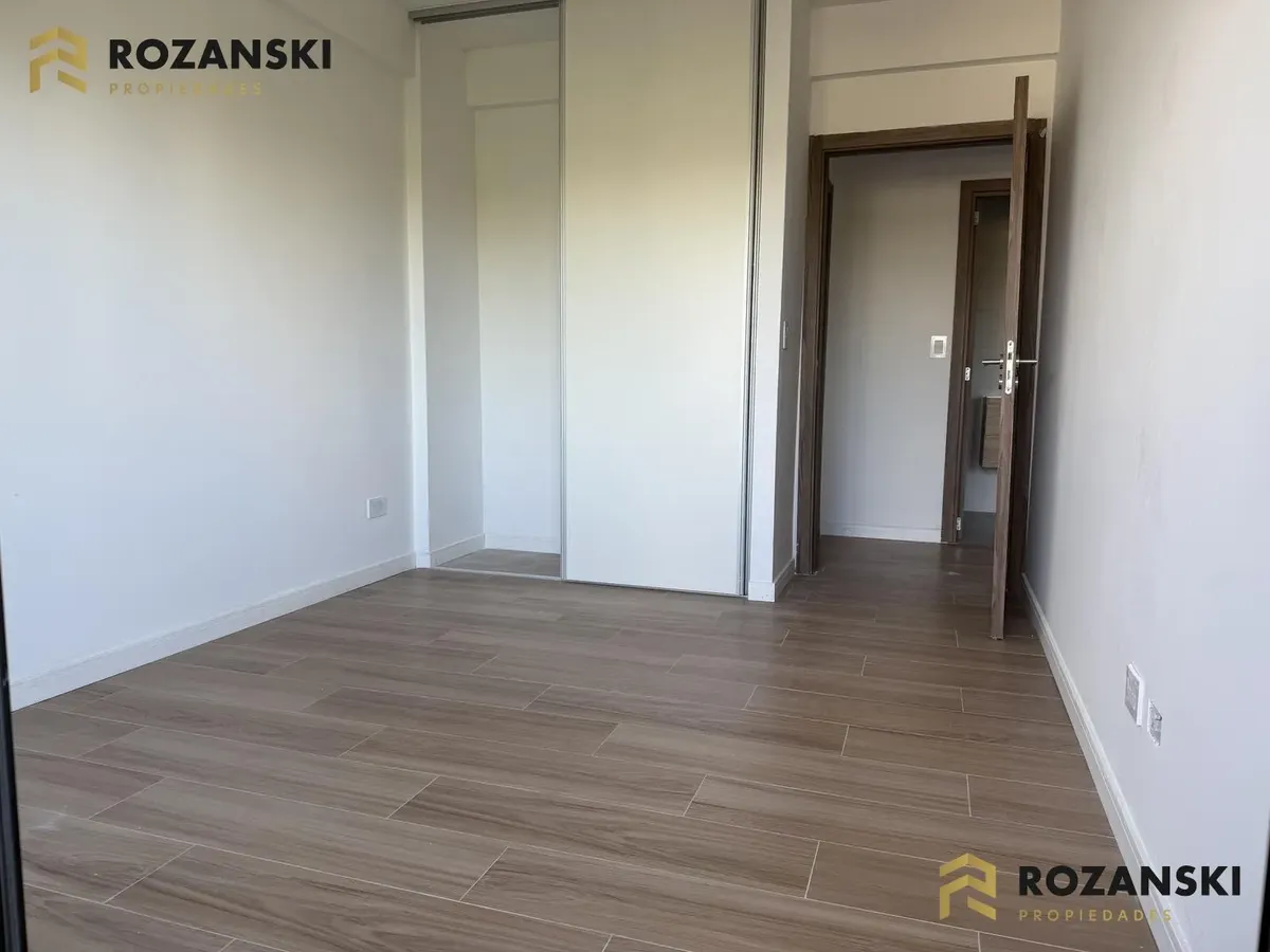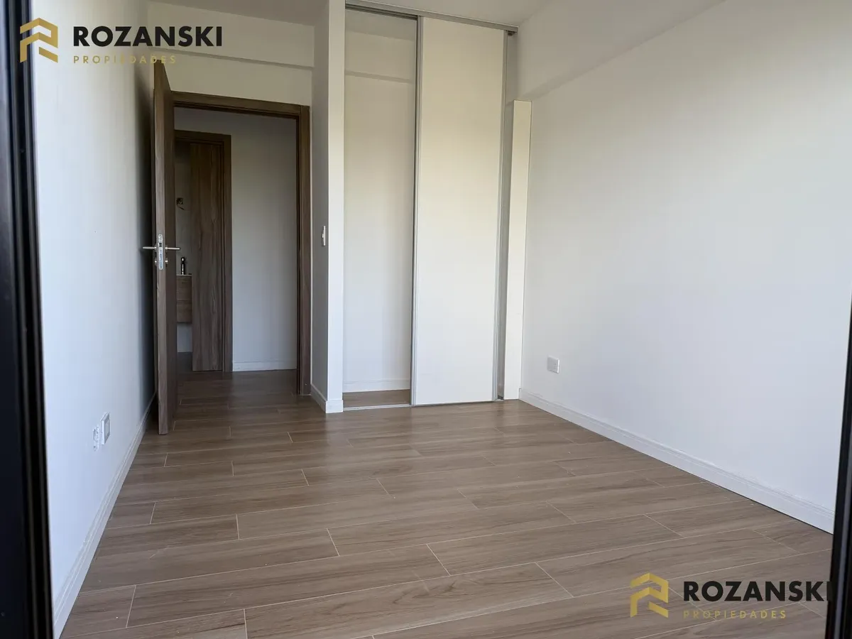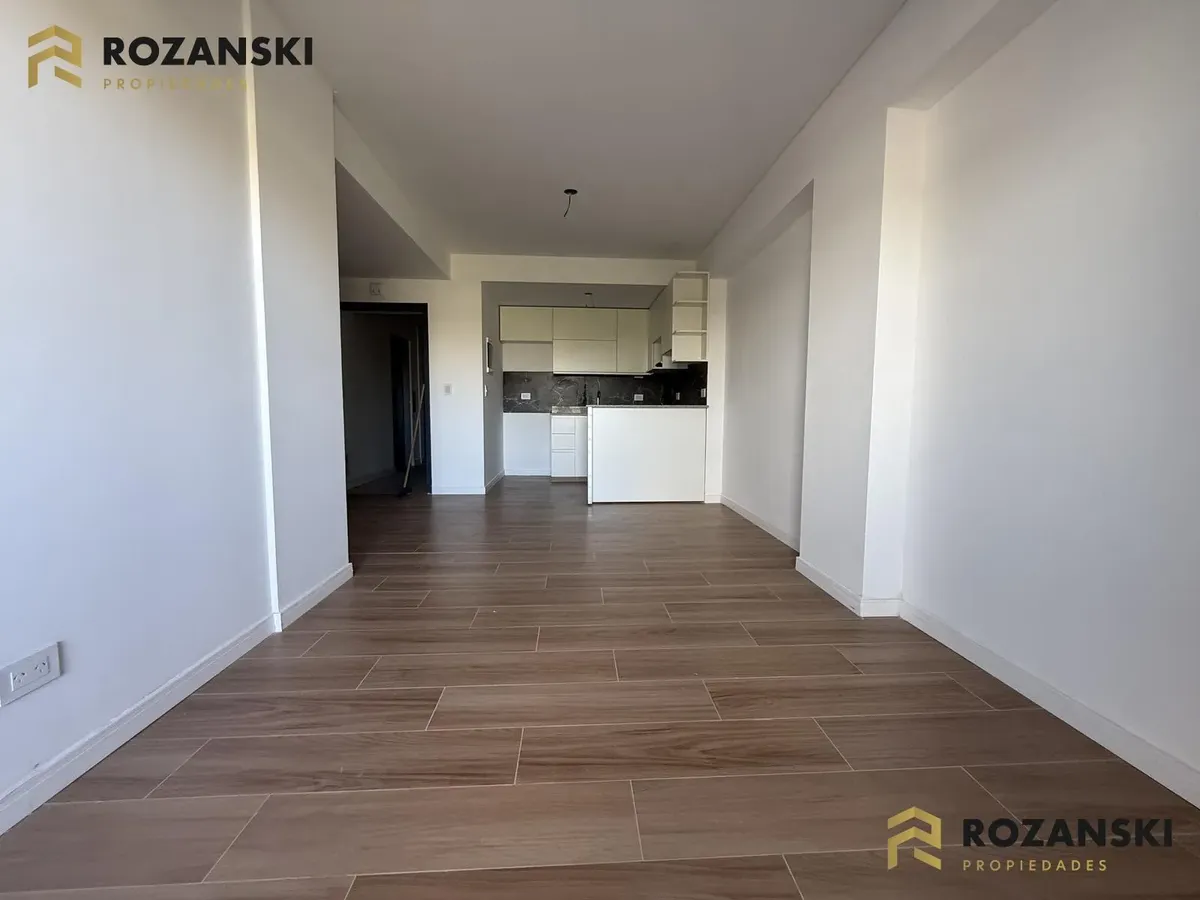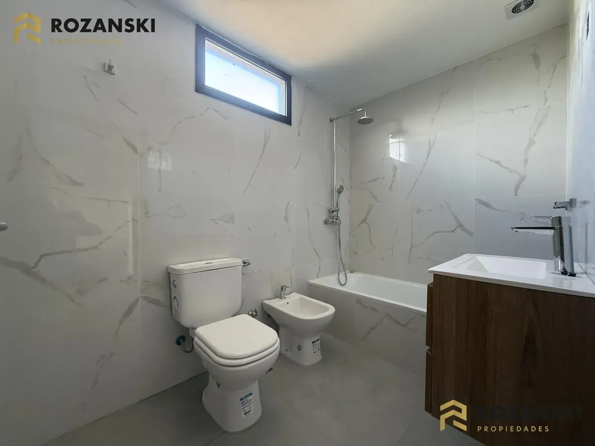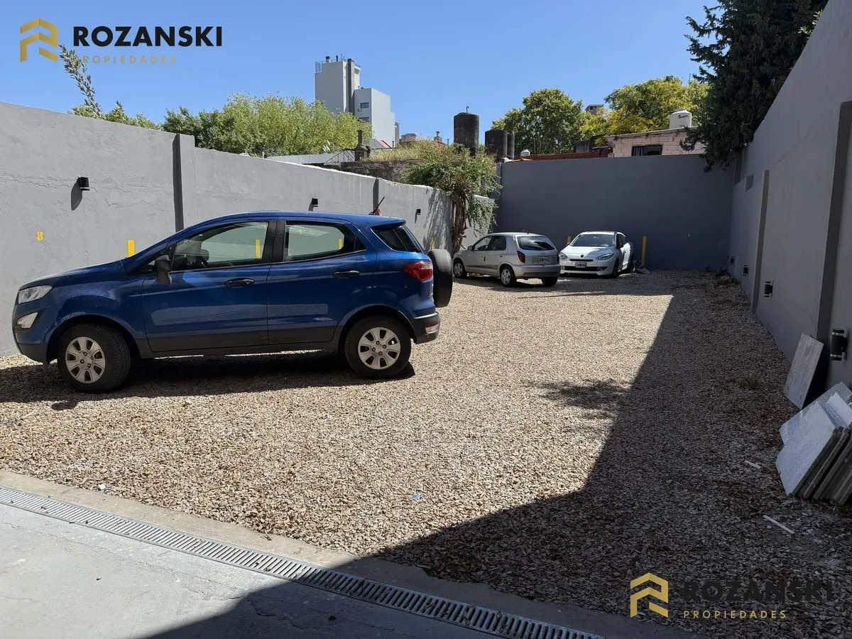 Departamento de 3 ambientes al frente, 3er piso, a estrenar, con balcón terraza y parrilla privada. Incluye cochera. Tiene cocina con muebles sobre y bajo mesada, termotanque individual eléctrico y cocina eléctrica, además de splits frío/calor por ambientes. Cuenta con 1 toilette de visitas y 1 baño completo con luz natural, 2 dormitorios con placar de doble hoja y salida a balcón desde living y dormitorios. El edificio dispone de espacio bicicletero.