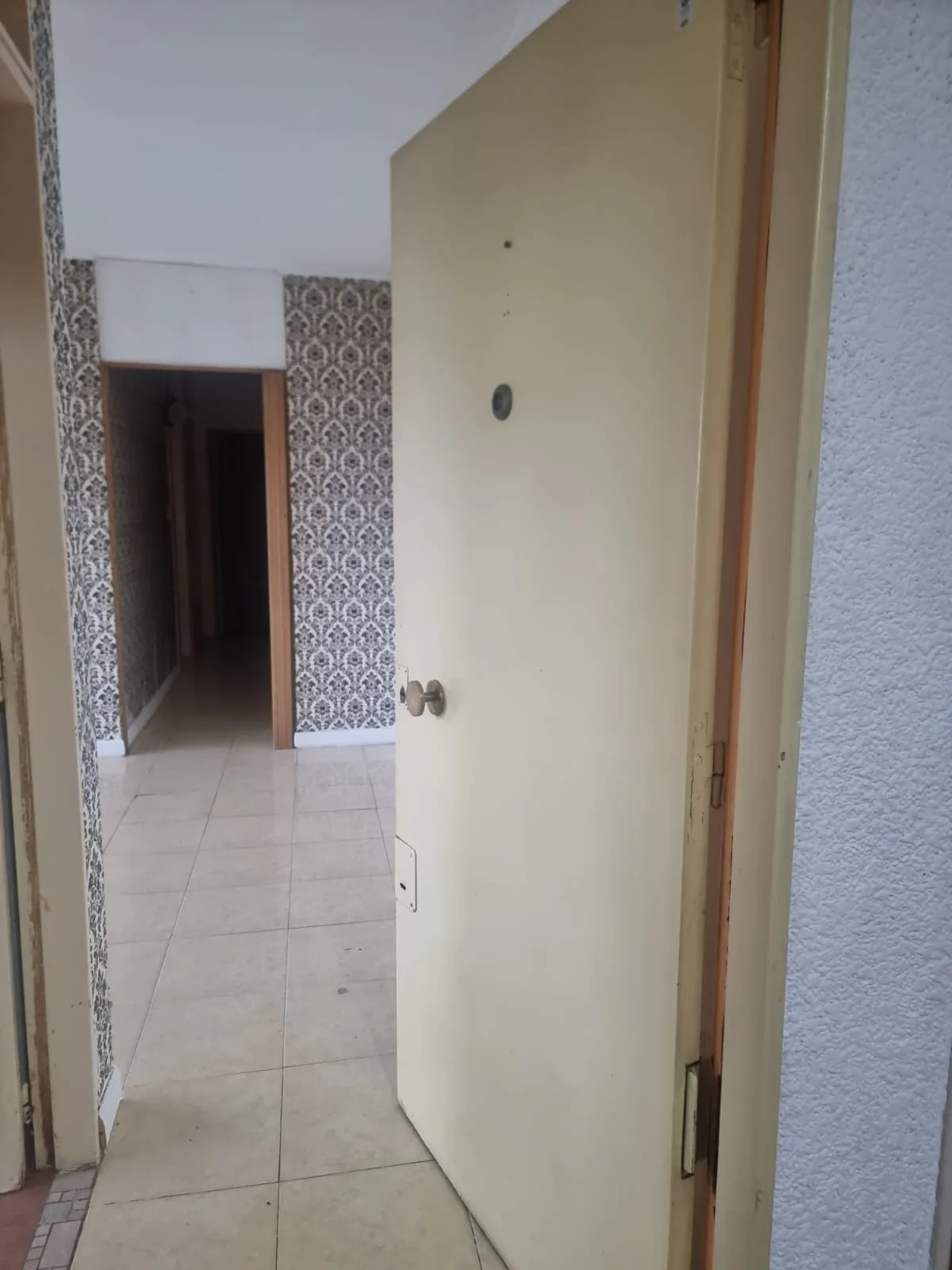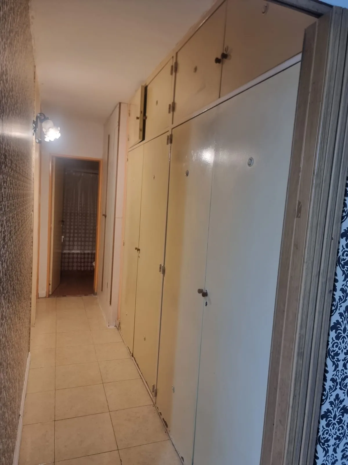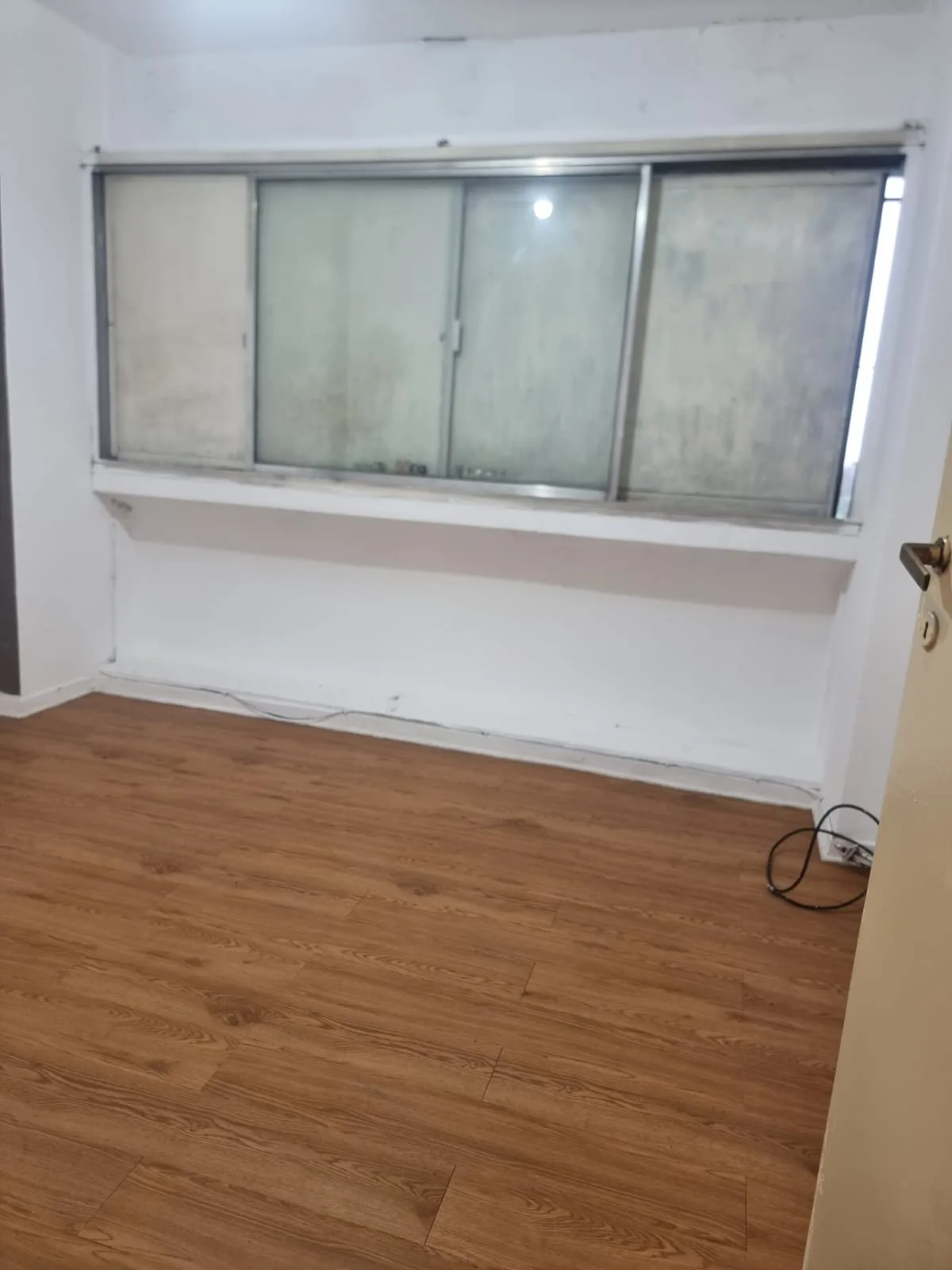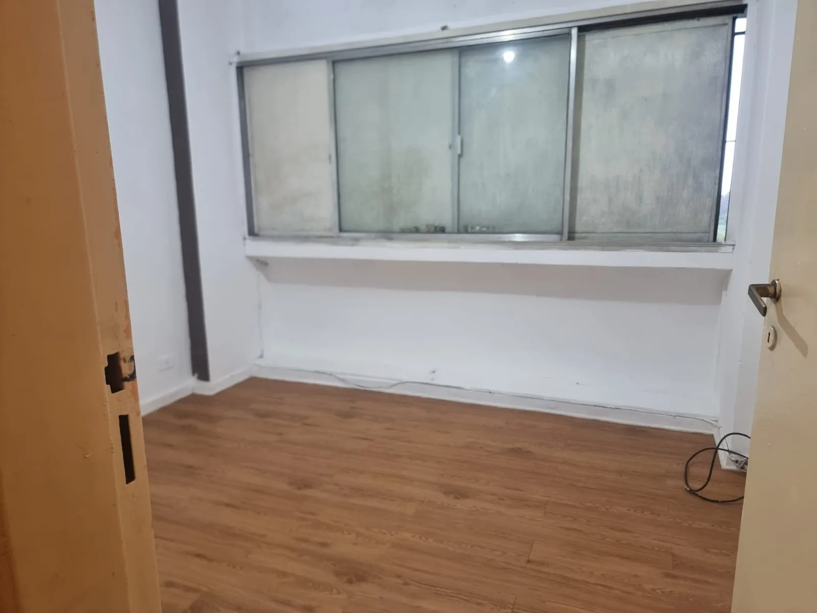 Three-room apartment in the building 142. The unit has a living-dining area with ceramic flooring and a kitchen with lower cabinets and overhead storage, plus space for a washing machine. A hallway with a wardrobe leads to two bedrooms, one with flexiplast flooring and the other with floating wood laminate. There is a full bathroom with ceramic floors and tiled walls. Rent increases every 3 months by IPC. Requirements include a property-owning guarantor in Capital Federal, one month in advance,