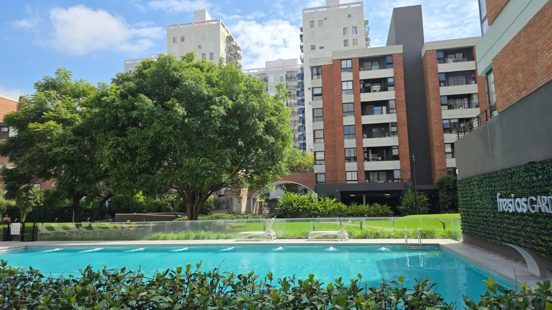 Departamento de 3 ambientes en alquiler en el complejo Las Fresias Garden, en Villa Santa Rita, sobre Av. Remedios Escalada de San Martín 2750, CABA. Está en 2º piso lateral, dentro de una torre de 5 pisos, con 63,57 m² totales (58,80 m² cubiertos y 5,07 m² descubiertos). Cuenta con living-comedor, 2 dormitorios (uno en suite con vestidor), 2 baños completos, y balcón aterrazado con parrilla. Tiene aire acondicionado y expensas que incluyen el agua. El complejo ofrece seguridad 24 horas, piscina