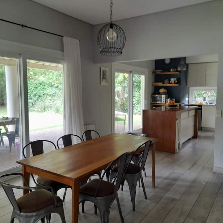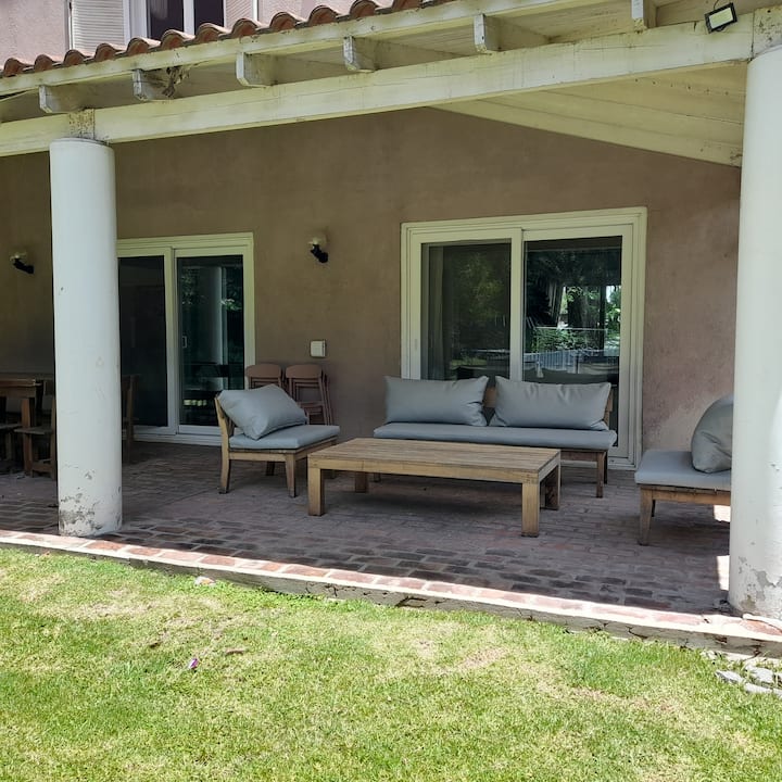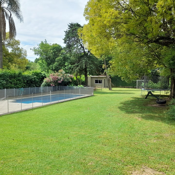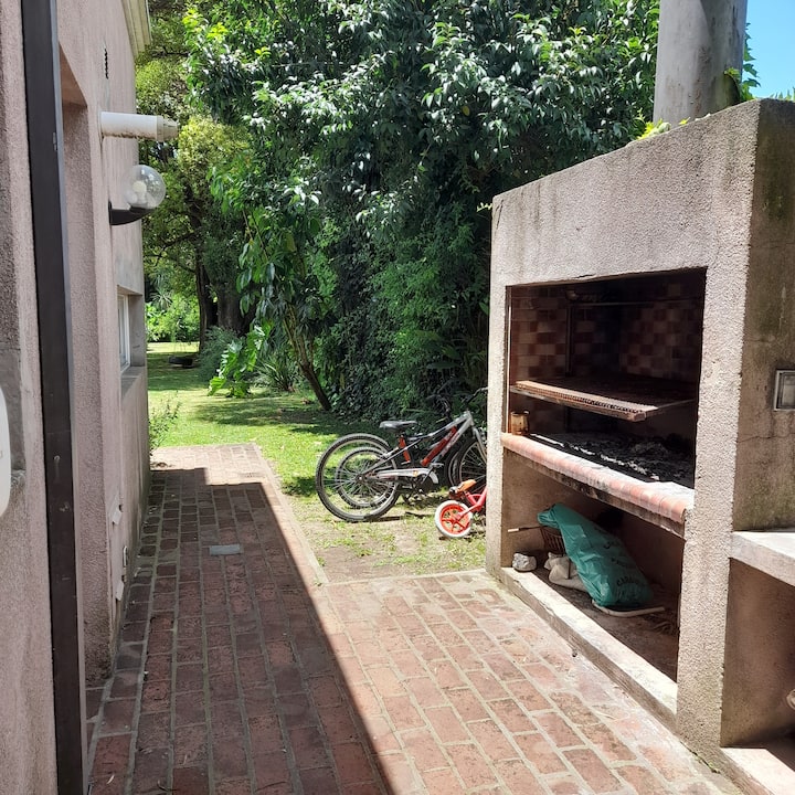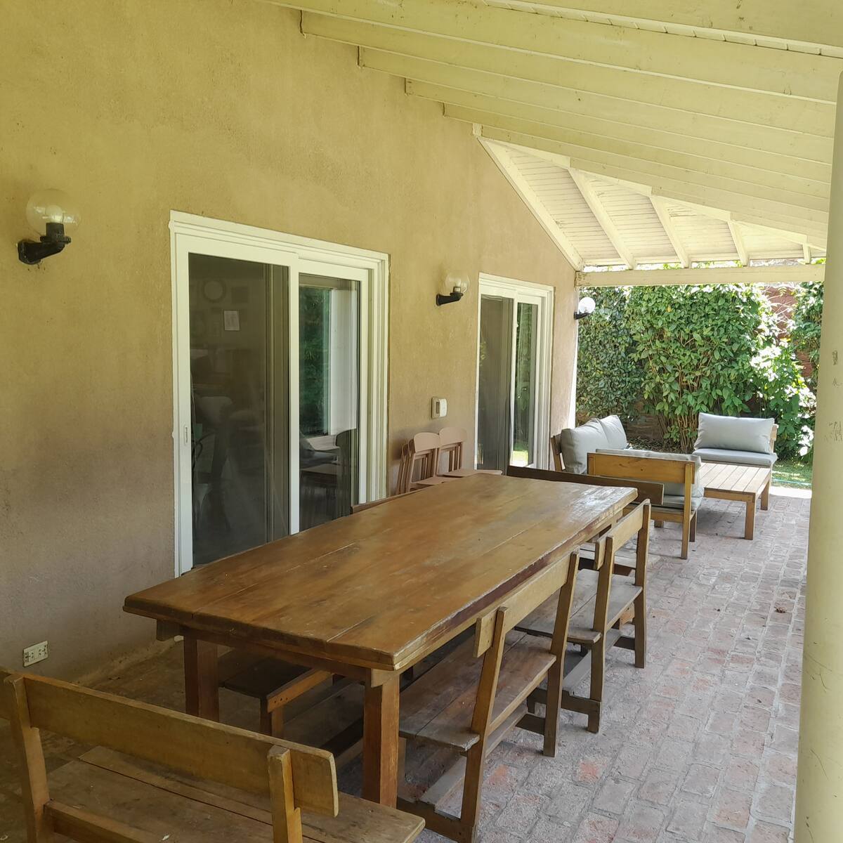 No hay datos sobre m², piso, orientación ni estado de amoblado. La publicación describe una casa con ingreso por el frente para varios autos, zona de cocina con horno, parrilla y galería con mesa para 10. También menciona pileta, trampolín, arco de fútbol y, además, un sector de lavadero que podría acondicionarse, así como una habitación con cuna que puede funcionar como cuna o cama.