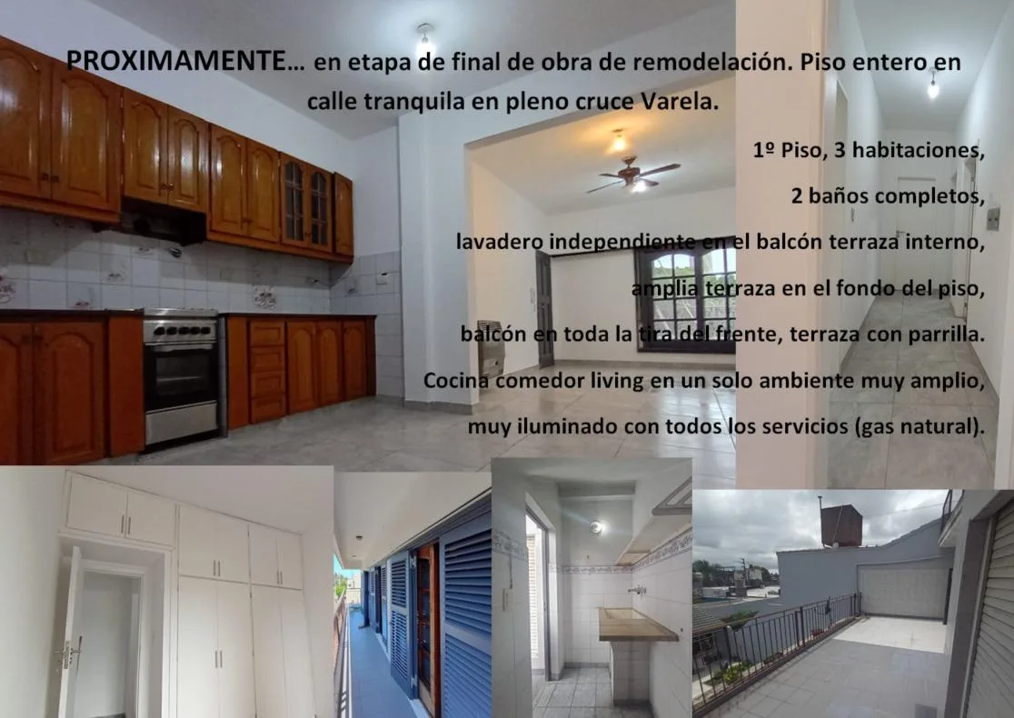 Piso renovado con 3 habitaciones o 2 habitaciones con placares empotrados, más 1 oficina. Cuenta con 2 baños completos, living comedor y una cocina amplia. Balcón al frente a una calle tranquila del Cruce Varela y terraza con parrilla, además de otra terraza que da a un patio interno amplio y privado con lavadero. Tiene gas natural y las remodelaciones se están finalizando, por lo que hay detalles pendientes.