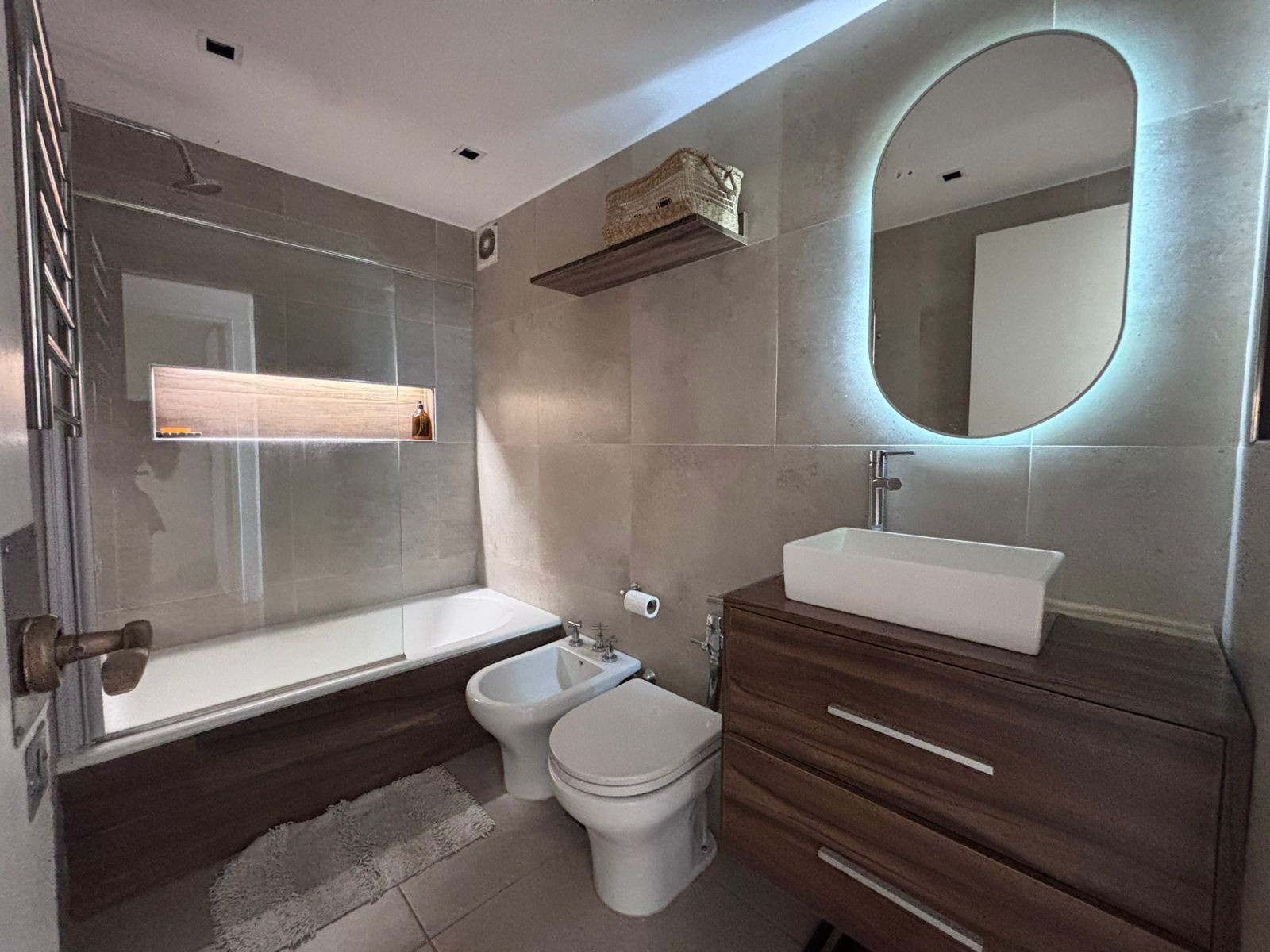 Departamento amoblado en Palermo. Cuenta con 3 dormitorios y un toilette, con placard nuevos en todos los dormitorios y el 3er dormitorio dispuesto como escritorio. Incluye balcón aterrazado de 20 m² con parrilla, cocina amplia con mesa y sillas y cocina completamente equipada, baño refaccionado y calefacción central. Se ubica sobre Av. Santa Fe 3400 y se entrega amoblado.