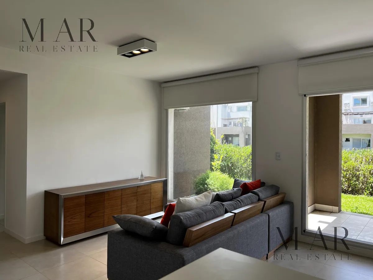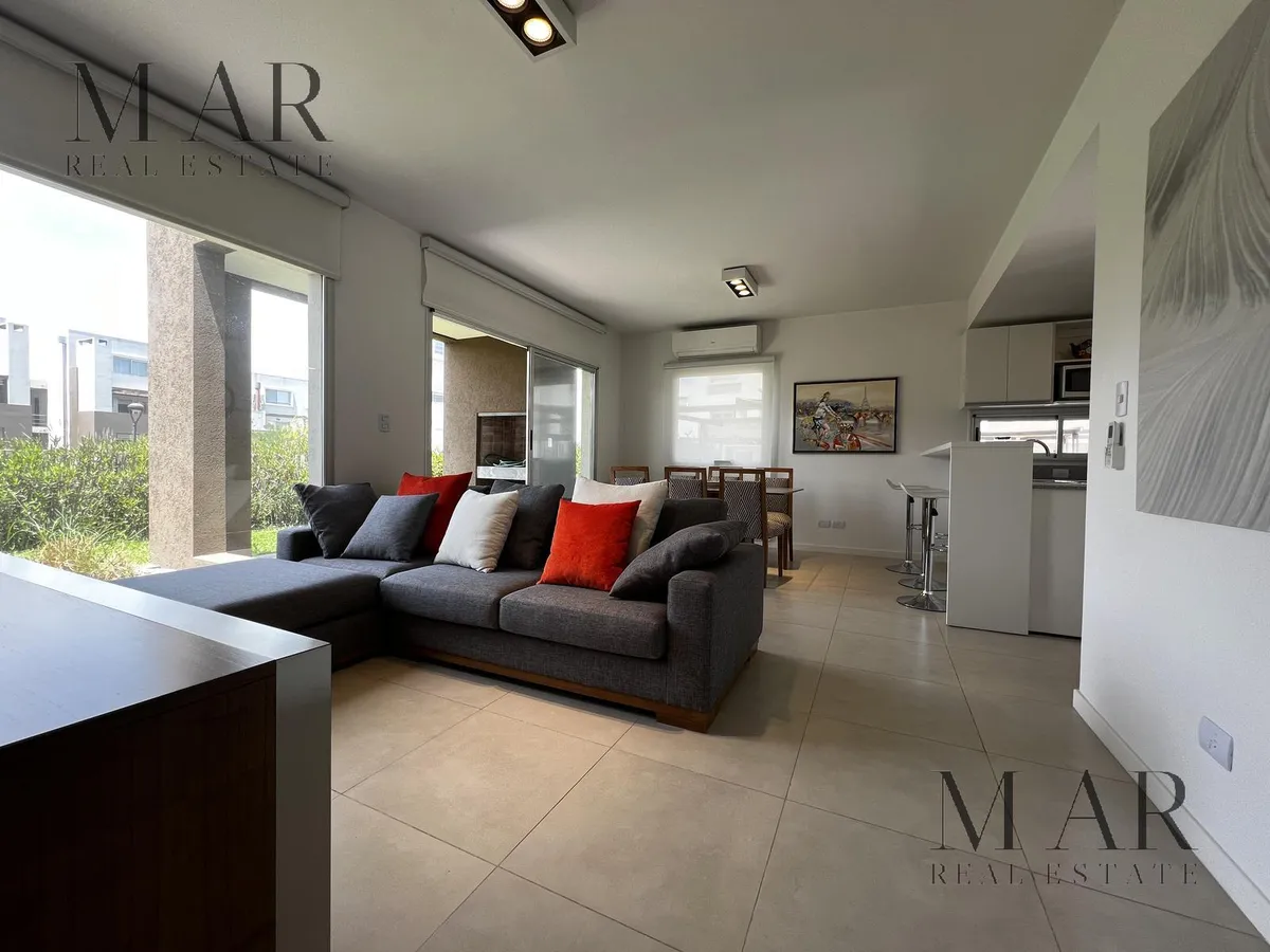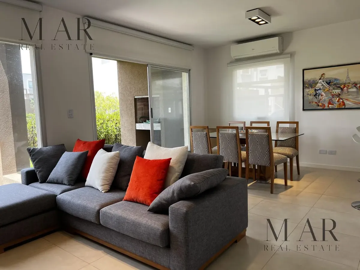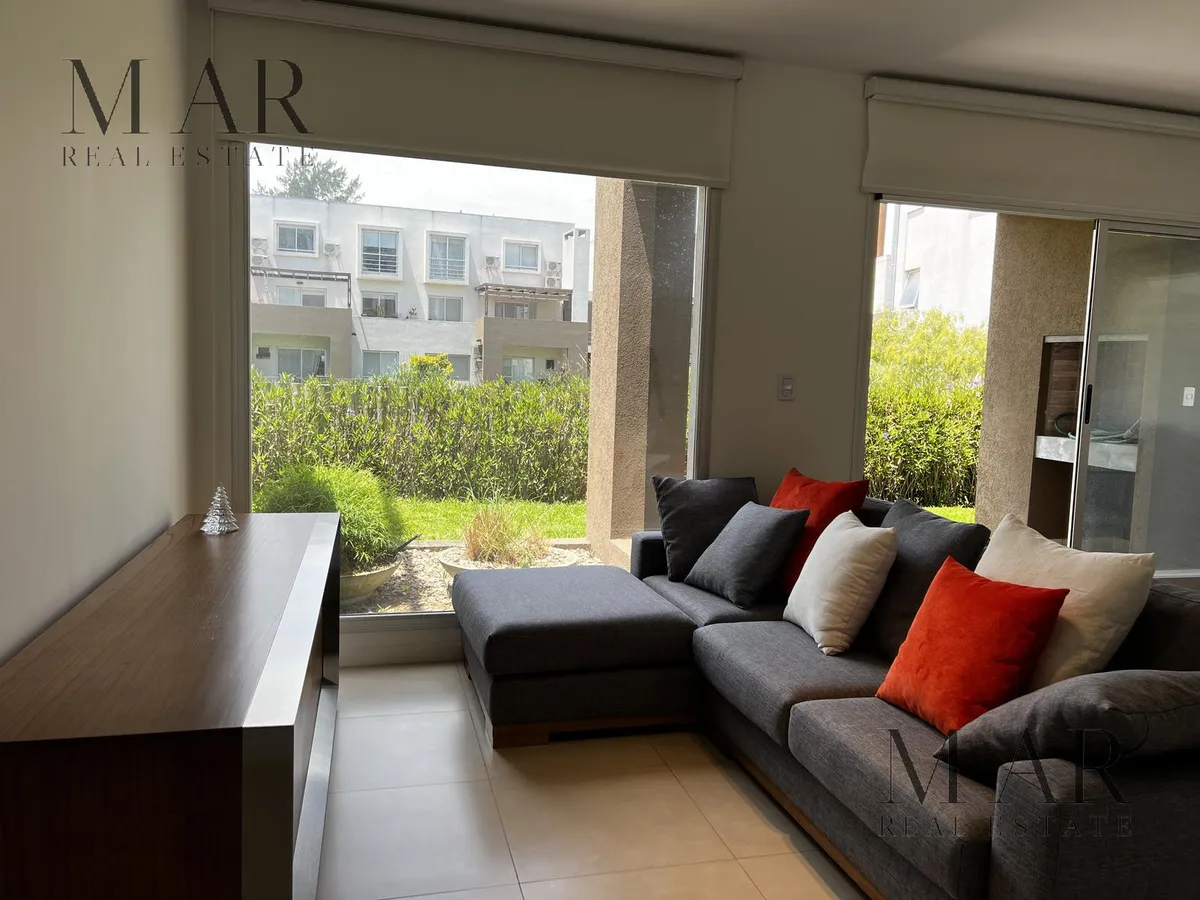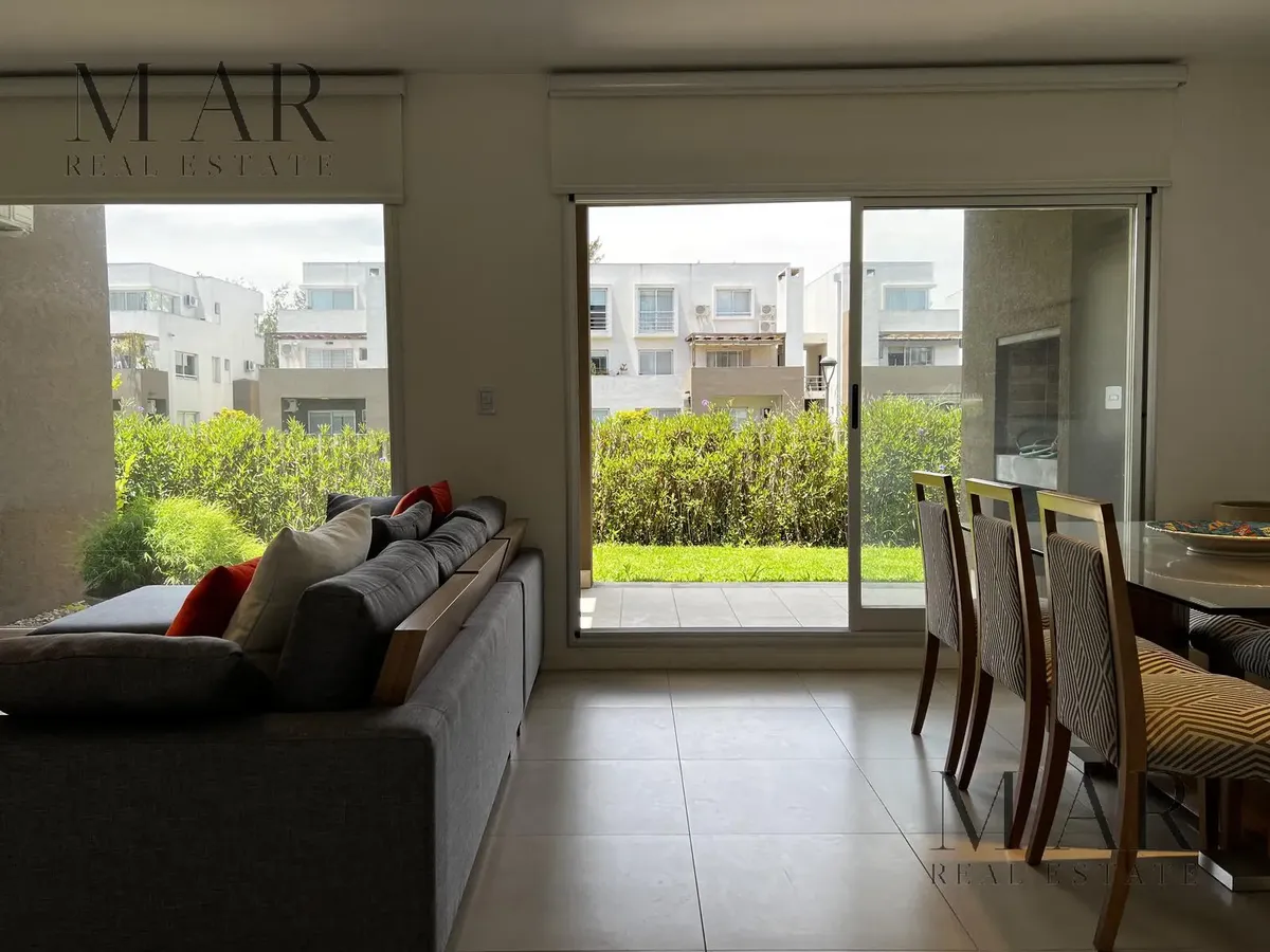 Departamento de 4 ambientes con jardín en Los Senderos, Nordelta, Tigre. Incluye cortinas, luces y aires acondicionados en todos los ambientes. Cuenta con living comedor, cocina semi-integrada con barra, lavadero y 1 dormitorio en suite, más 2 dormitorios y 1 baño completo. Tiene galería con parrilla y cochera con pérgola.
