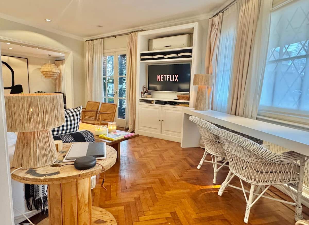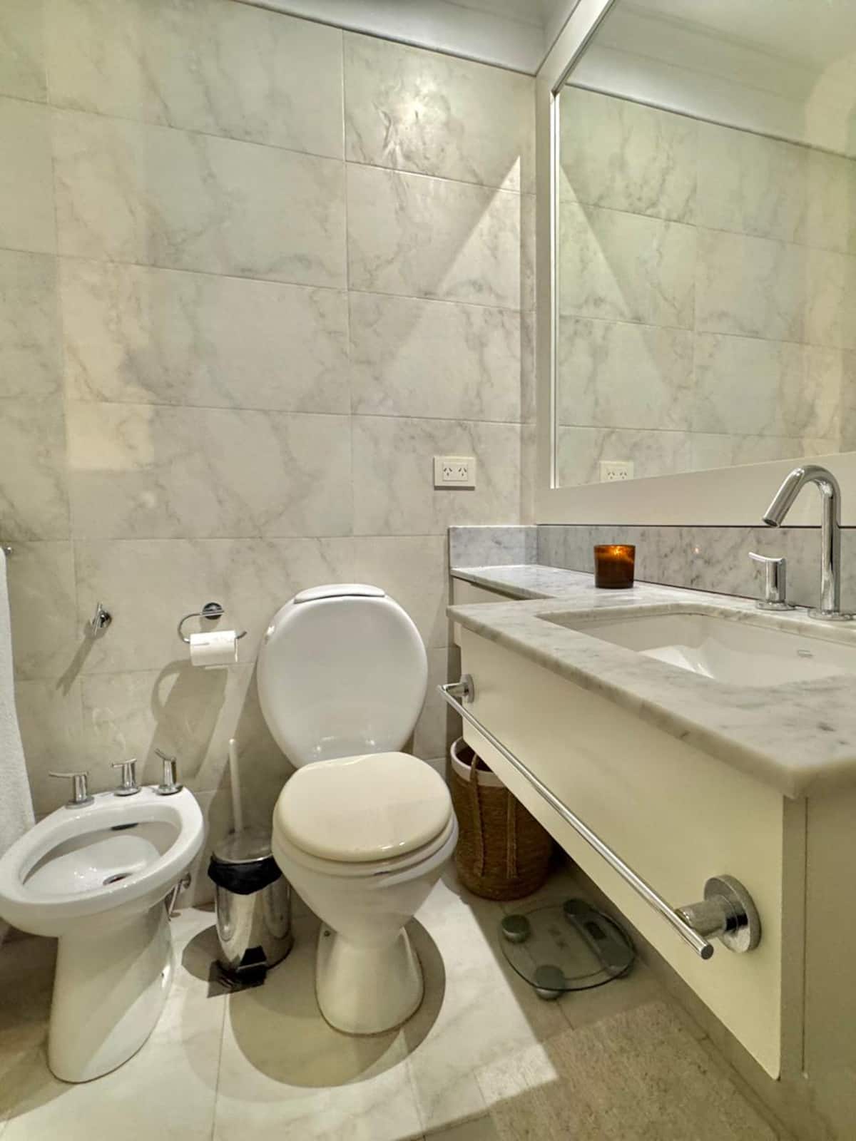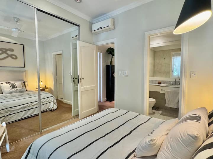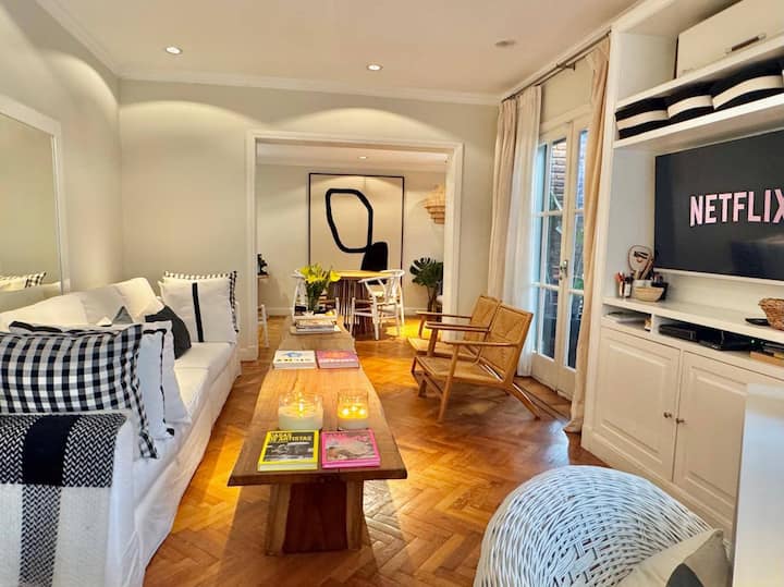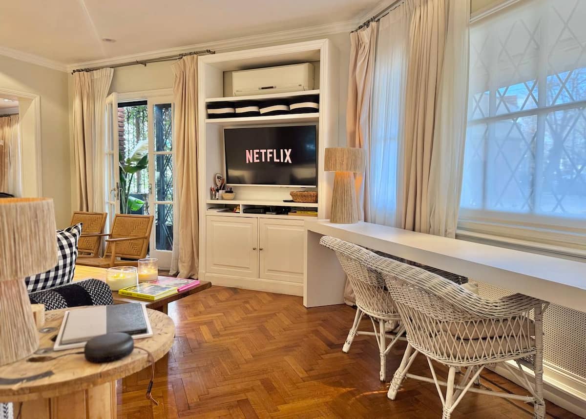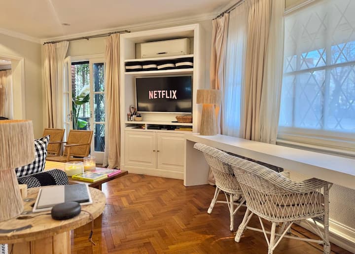 Departamento de 3 dormitorios con acceso independiente desde la calle, en esquina. Incluye 3 suites con baño en suite con ducha y placards empotrados. Cuenta con estar con Smart TV y hogar, comedor separado, cocina equipada con heladera, horno, microondas, lavavajilla y lavarropas, además de patio privado y terraza con parrilla y horno pizzero. Cada dormitorio tiene aire acondicionado frío/calor y calefacción por radiadores con regulación independiente.