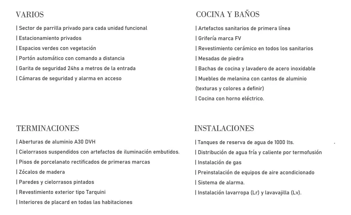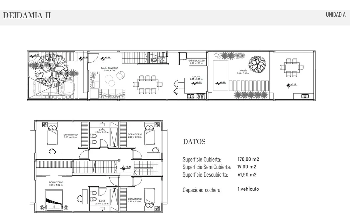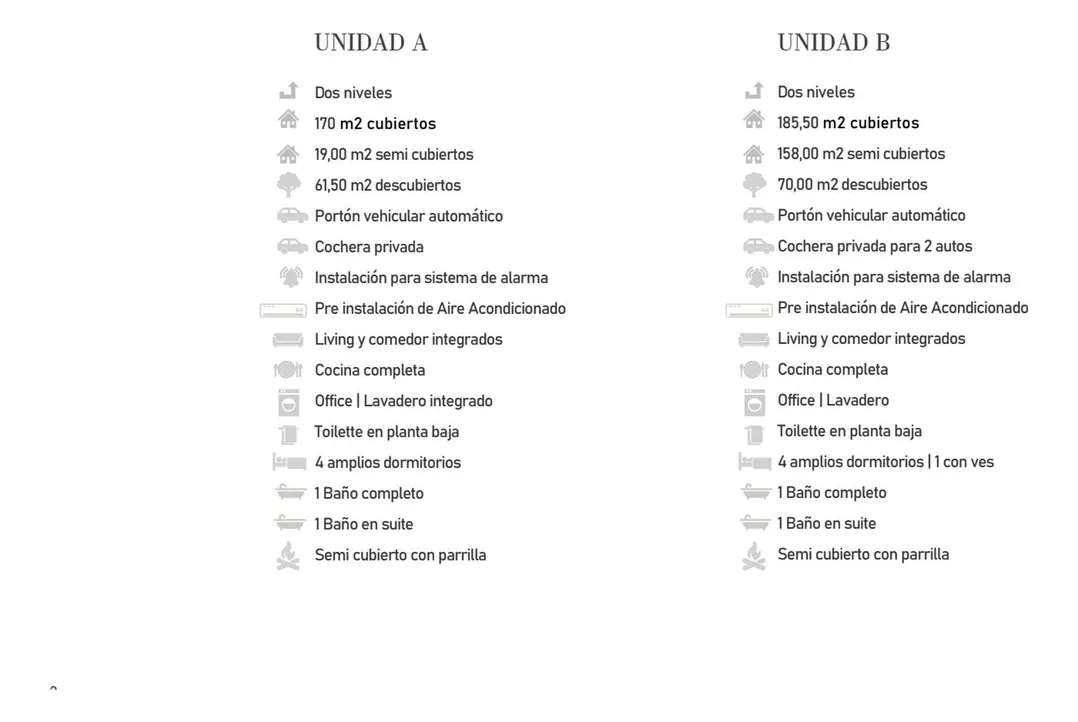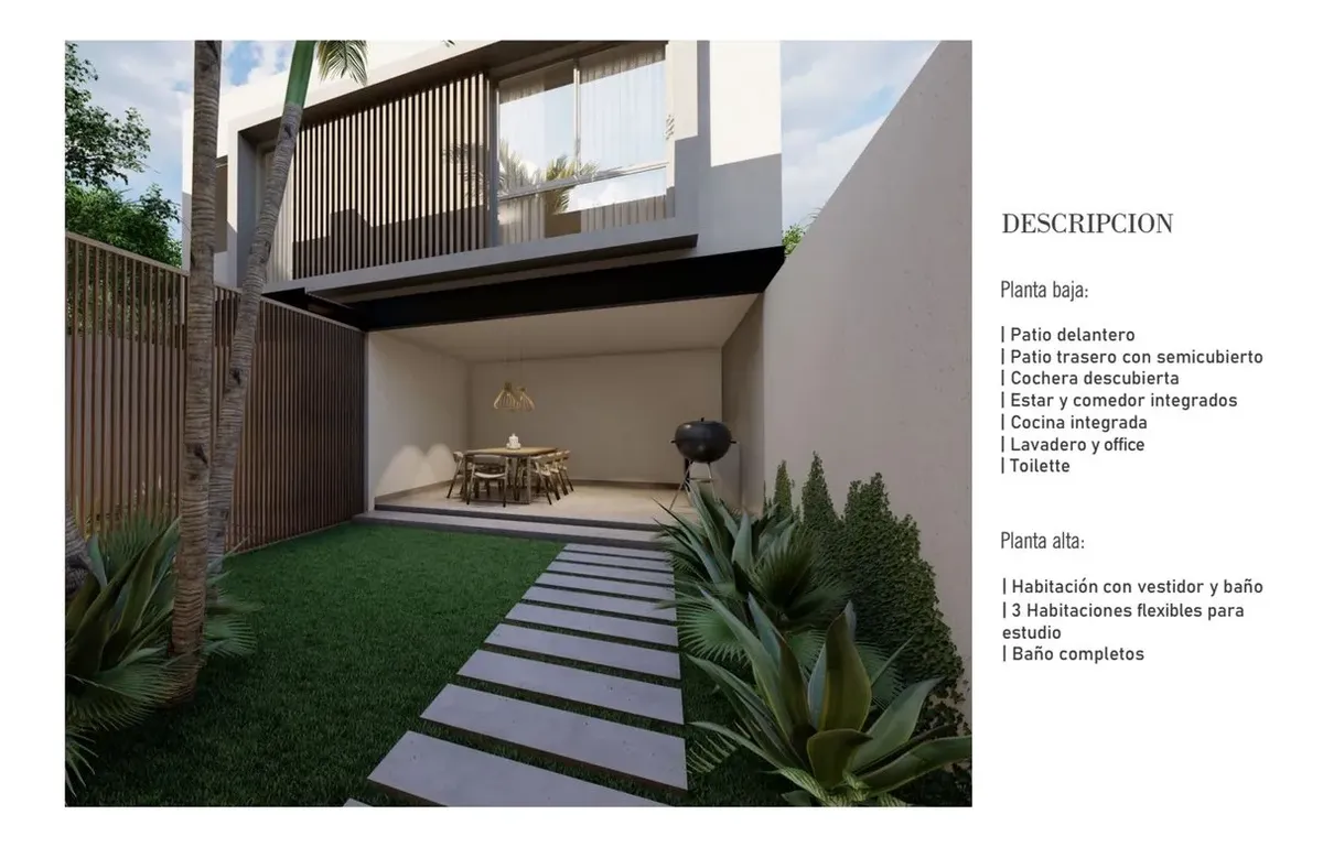 PH tipo casa a estrenar con 4 dormitorios, en 2 niveles, de 170 m² cubiertos. Incluye 19 m² semi cubiertos y 61 m² entre espacio jardín, patio y entrada. Se ingresa por portón vehicular automático con cochera privada. En planta baja cuenta con living comedor integrado, comedor, cocina completa, office con lavadero integrado y un toilette; además, quincho semi cubierto. En planta alta hay 4 dormitorios, uno en suite con baño en suite, y un baño completo. La unidad tiene iluminación en los ambient