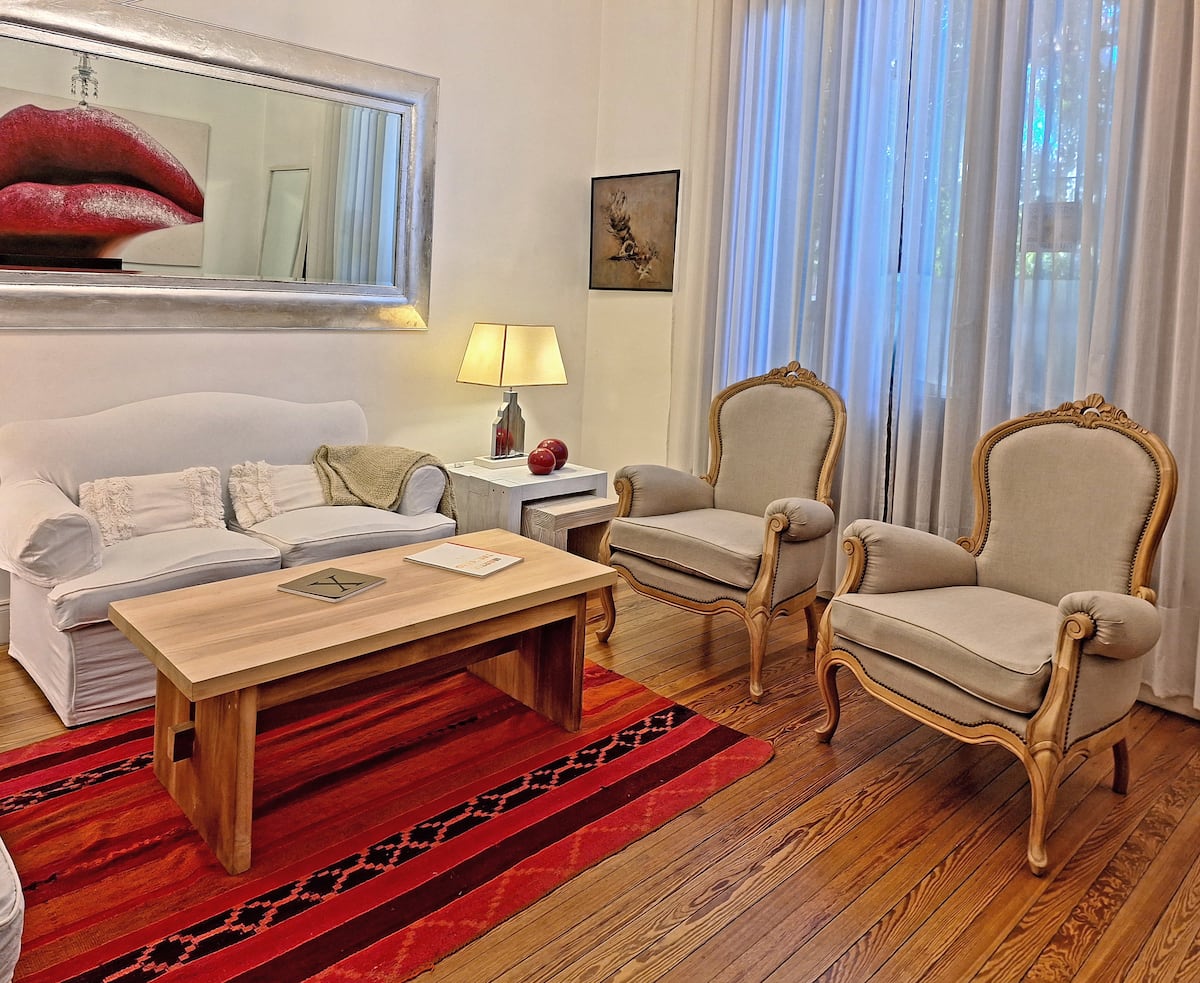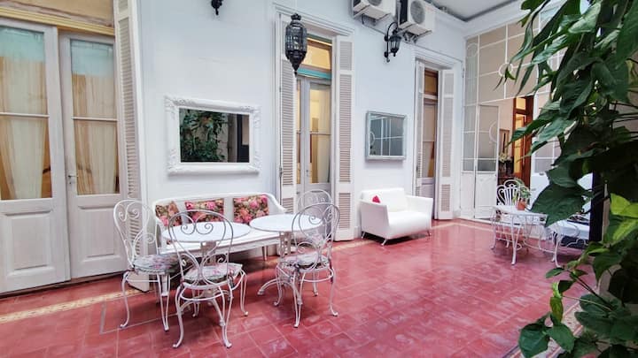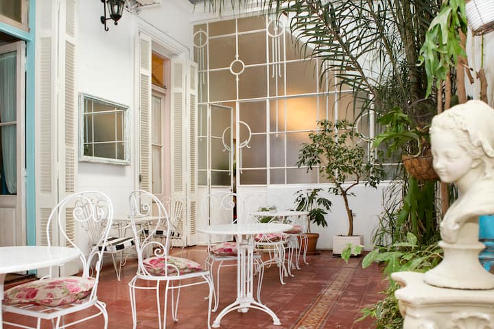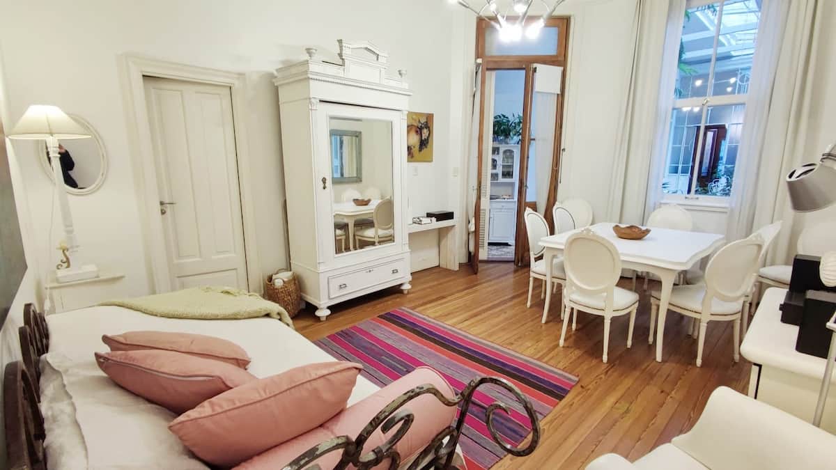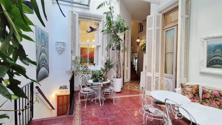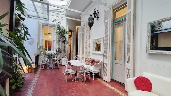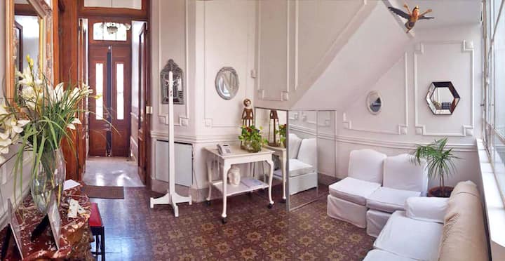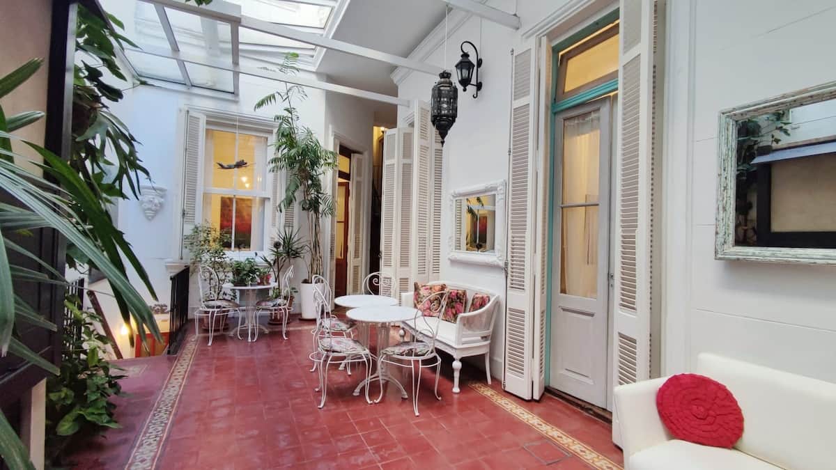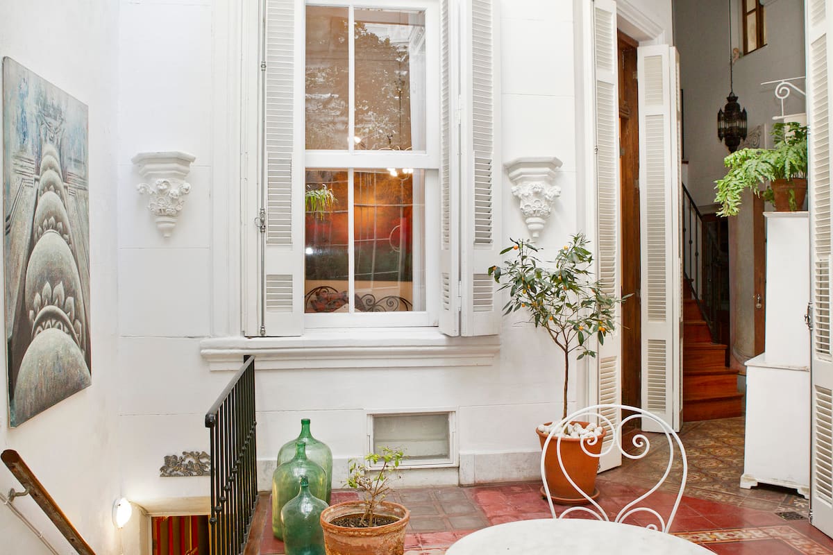 Casa de 4 dormitorios en Colegiales. Construida en 1915, cuenta con 160 m² cubiertos y un área exterior de 40 m², organizada alrededor de un patio central. Dispone de 3 dormitorios con baño en suite y estar con aire acondicionado e internet de alta velocidad (Wi-Fi).