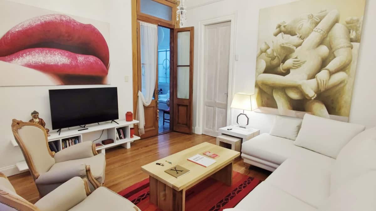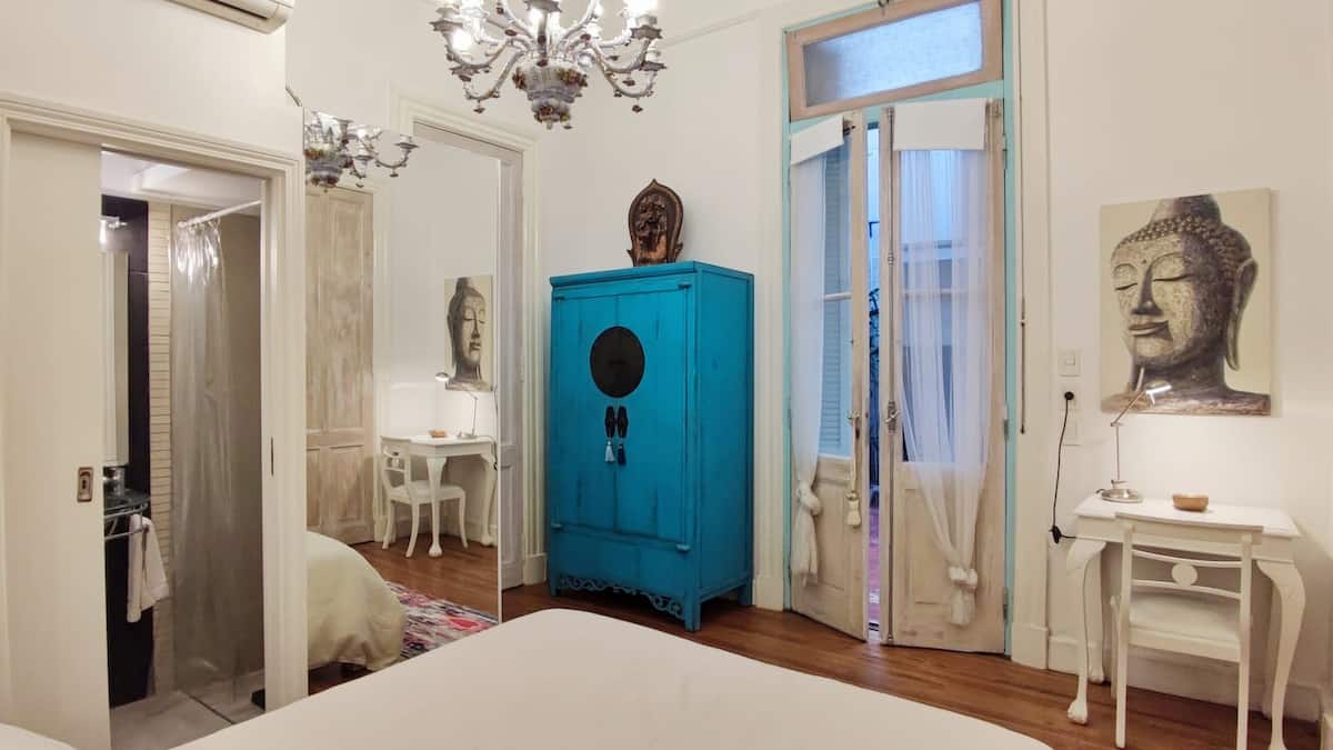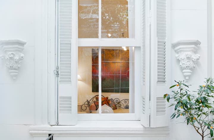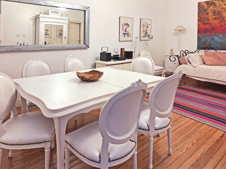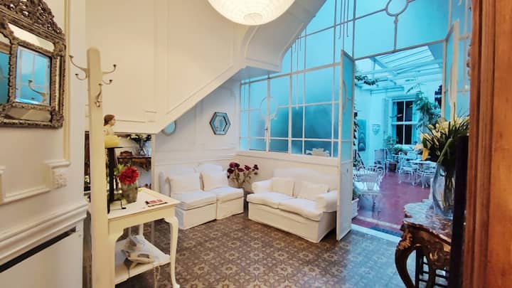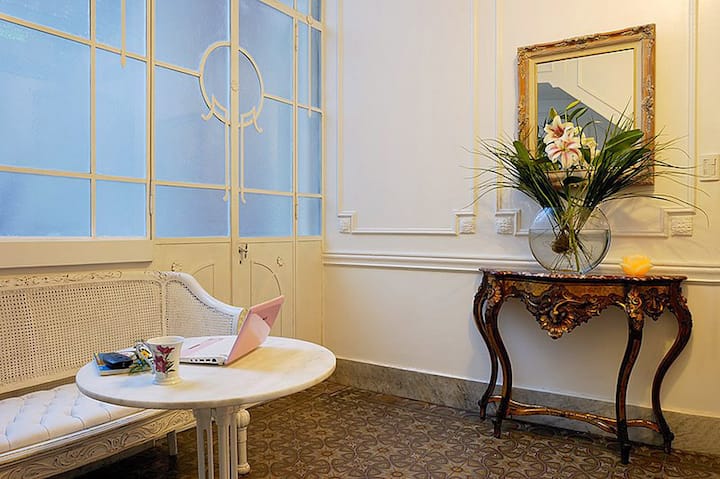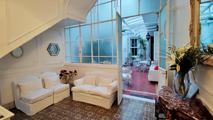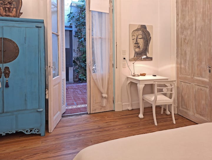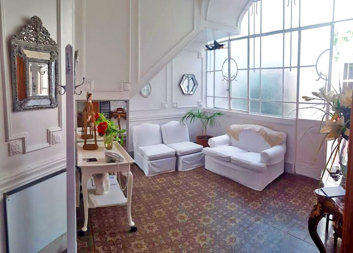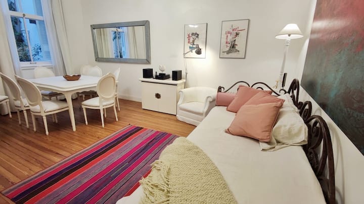 Casa de 4 dormitorios en Colegiales. Construida en 1915, cuenta con 160 m² cubiertos y un área exterior de 40 m², organizada alrededor de un patio central. Dispone de 3 dormitorios con baño en suite y estar con aire acondicionado e internet de alta velocidad (Wi-Fi).