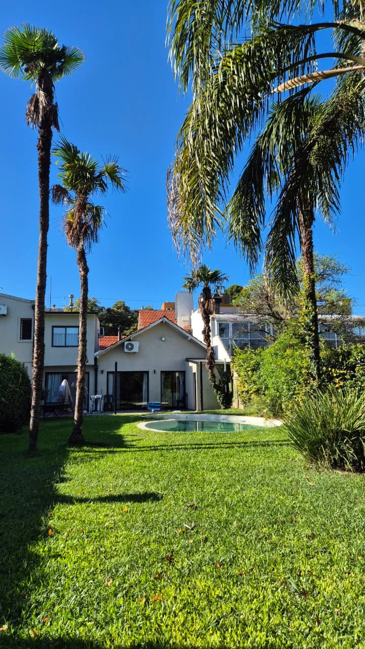 Casa en alquiler con 4 dormitorios, 3 en suite y el restante con vestidor privado. La distribución incluye 2 dormitorios en planta alta y 2 en planta baja. En planta alta hay una cocina comedor amplia con living incorporado y un baño, además de patio grande parquizado con pileta y frente con entrada de auto.
