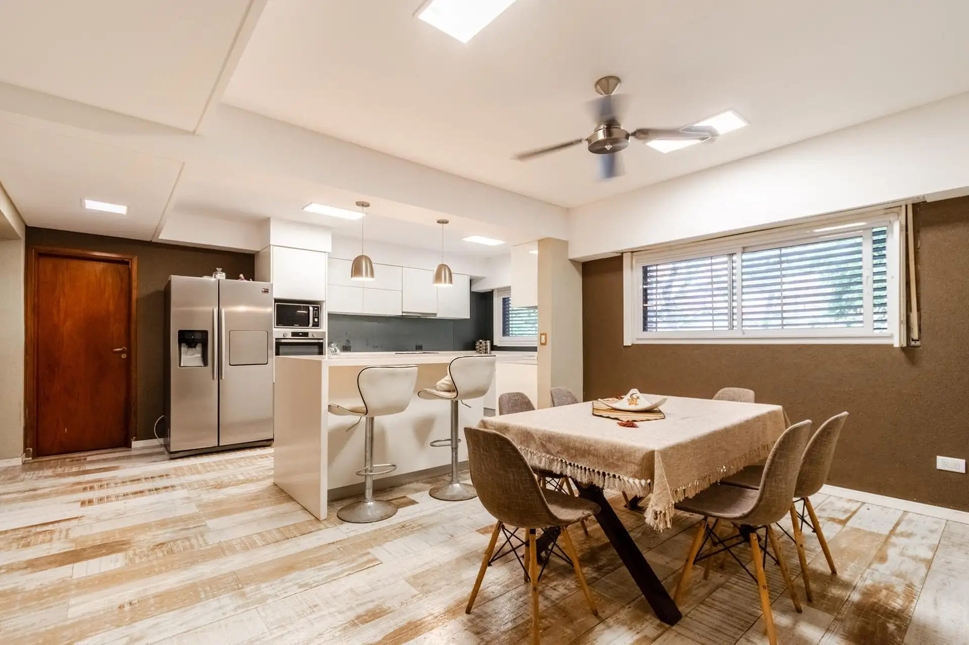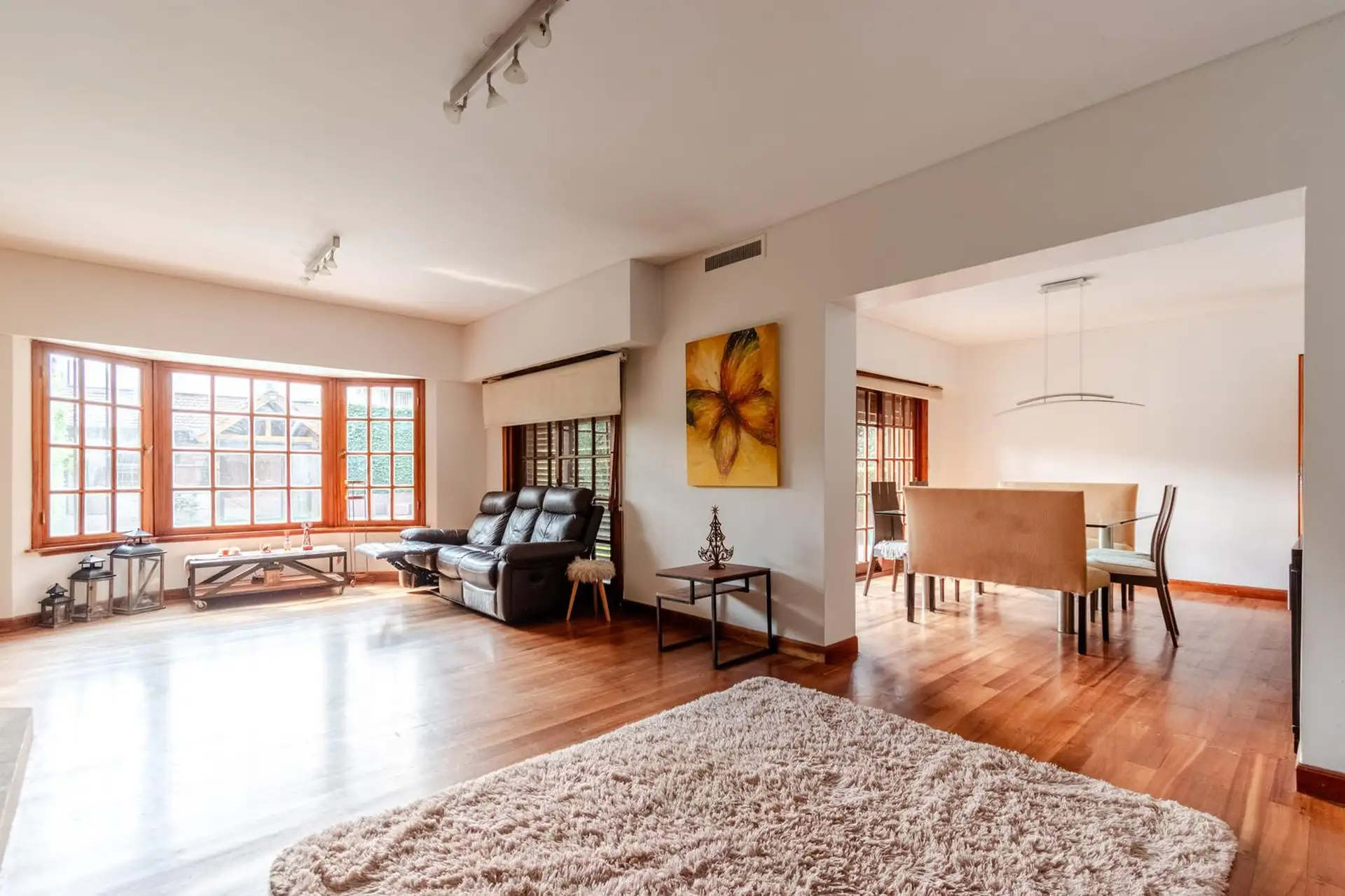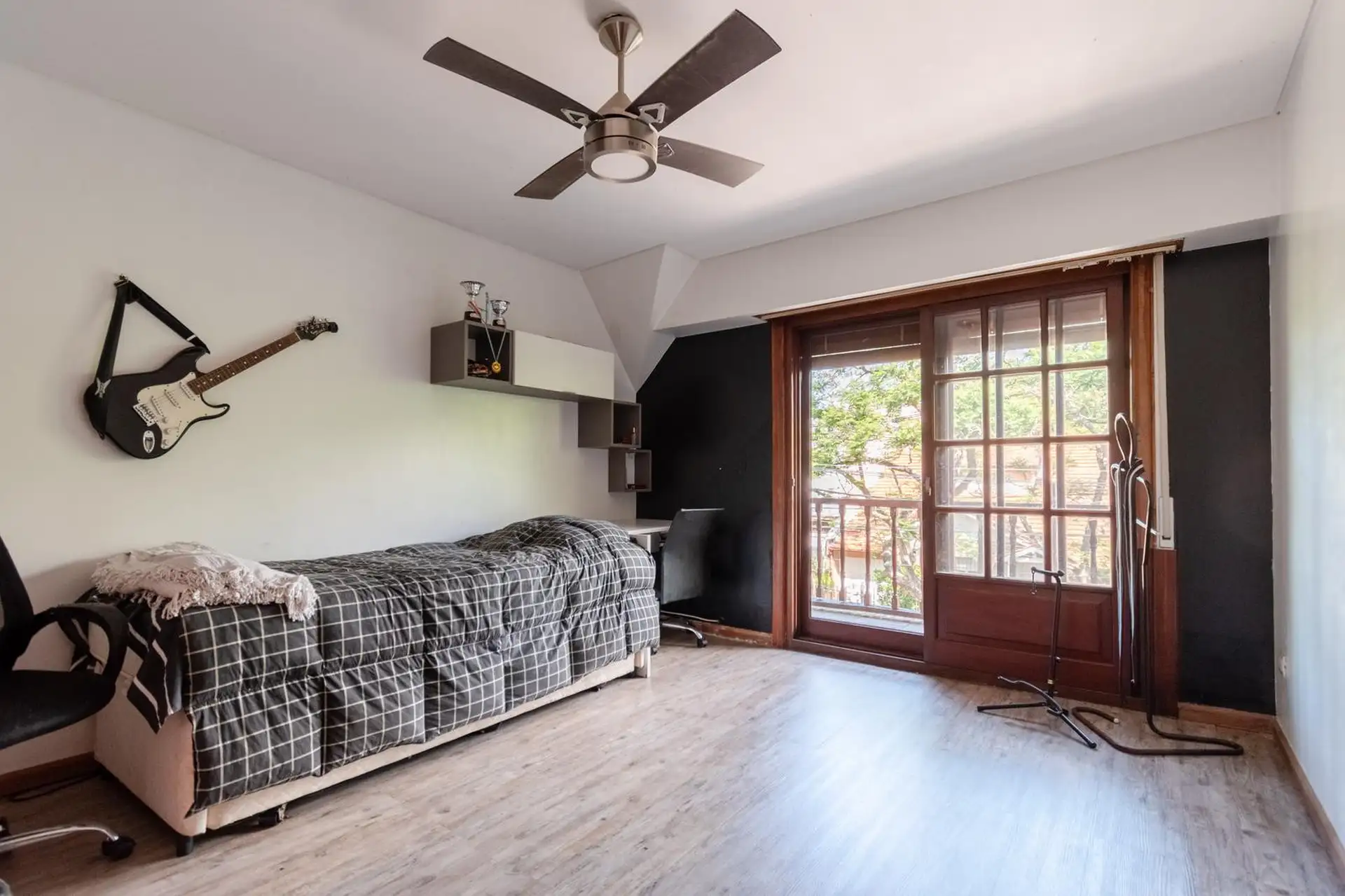 Casa en Martínez, Partido de San Isidro, disponible para venta y alquiler. Tiene 4 dormitorios, 2 de ellos en suite, playroom y dependencias. Cuenta con jardín con piscina y quincho, además de cochera para 3 autos (espacio en el retiro para 1 auto y garage para 2). La propiedad está elevada sobre el nivel de la vereda. En planta baja tiene hall de entrada, living comedor con salida al jardín, toilette, cocina con comedor diario, isla de Silestone y lavadero independiente. En planta alta hay un e