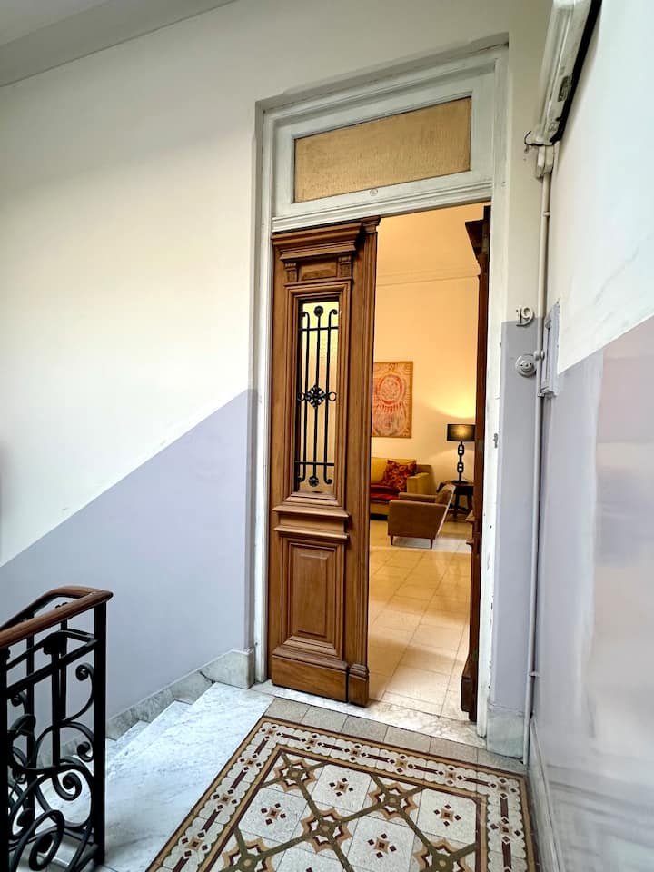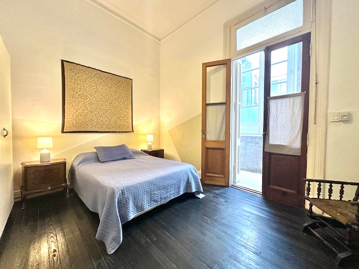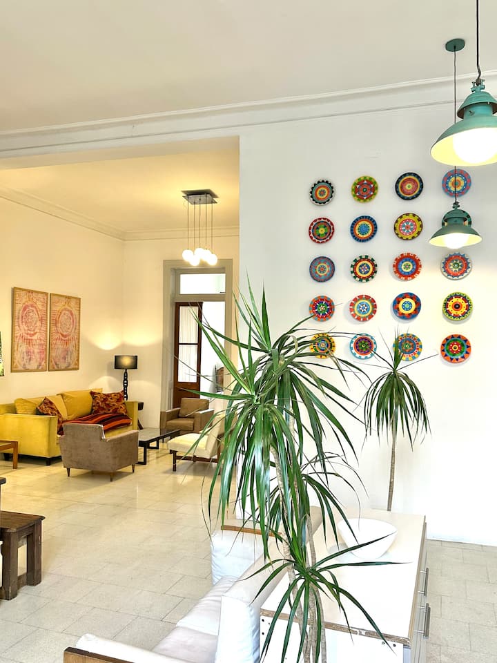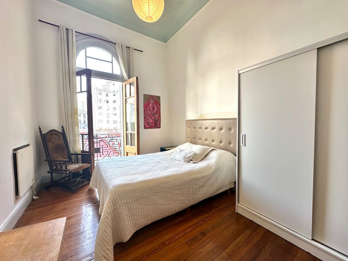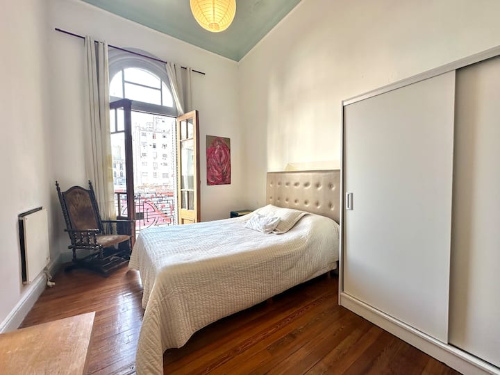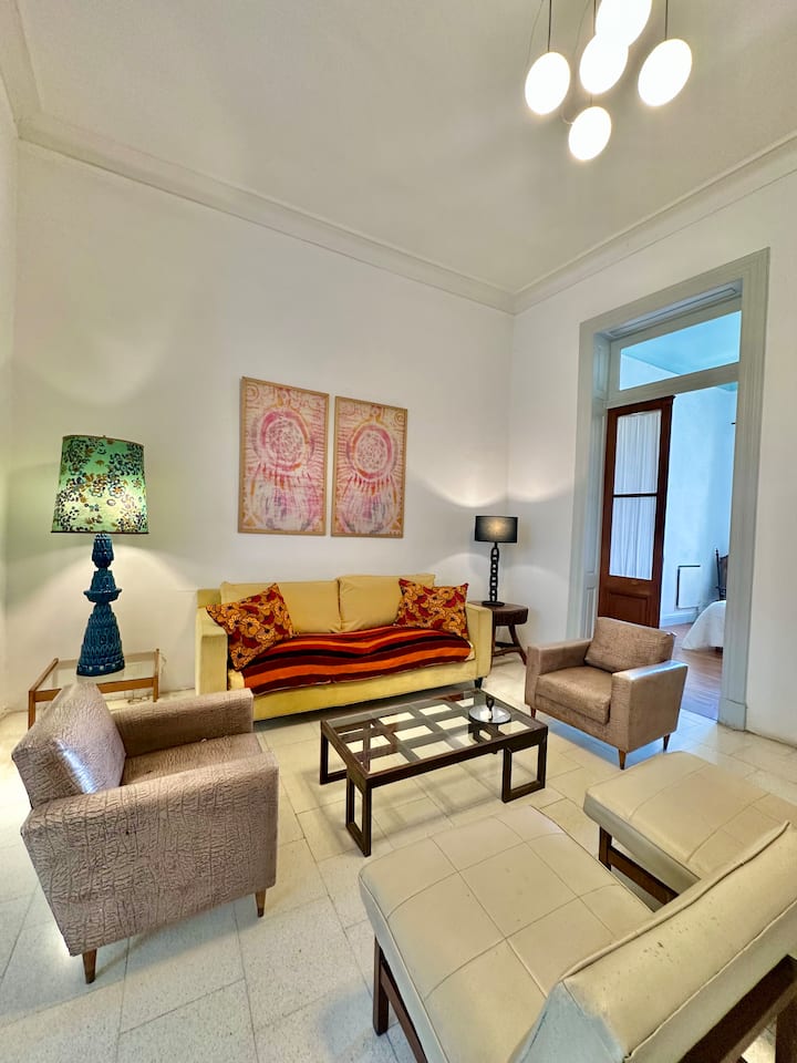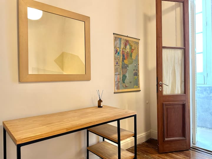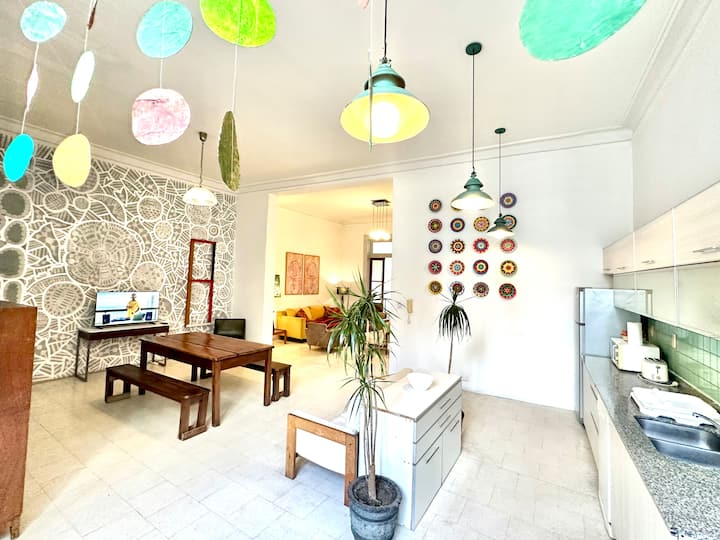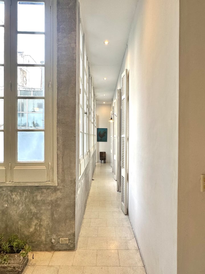 Departamento tipo loft renovado, de 4 dormitorios, ubicado en el distrito histórico de Monserrat. Cuenta con un living y espacio de comedor integrados a la zona de cocina, 2 dormitorios con cama doble, 2 dormitorios con cama simple y 2 baños. Tiene balcones a la calle y grandes ventanas. Está en un 2do piso y el edificio no tiene ascensor.