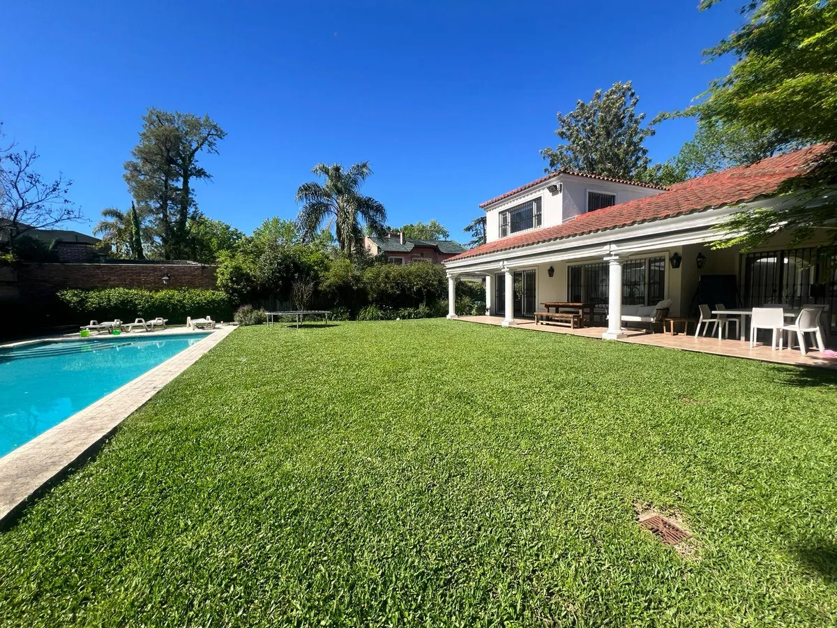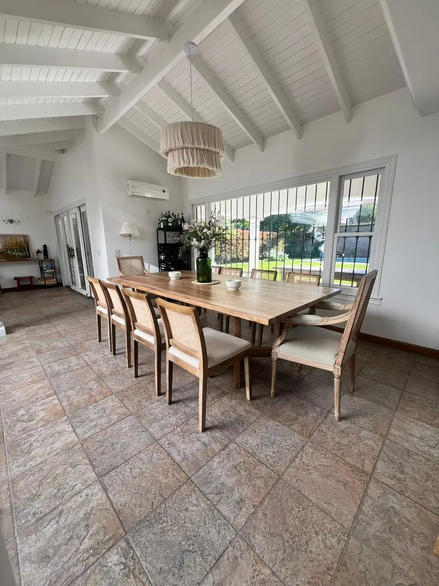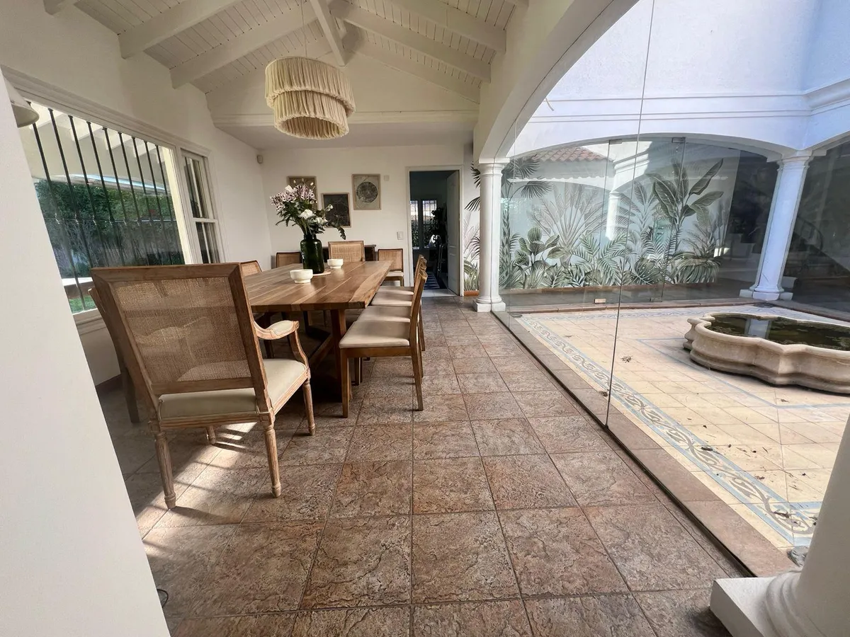 Casa de 4 dormitorios en San Isidro, disponible para alquiler temporario del 20 de diciembre al 10 de enero. El precio es USD 6.000 por el período completo. La planta baja cuenta con recepción con hall y patio interior con fuente, living, comedor principal separado para 10 personas, toilette de recepción y baño completo adicional; también incluye habitación/estar de TV, dependencia de servicio completa y lavadero independiente. La cocina está equipada con horno industrial y lavavajillas, y tiene