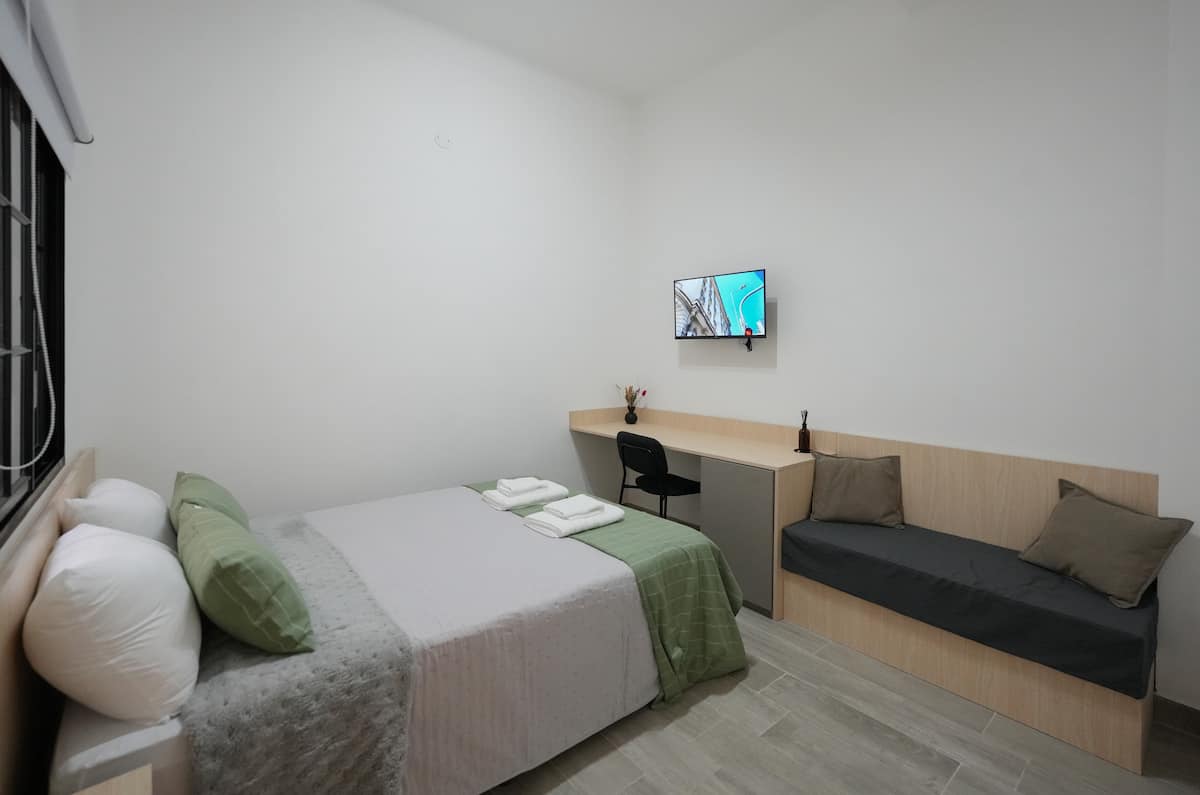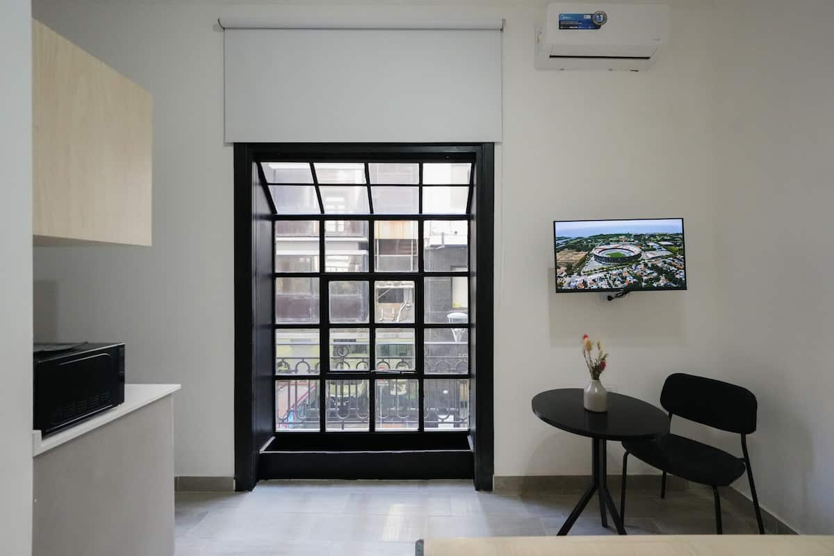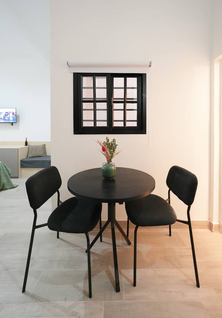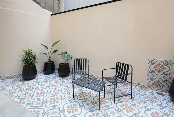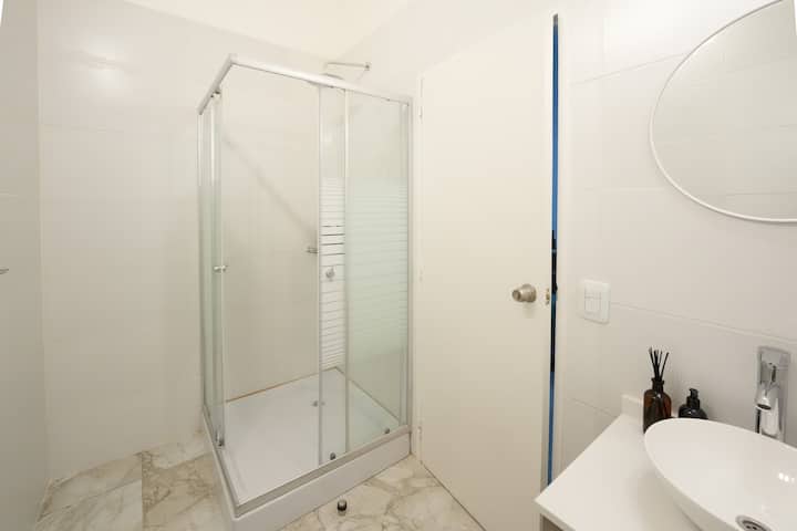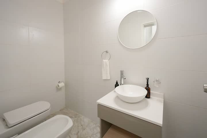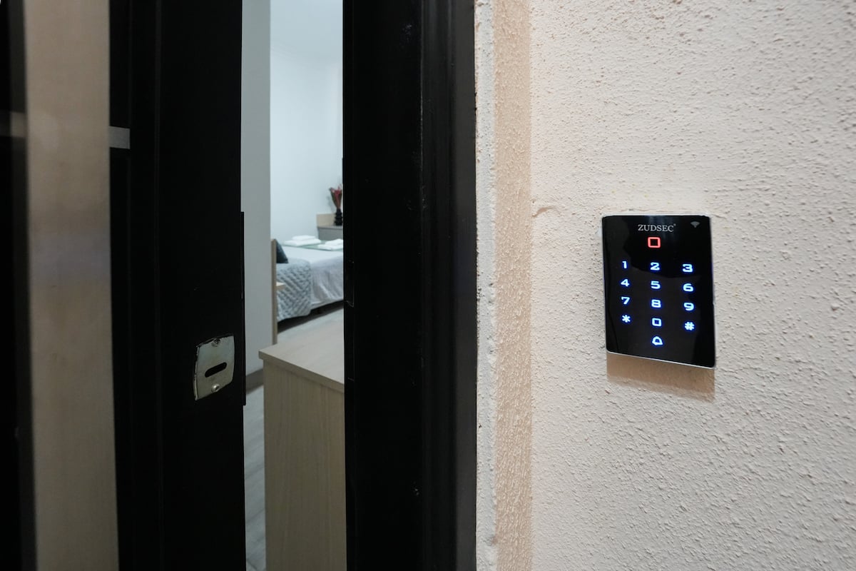 Departamento de 4 dormitorios con baño en suite, Smart TV y aire acondicionado frío/calor. El acceso es mediante cerradura electrónica. Incluye cama doble de 140 cm con ropa de cama, baño con ducha, agua caliente y artículos de tocador; además cuenta con cocina equipada con microondas, minibar, pava eléctrica, tostadora y cafetera. En el edificio hay un patio compartido con mesas y sillas.