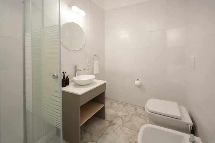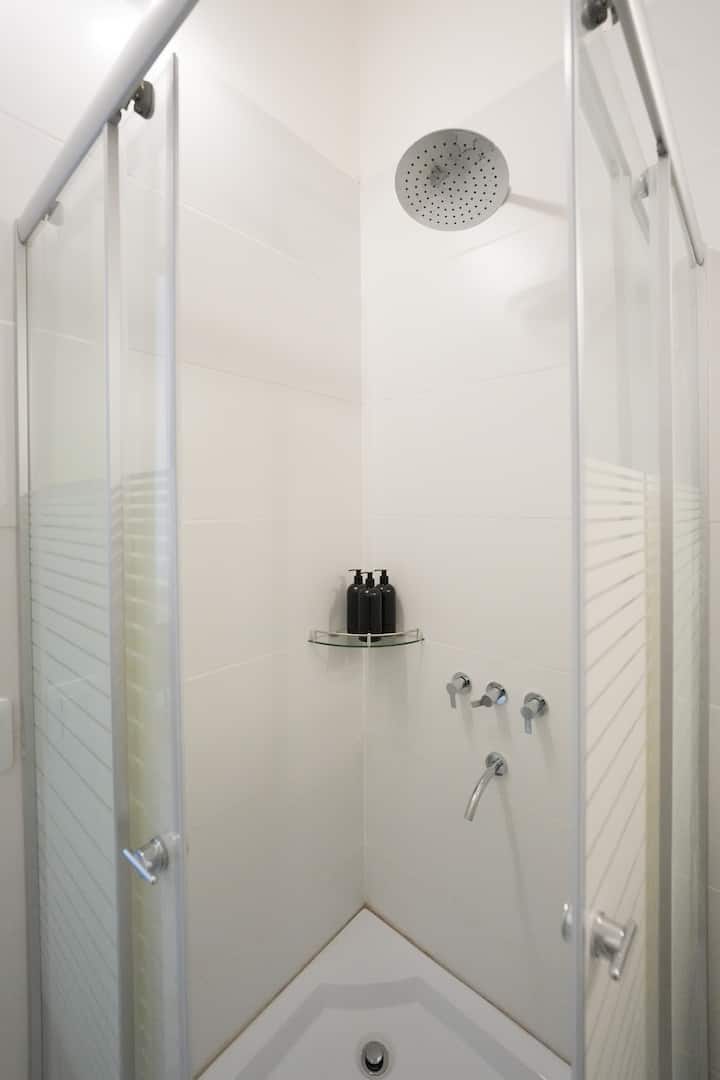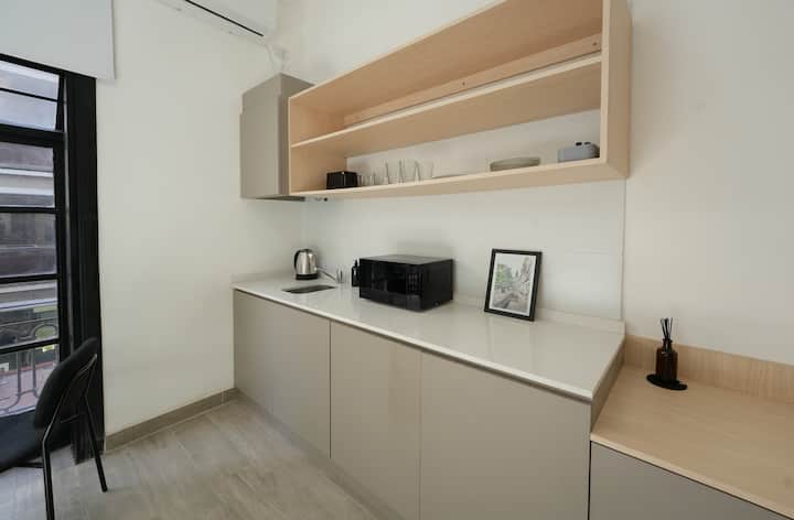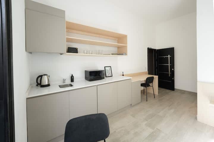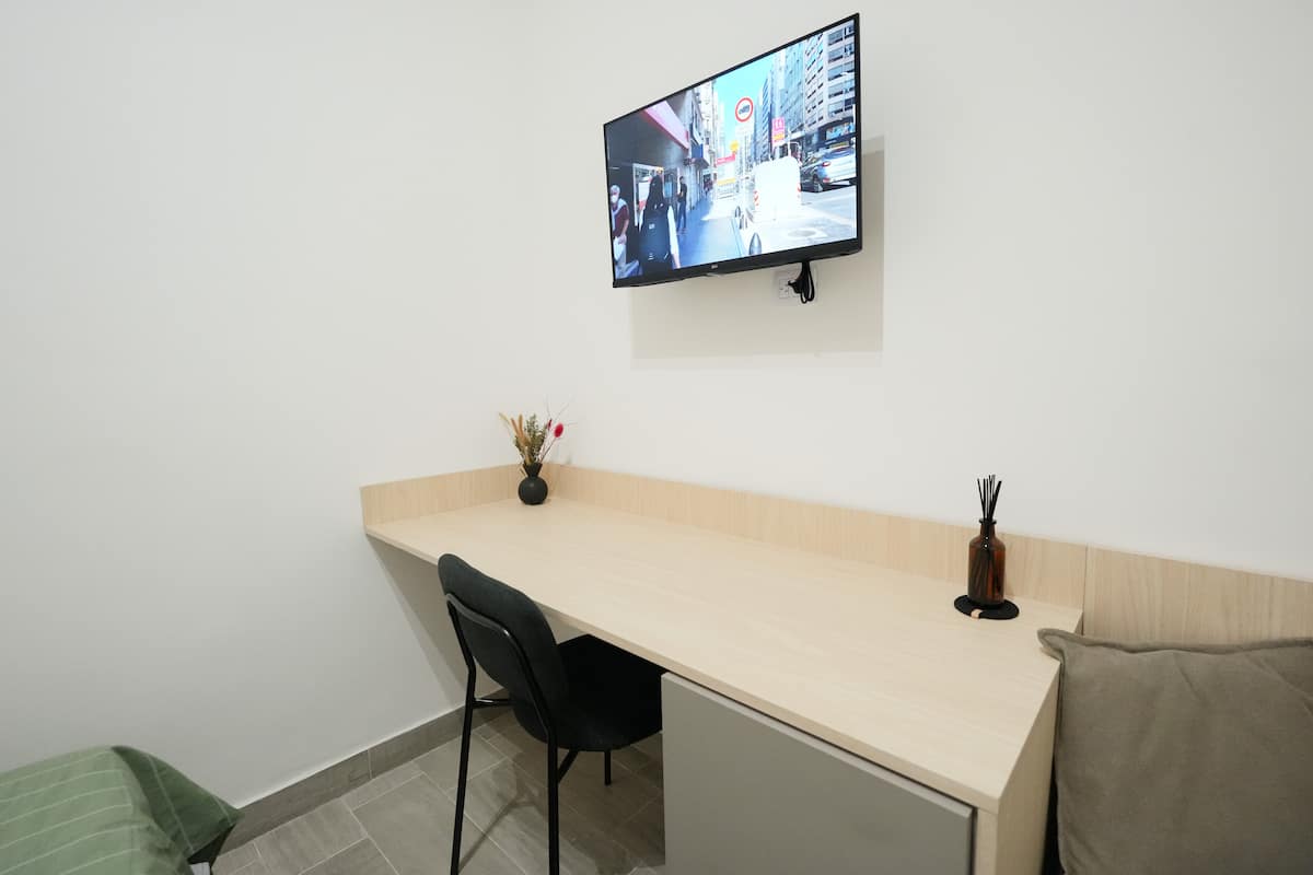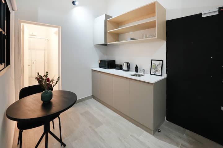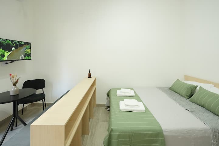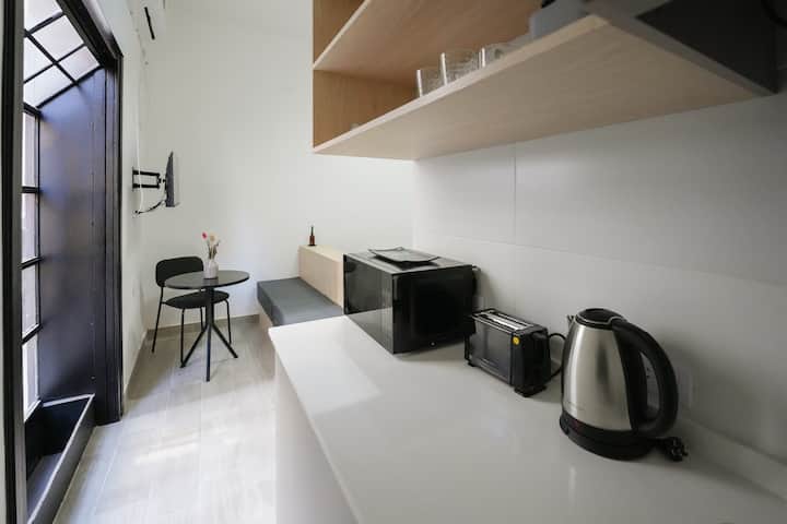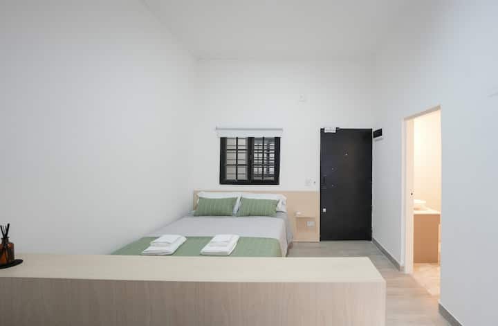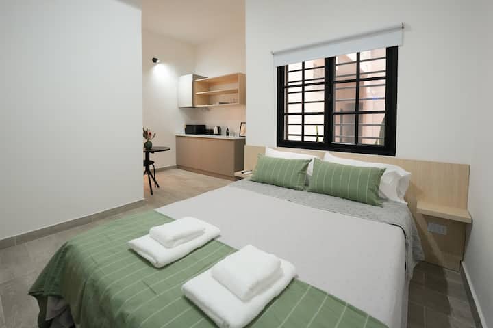 Departamento de 4 dormitorios con baño en suite, Smart TV y aire acondicionado frío/calor. El acceso es mediante cerradura electrónica. Incluye cama doble de 140 cm con ropa de cama, baño con ducha, agua caliente y artículos de tocador; además cuenta con cocina equipada con microondas, minibar, pava eléctrica, tostadora y cafetera. En el edificio hay un patio compartido con mesas y sillas.