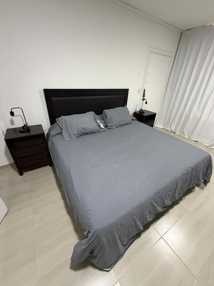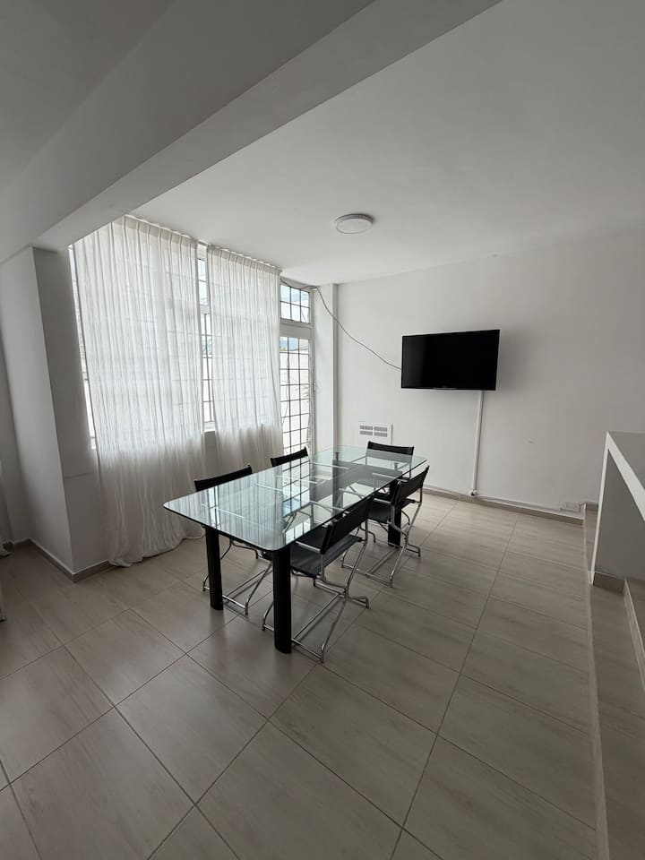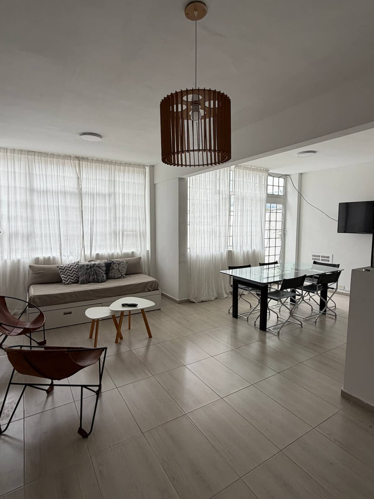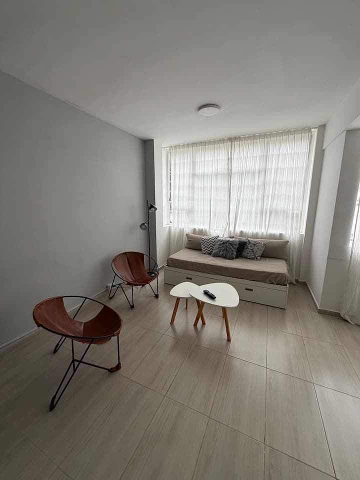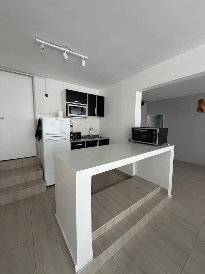 Se publican 2 departamentos en el mismo piso, ubicados uno al frente del otro. El primer departamento tiene 2 dormitorios, un living amplio con barra desayunadora, 1 baño completo y una terraza grande con mesa y sillas. El segundo departamento tiene 1 dormitorio grande y un ambiente living-comedor integrado con sofá cama y cama doble de 140 cm x 190 cm.