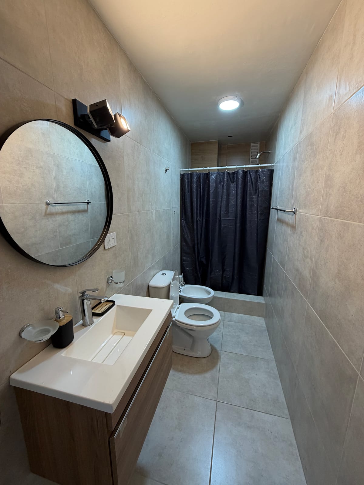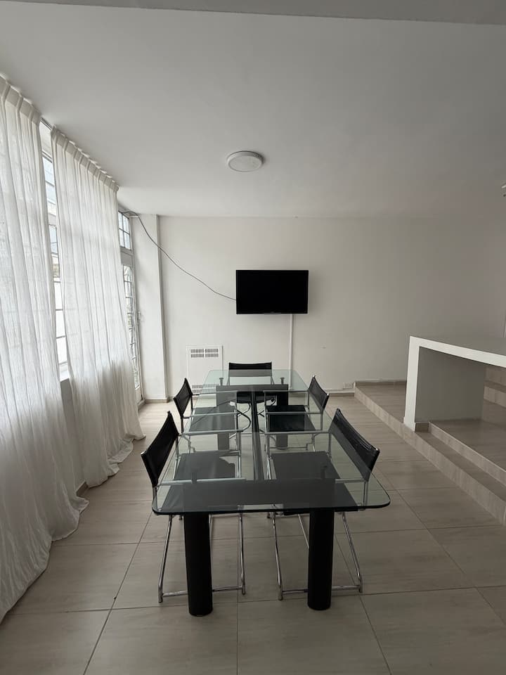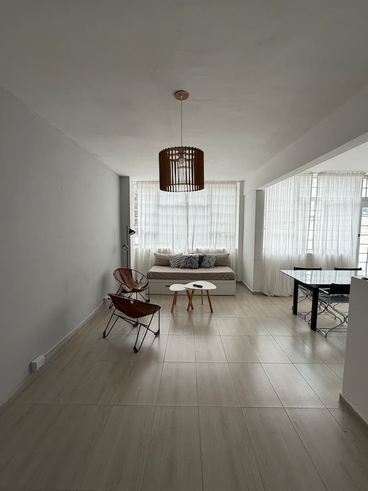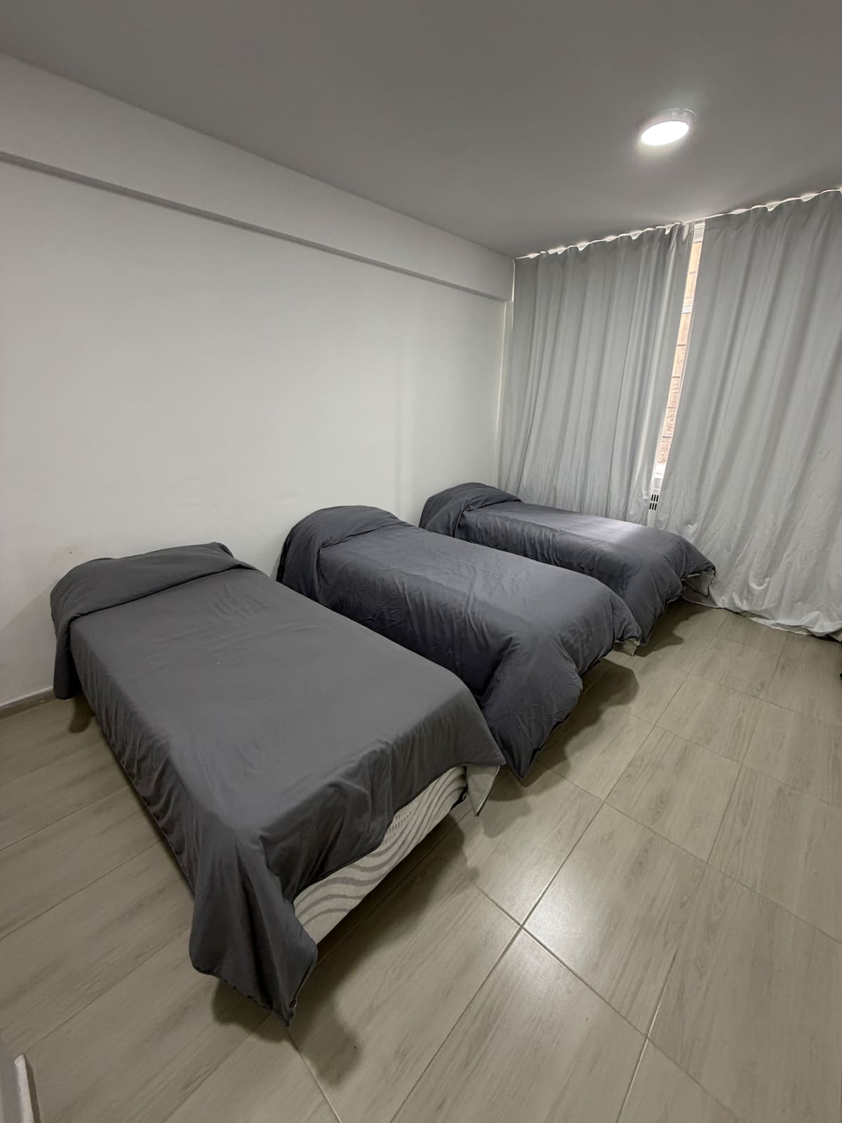 Se publican 2 departamentos en el mismo piso, ubicados uno al frente del otro. El primer departamento tiene 2 dormitorios, un living amplio con barra desayunadora, 1 baño completo y una terraza grande con mesa y sillas. El segundo departamento tiene 1 dormitorio grande y un ambiente living-comedor integrado con sofá cama y cama doble de 140 cm x 190 cm.