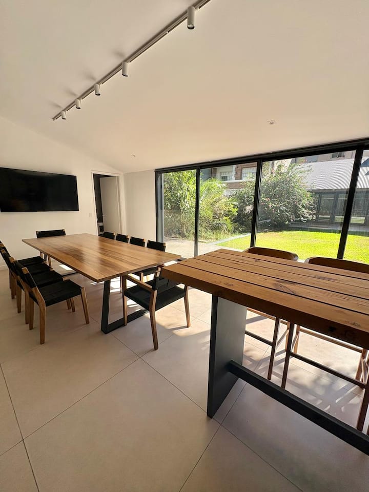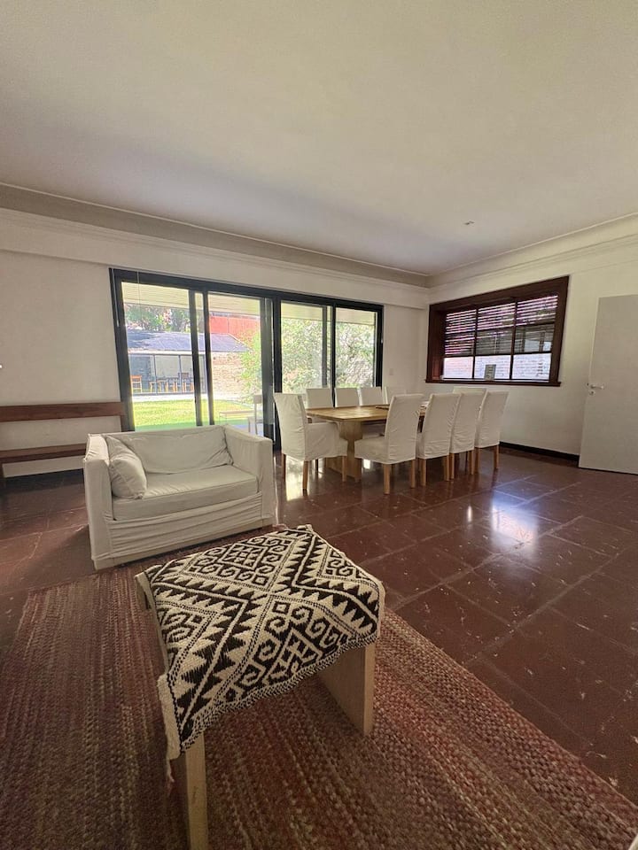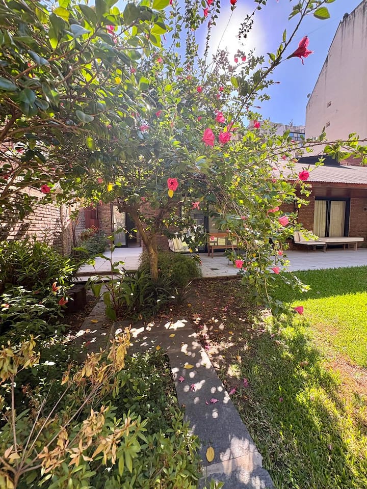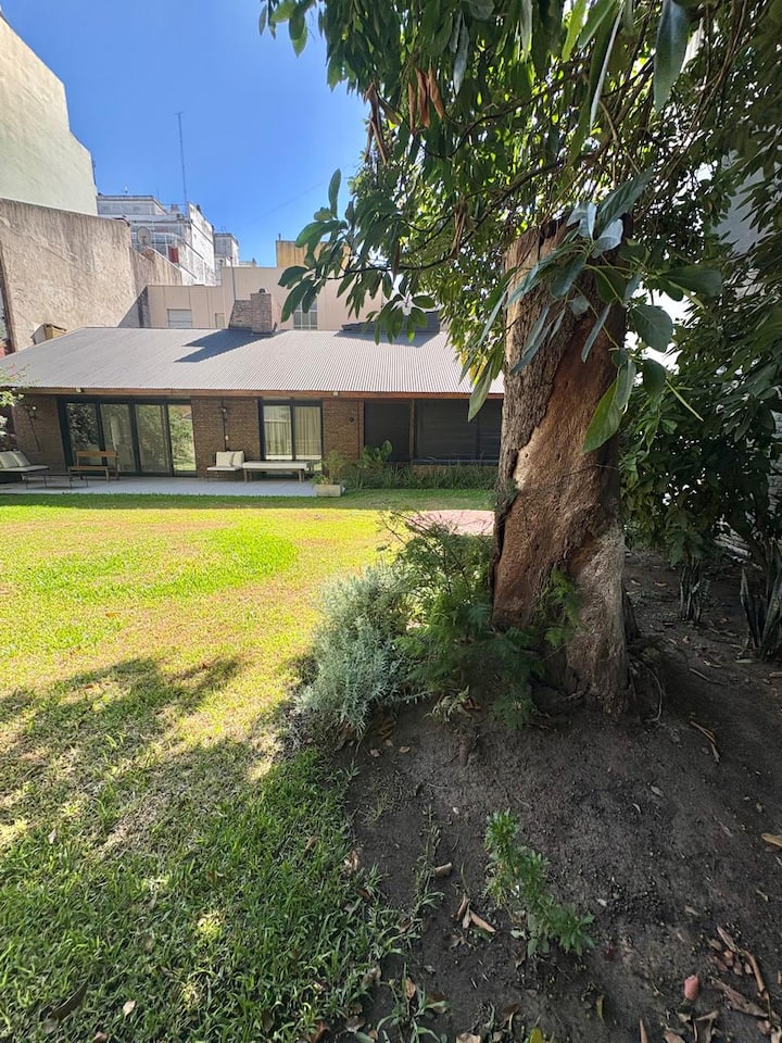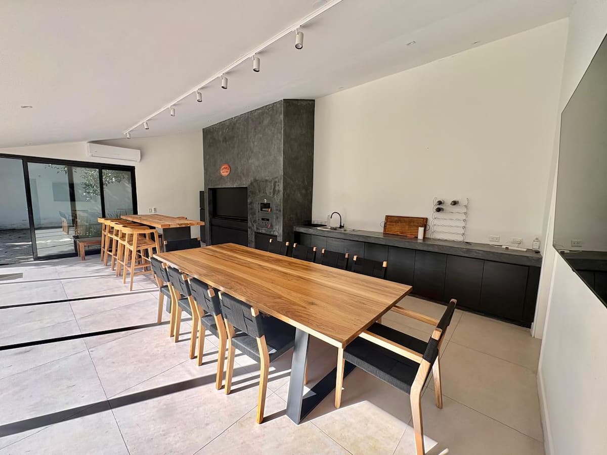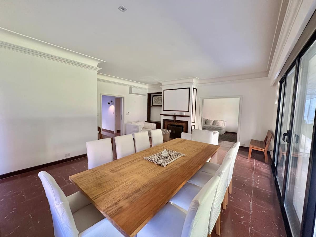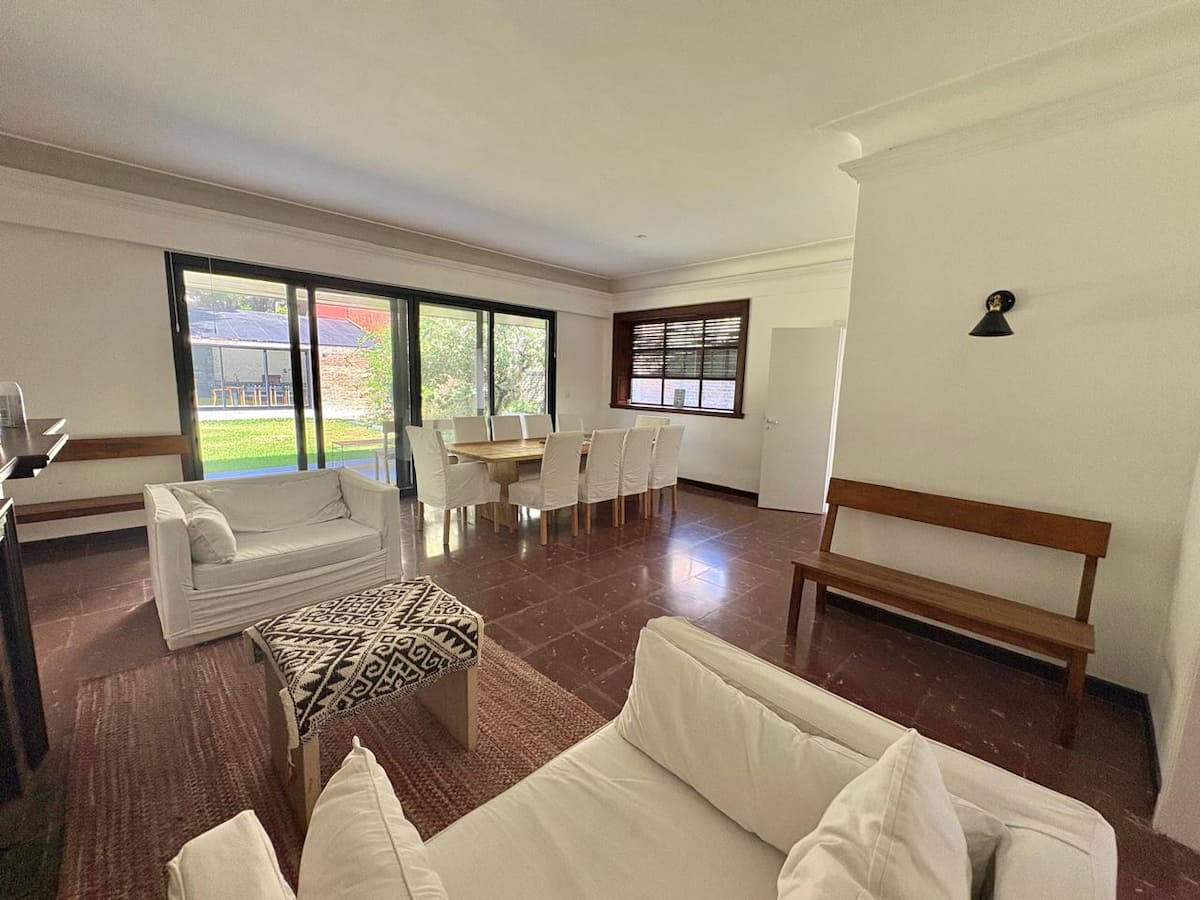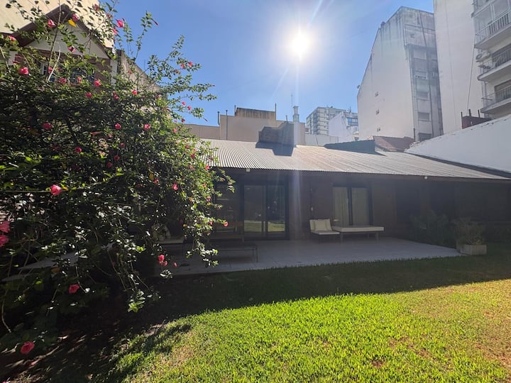 Casa en Belgrano con 5 dormitorios. Cuenta con jardín amplio y dos chimeneas a leña. Tiene 4 dormitorios con 3 baños en suite totalmente equipados y un 5º dormitorio de servicio con baño exterior. El living-comedor dispone de mesa para al menos 10 personas, grandes ventanales y chimenea a leña, y se conecta con un segundo estar con chimenea a leña. La cocina es amplia y cuenta con equipamiento completo.