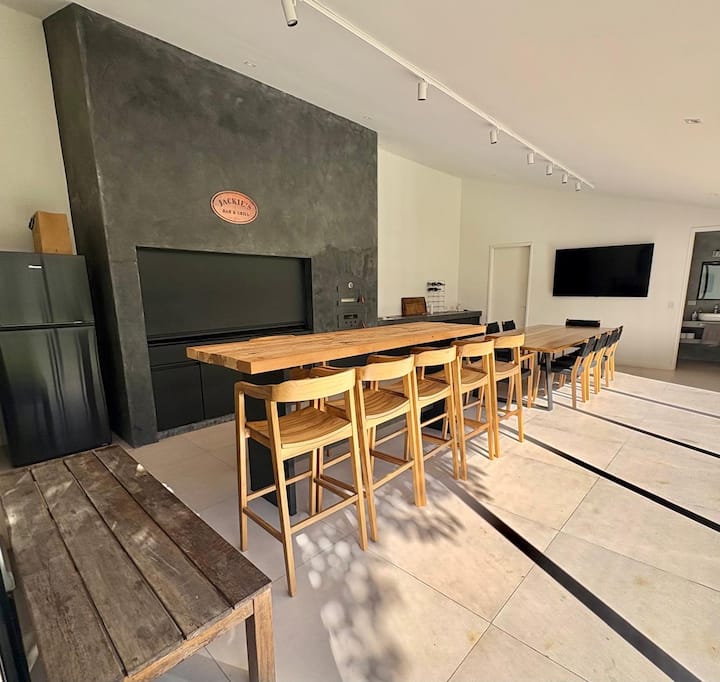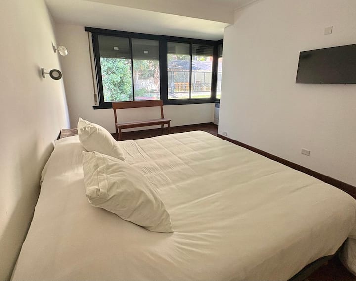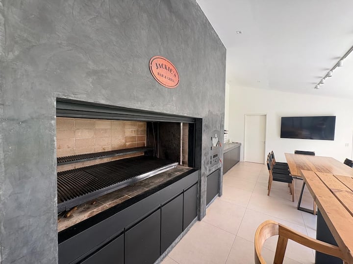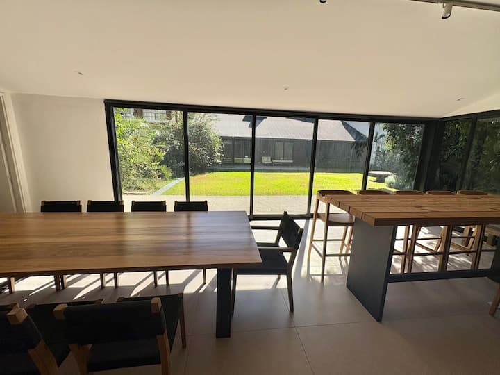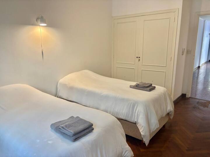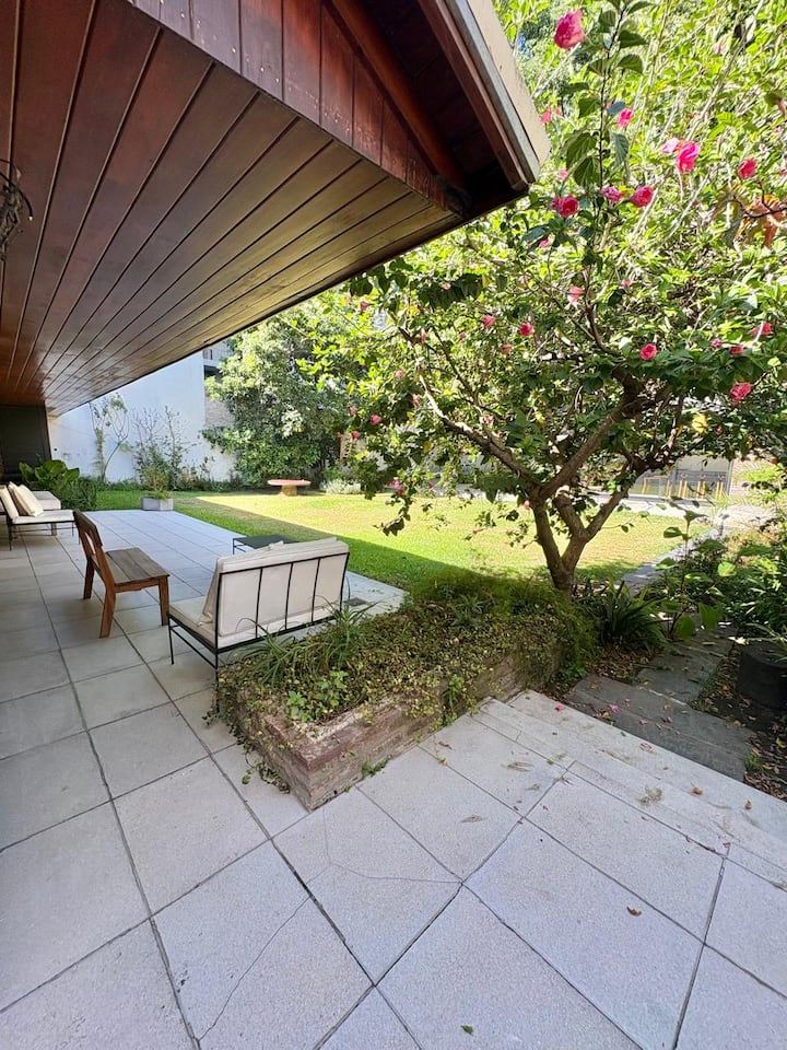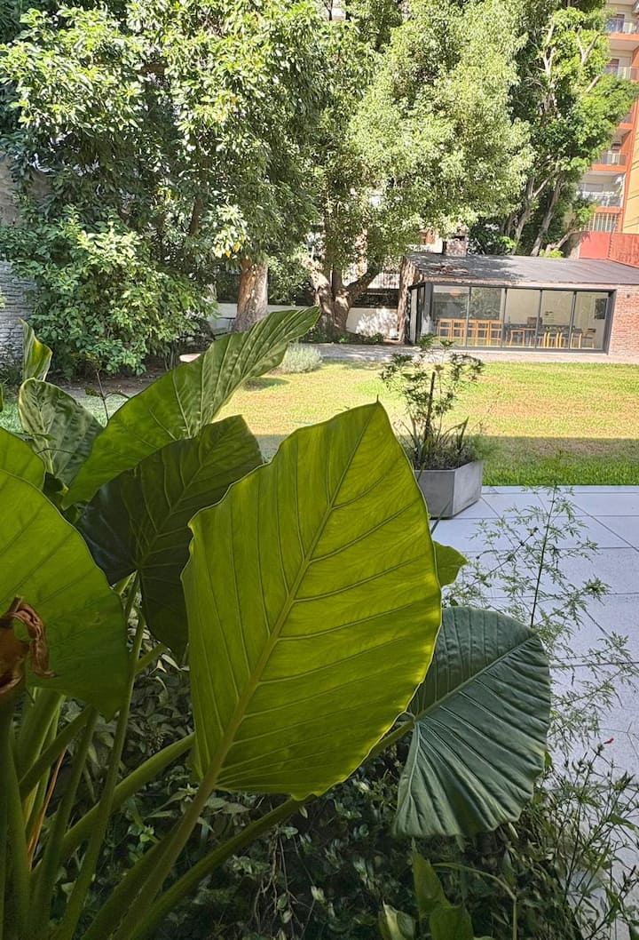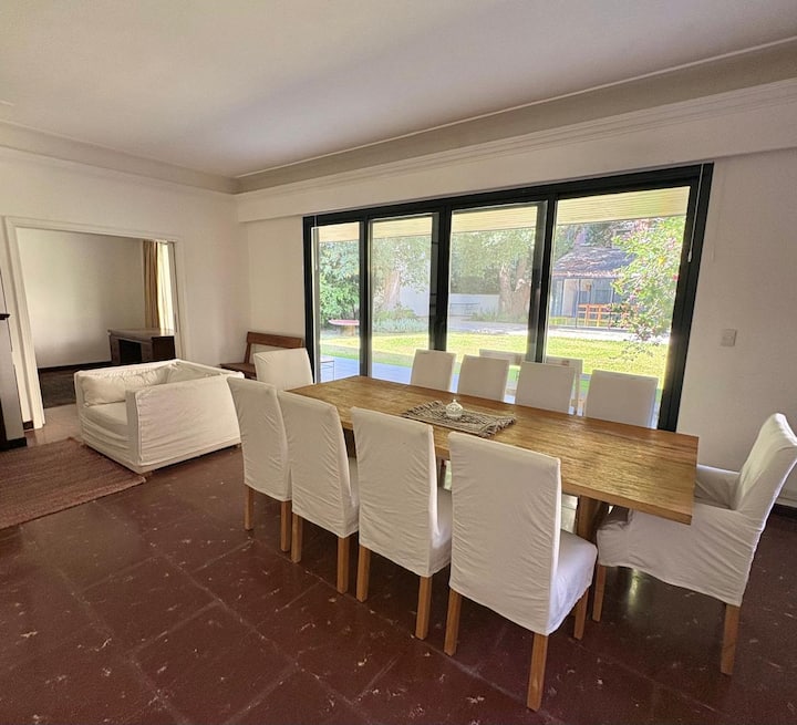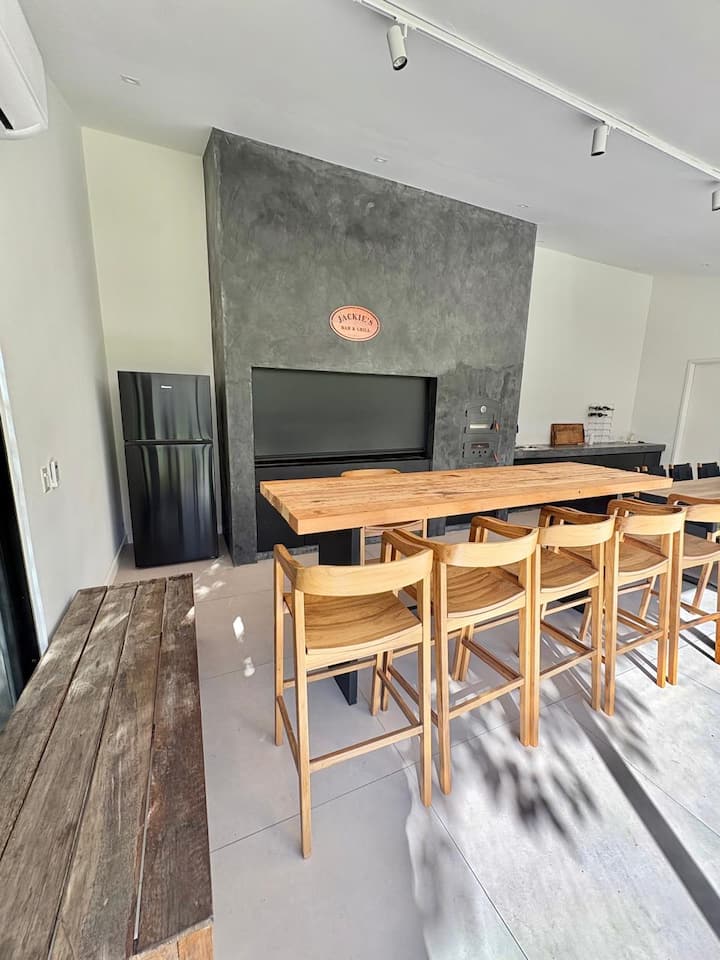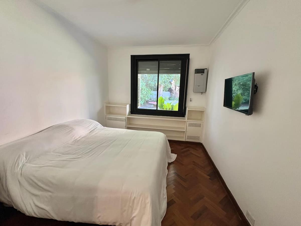 Casa en Belgrano con 5 dormitorios. Cuenta con jardín amplio y dos chimeneas a leña. Tiene 4 dormitorios con 3 baños en suite totalmente equipados y un 5º dormitorio de servicio con baño exterior. El living-comedor dispone de mesa para al menos 10 personas, grandes ventanales y chimenea a leña, y se conecta con un segundo estar con chimenea a leña. La cocina es amplia y cuenta con equipamiento completo.