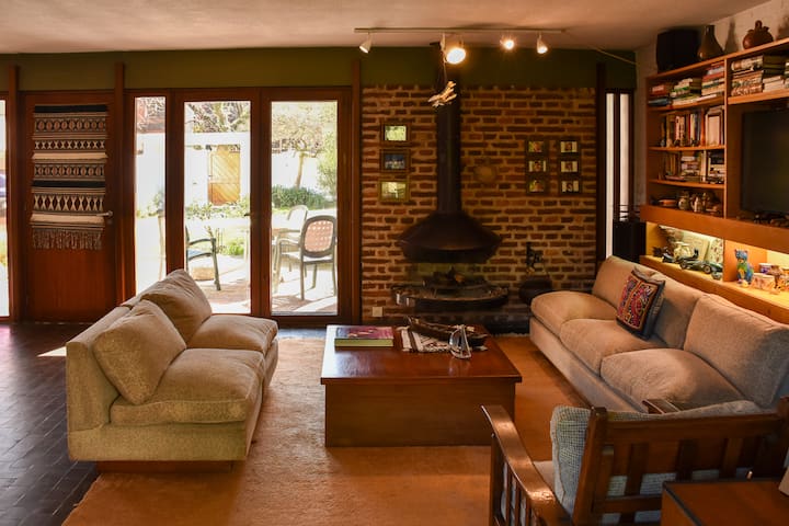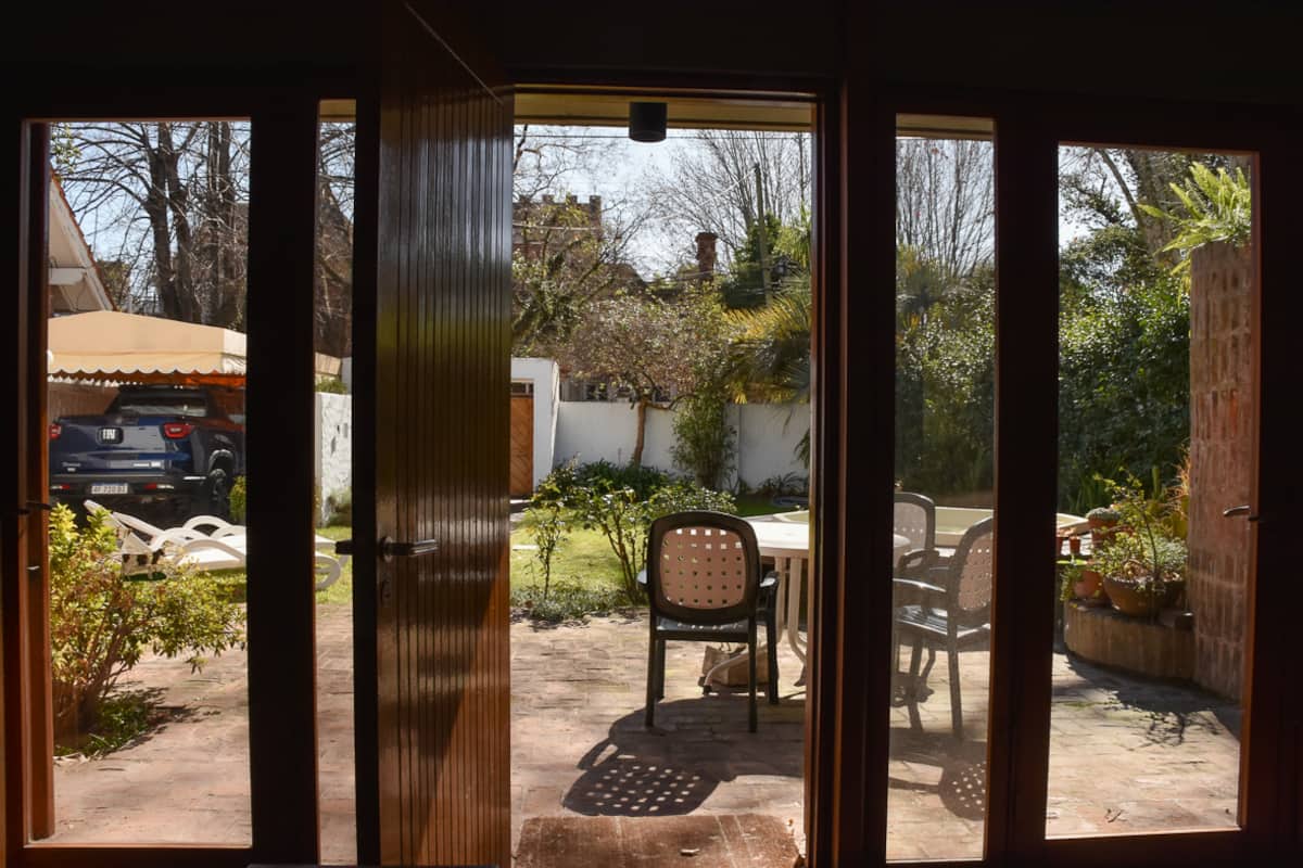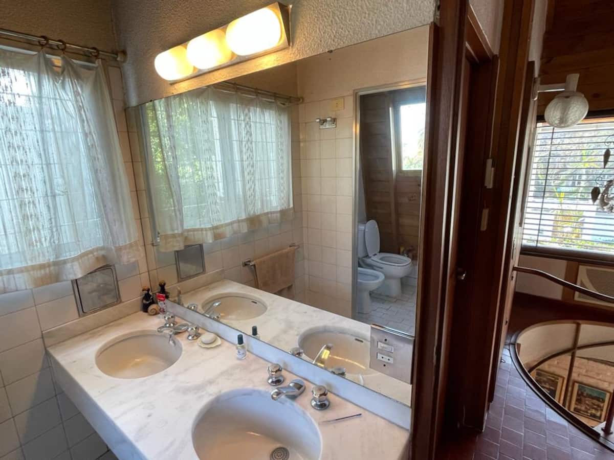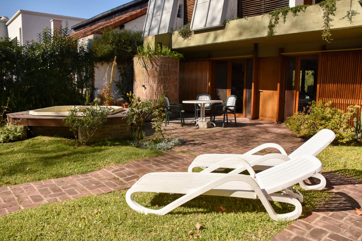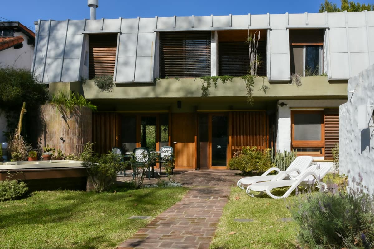 Casa en Las Lomas de San Isidro con 5 dormitorios, diseñada por arquitectos y con inspiración en Le Corbusier. Cuenta con jardín con acceso privado, living con vista a jardines, cocina con barra integrada y biblioteca. Incluye jacuzzi con capacidad para 6 personas, actualmente en mantenimiento, y comedor exterior. La entrada al inmueble da a un living con chimenea y una escalera de madera.