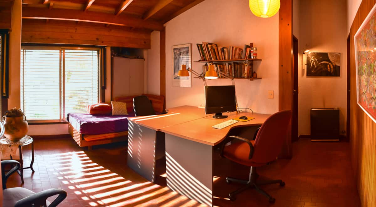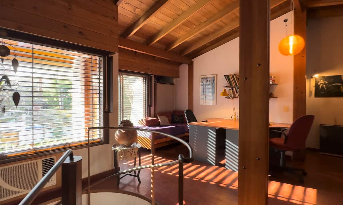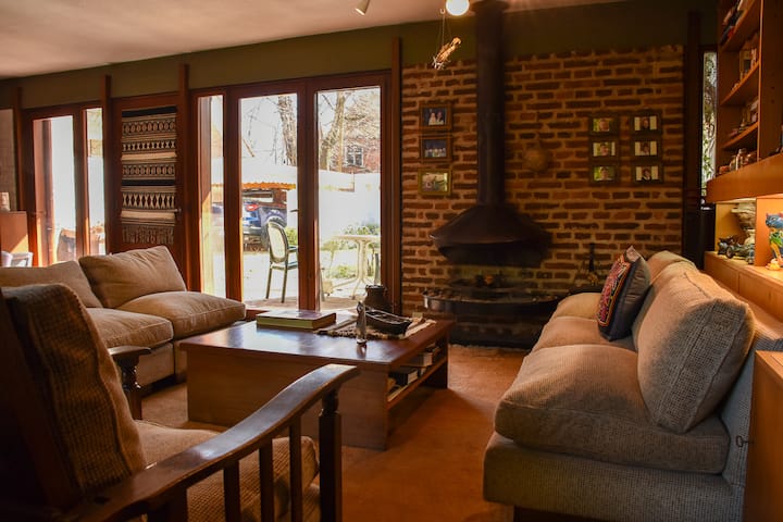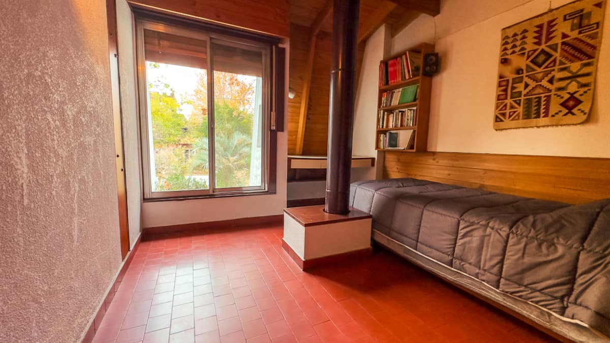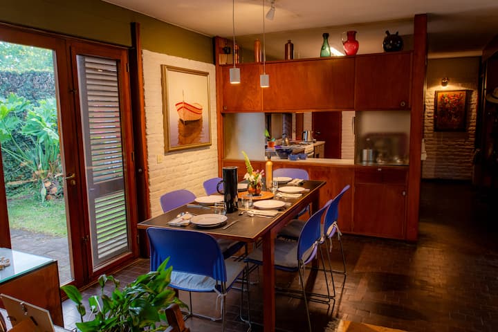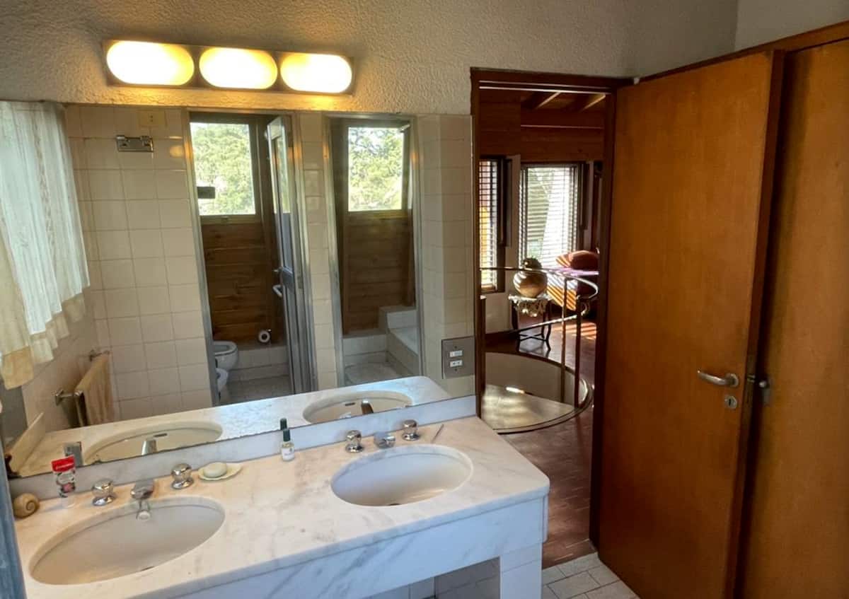 Casa en Las Lomas de San Isidro con 5 dormitorios, diseñada por arquitectos y con inspiración en Le Corbusier. Cuenta con jardín con acceso privado, living con vista a jardines, cocina con barra integrada y biblioteca. Incluye jacuzzi con capacidad para 6 personas, actualmente en mantenimiento, y comedor exterior. La entrada al inmueble da a un living con chimenea y una escalera de madera.
