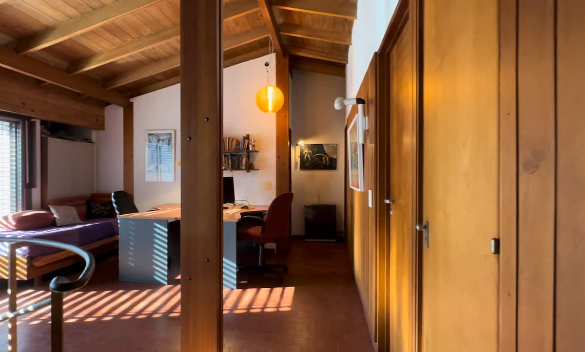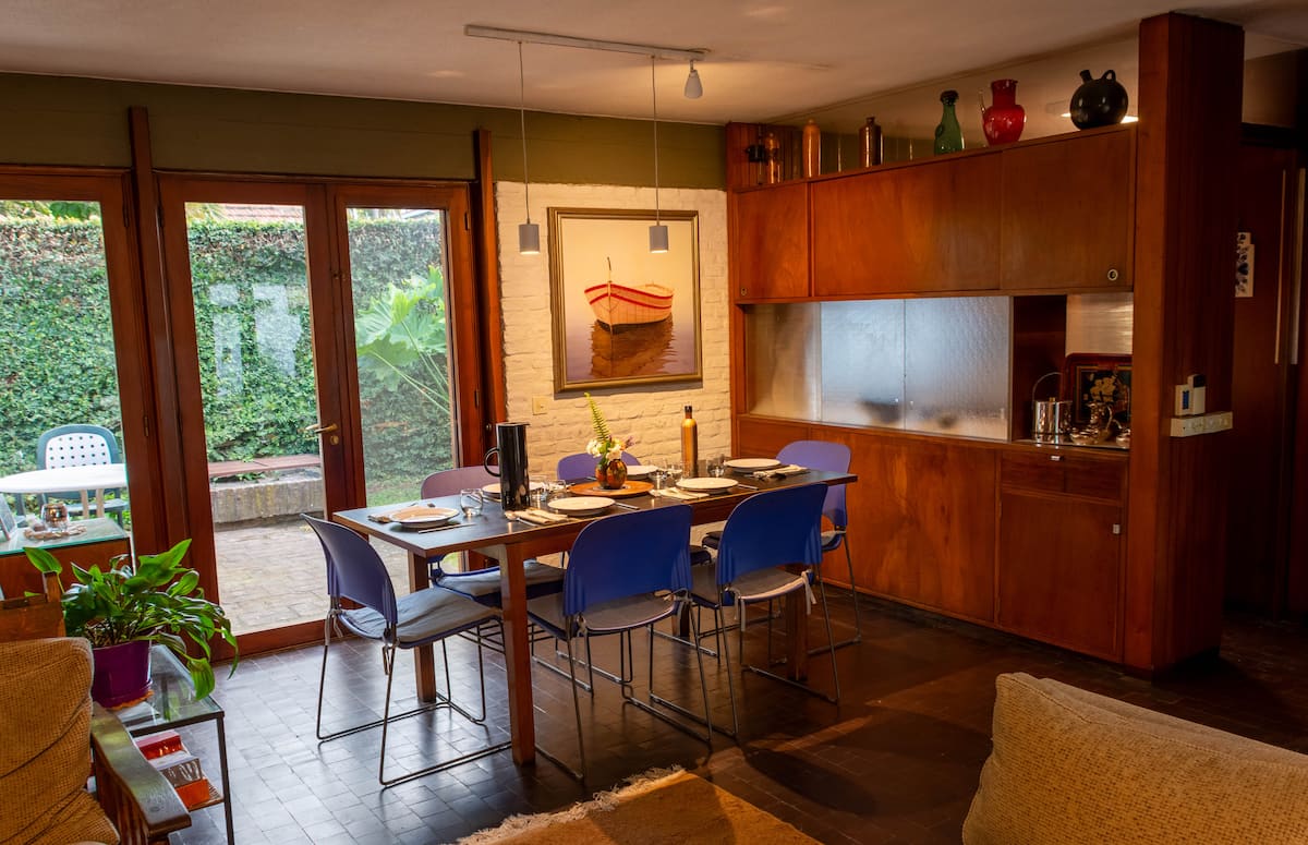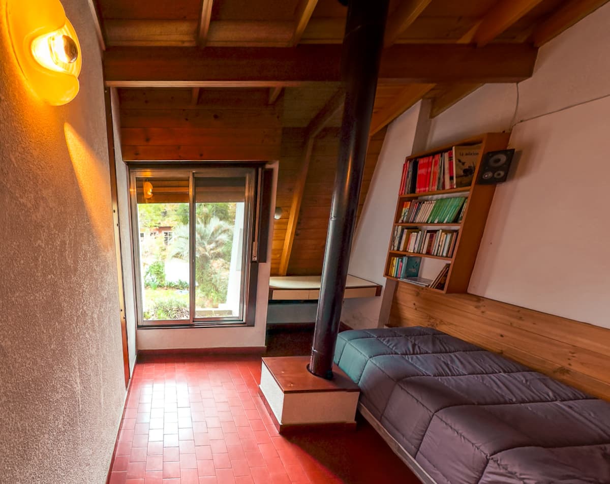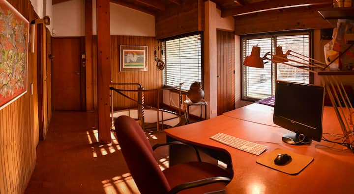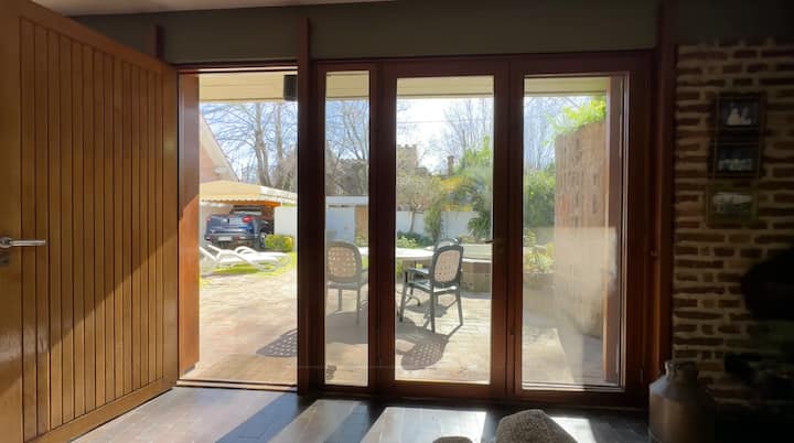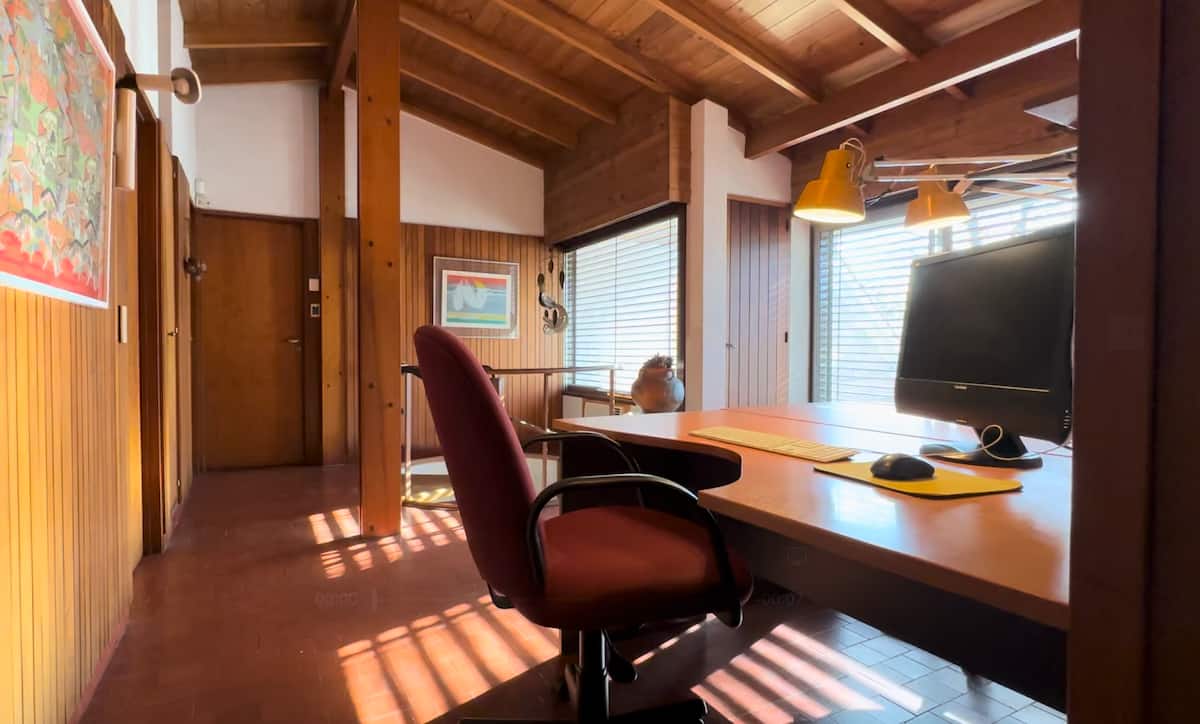 Casa en Las Lomas de San Isidro con 5 dormitorios, diseñada por arquitectos y con inspiración en Le Corbusier. Cuenta con jardín con acceso privado, living con vista a jardines, cocina con barra integrada y biblioteca. Incluye jacuzzi con capacidad para 6 personas, actualmente en mantenimiento, y comedor exterior. La entrada al inmueble da a un living con chimenea y una escalera de madera.