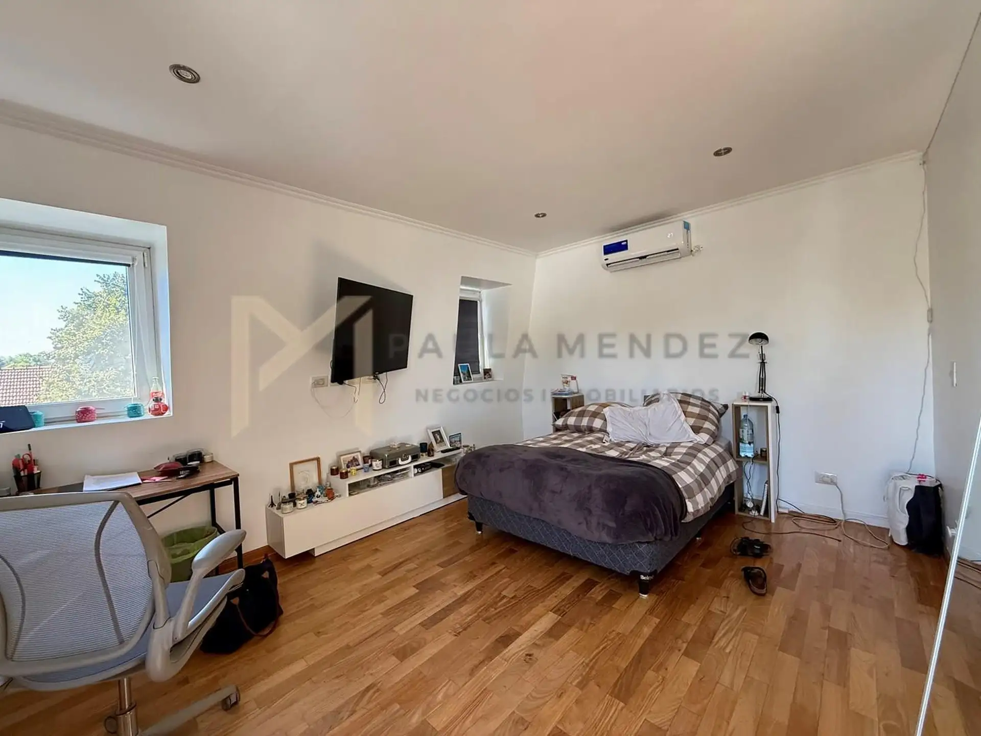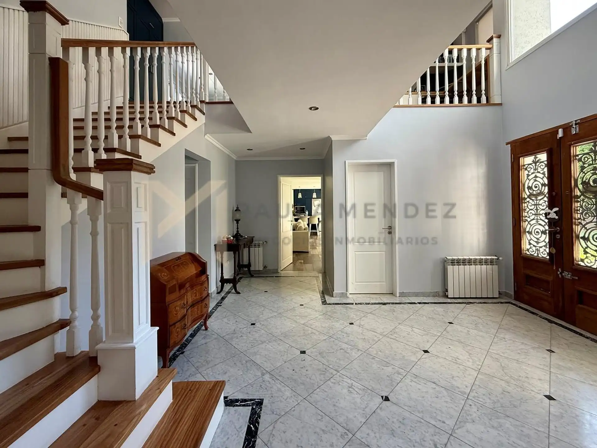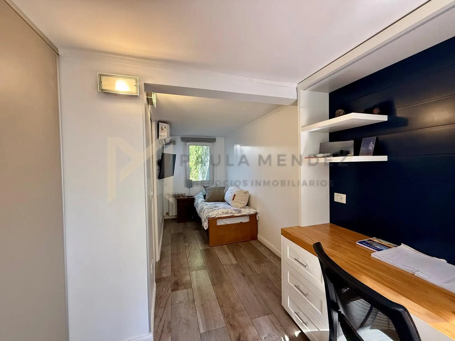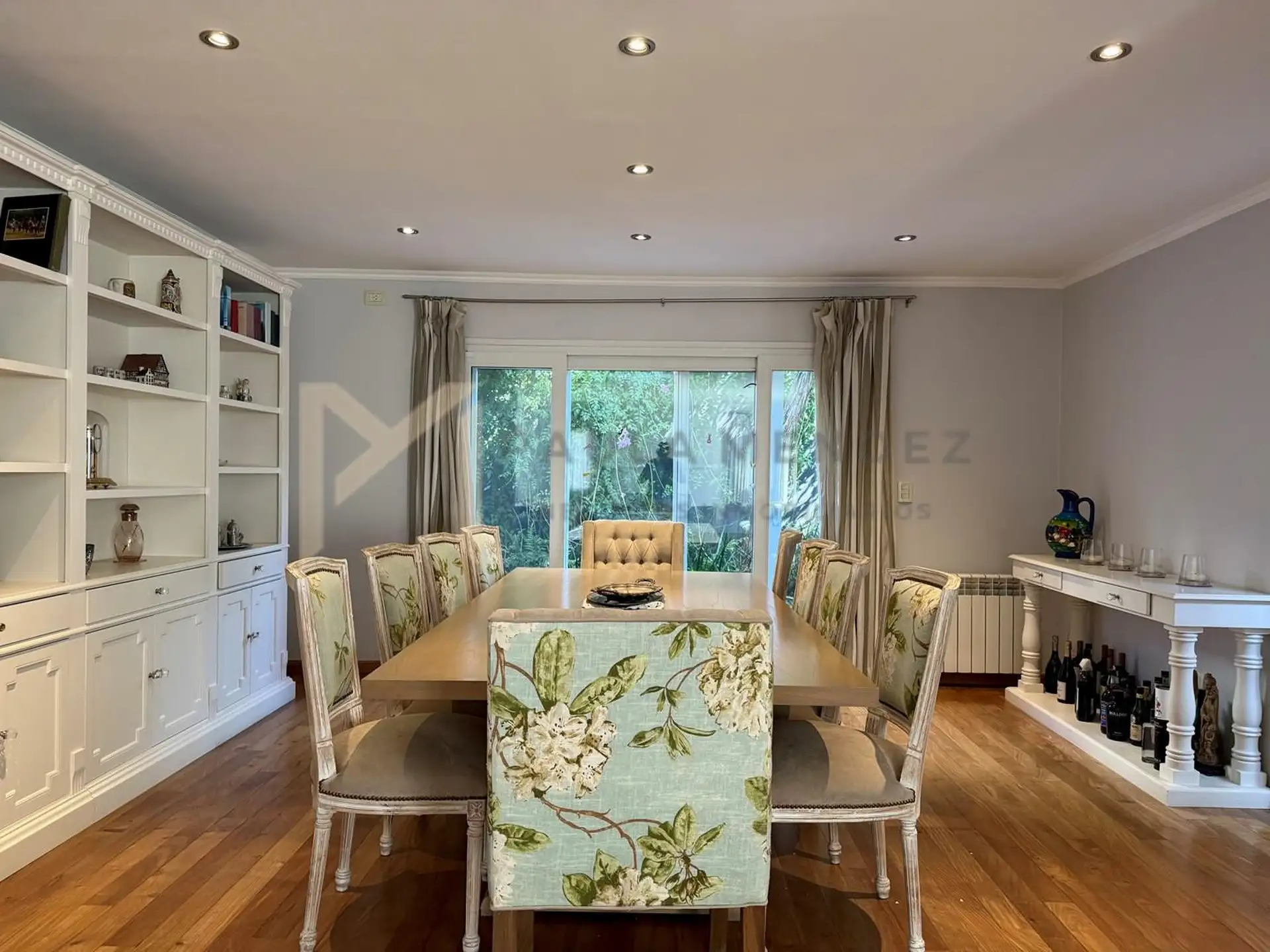 Casa en alquiler en La Horqueta, San Isidro, desarrollada sobre 2 lotes y con acceso por un jardín. Se distribuye en 3 plantas y cuenta con 5 dormitorios en las plantas superiores y 1 habitación adicional en planta baja. En planta baja hay hall de recepción con vestidor, toilette con ventana, living-comedor con grandes ventanales y chimenea, y un espacio diario que integra cocina, comedor y sector de TV. La cocina incluye barra desayunadora y electrodomésticos, además de un mueble de entretenimi