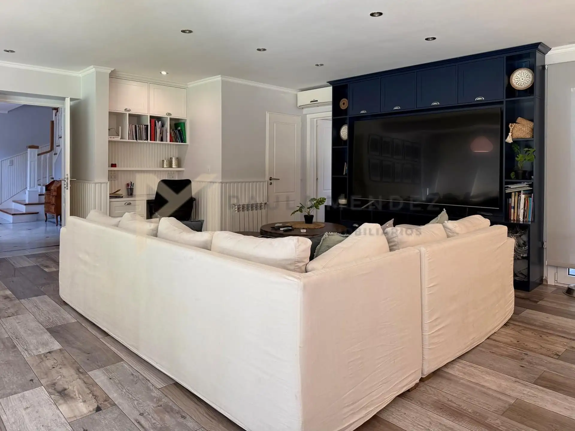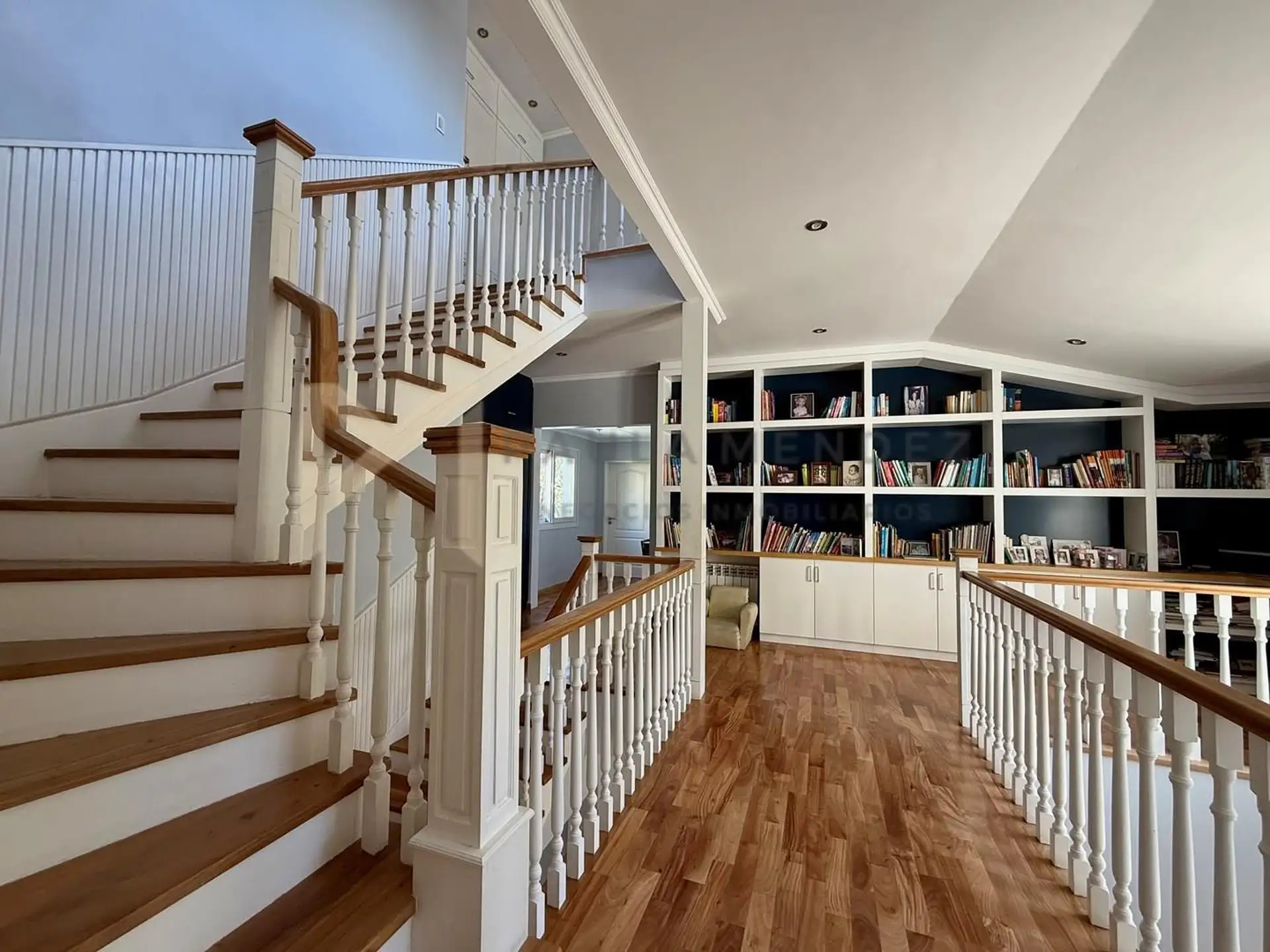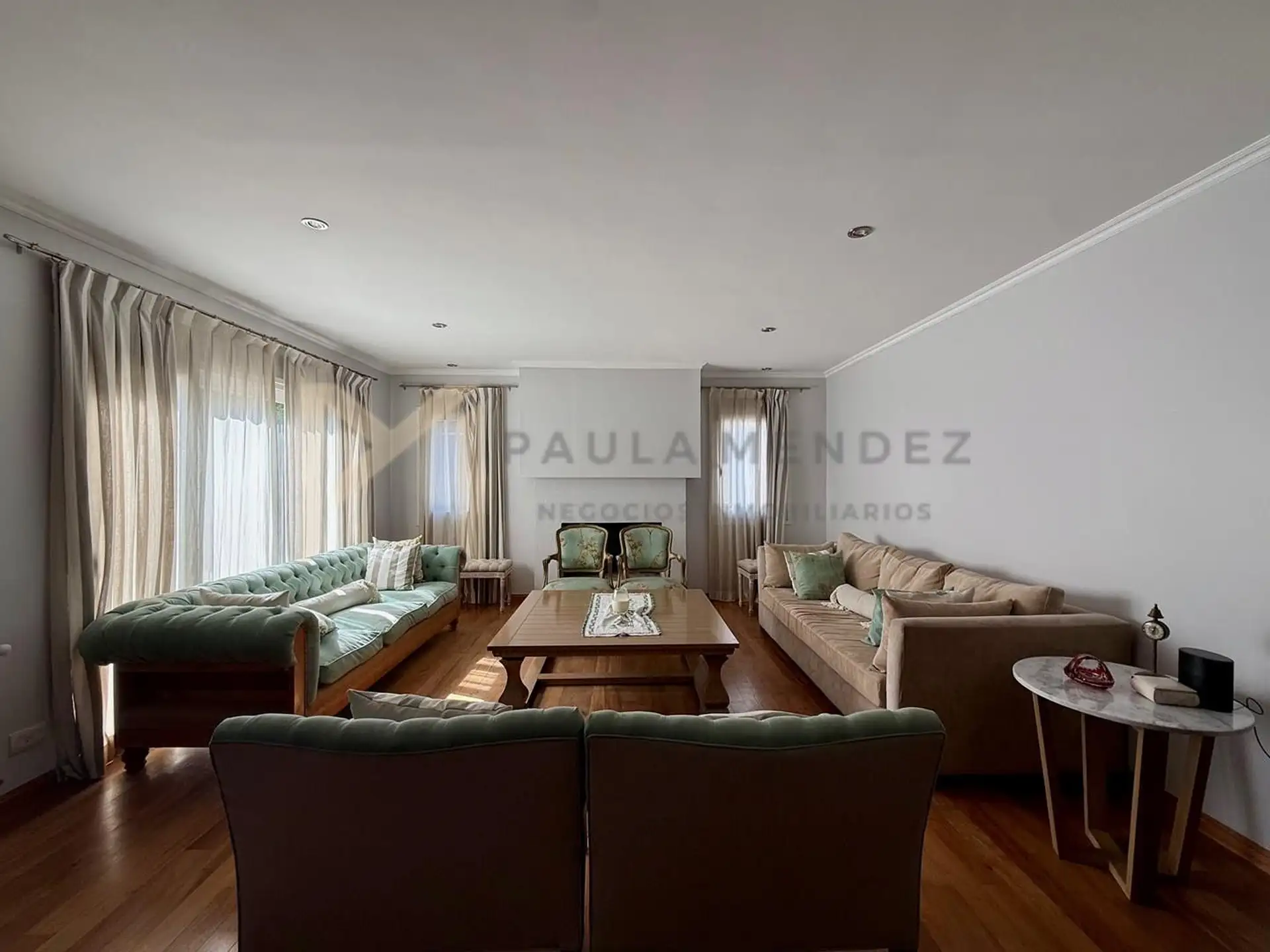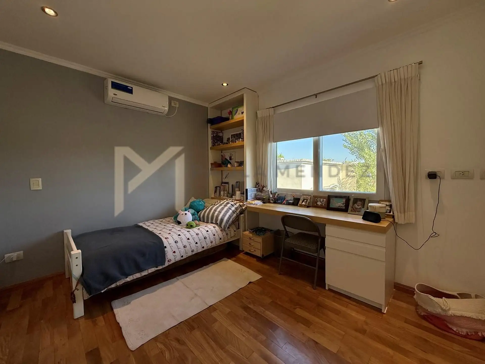 Casa en alquiler en La Horqueta, San Isidro, desarrollada sobre 2 lotes y con acceso por un jardín. Se distribuye en 3 plantas y cuenta con 5 dormitorios en las plantas superiores y 1 habitación adicional en planta baja. En planta baja hay hall de recepción con vestidor, toilette con ventana, living-comedor con grandes ventanales y chimenea, y un espacio diario que integra cocina, comedor y sector de TV. La cocina incluye barra desayunadora y electrodomésticos, además de un mueble de entretenimi