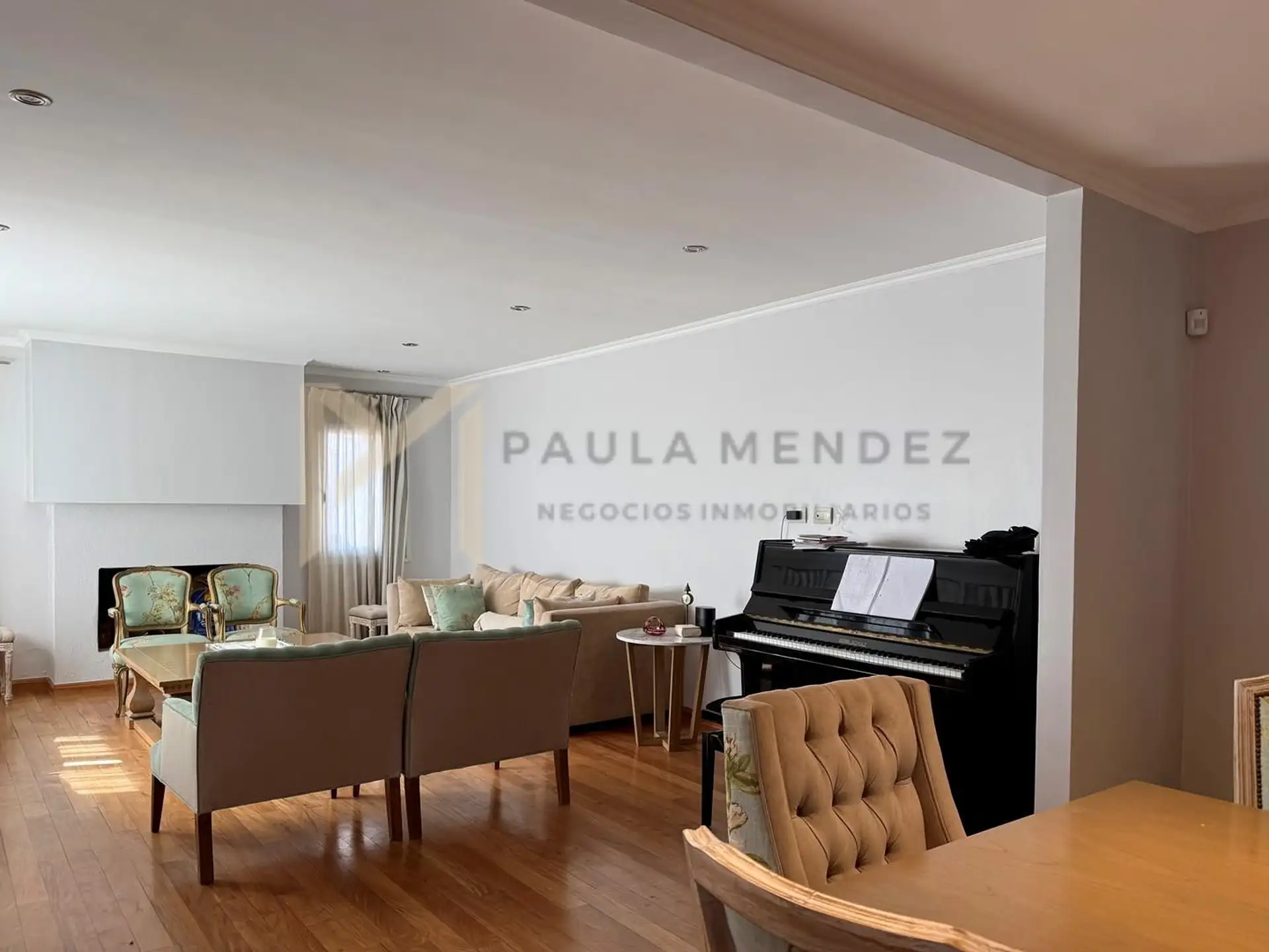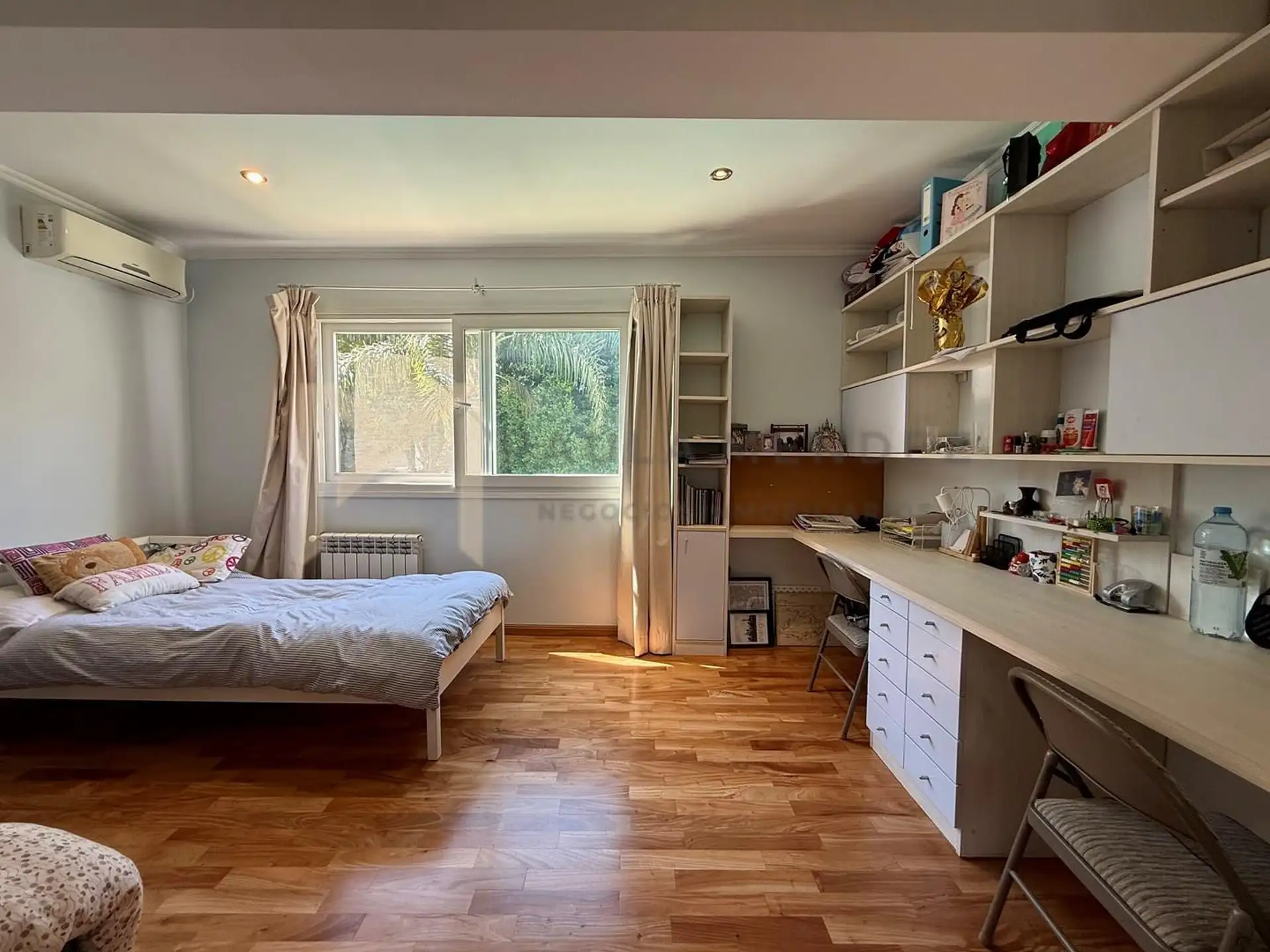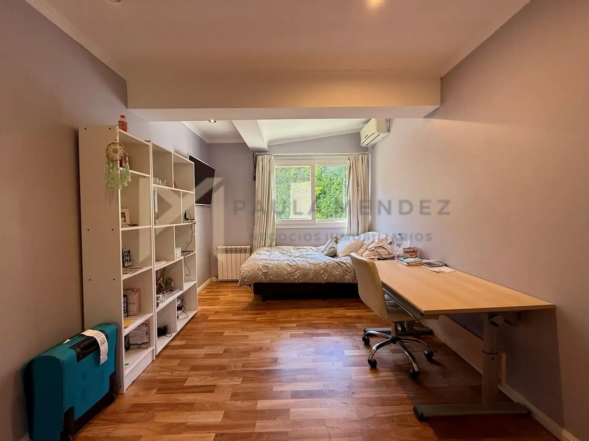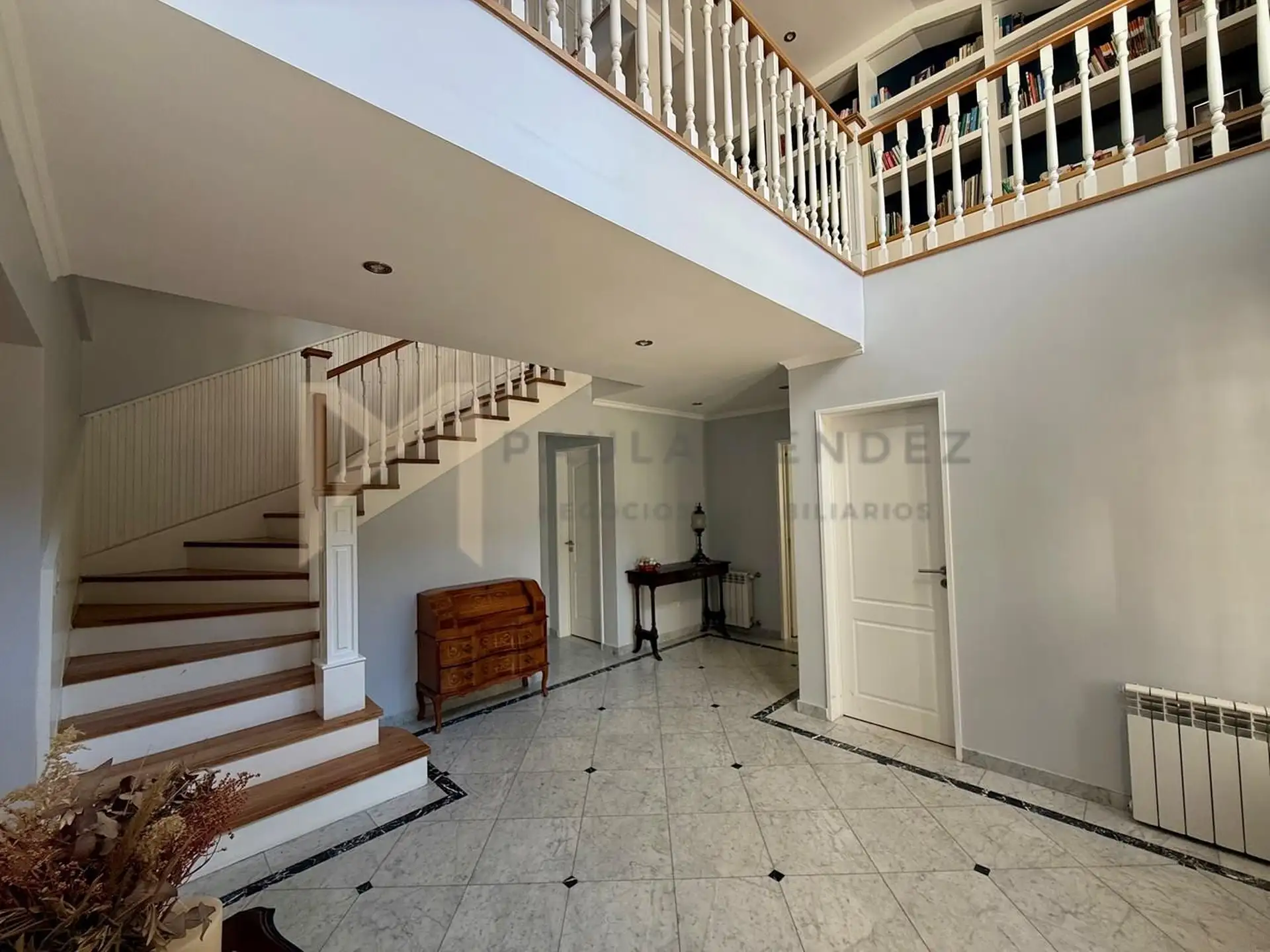 Casa en alquiler en La Horqueta, San Isidro, desarrollada sobre 2 lotes y con acceso por un jardín. Se distribuye en 3 plantas y cuenta con 5 dormitorios en las plantas superiores y 1 habitación adicional en planta baja. En planta baja hay hall de recepción con vestidor, toilette con ventana, living-comedor con grandes ventanales y chimenea, y un espacio diario que integra cocina, comedor y sector de TV. La cocina incluye barra desayunadora y electrodomésticos, además de un mueble de entretenimi