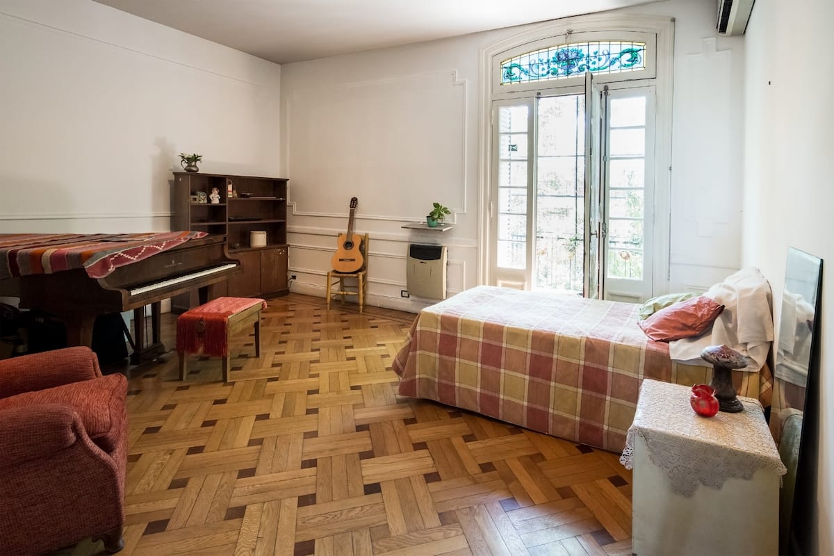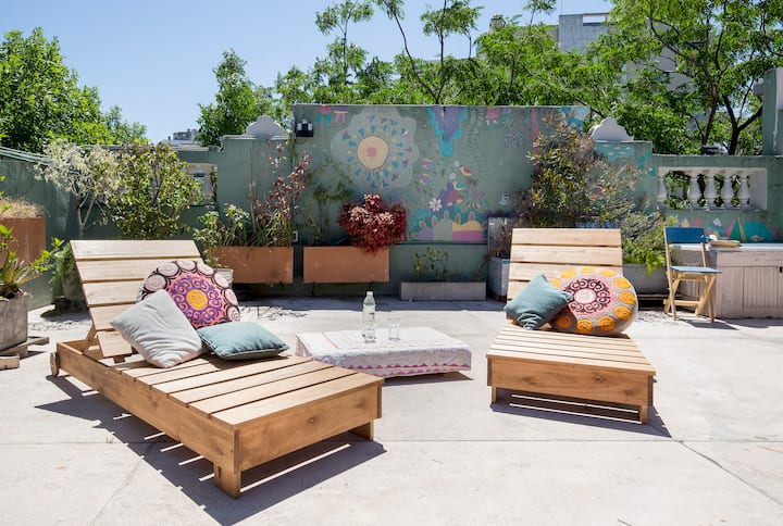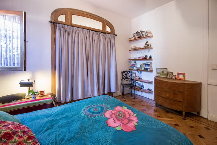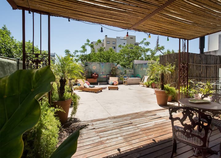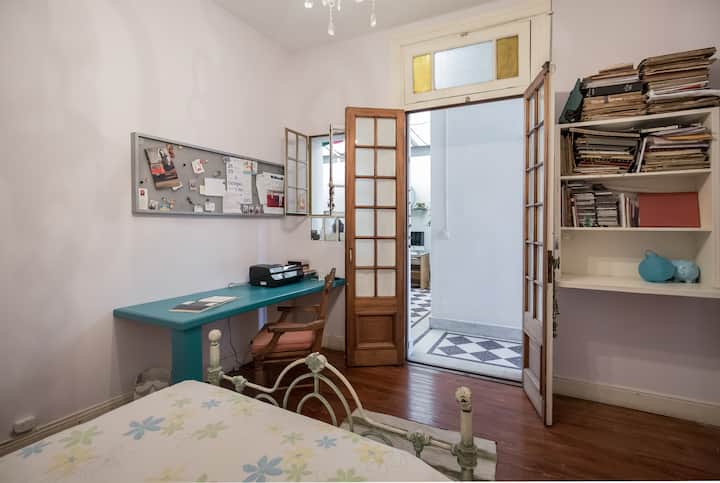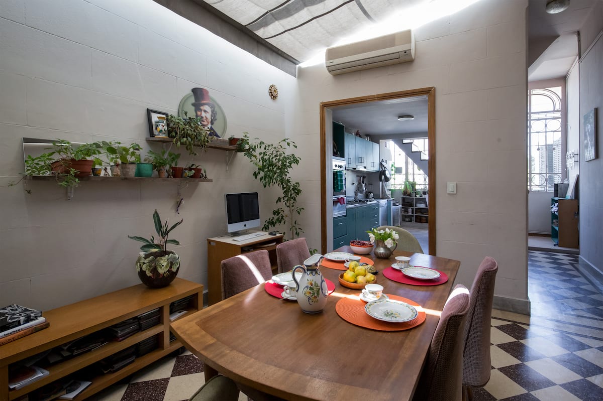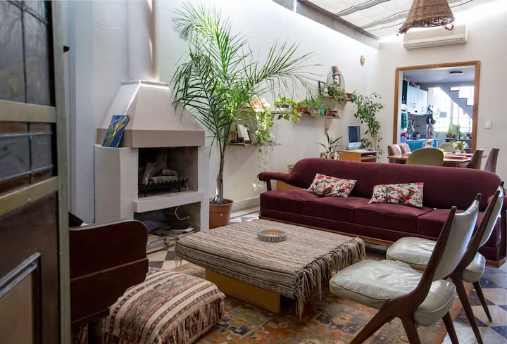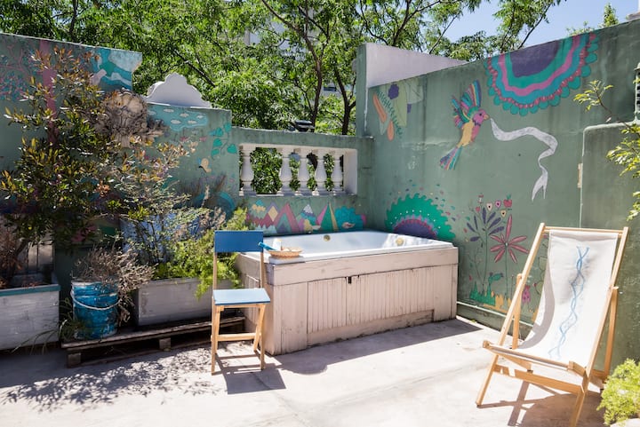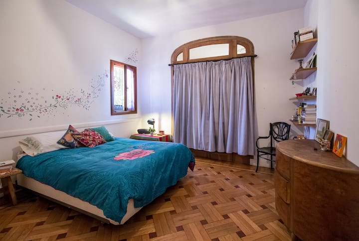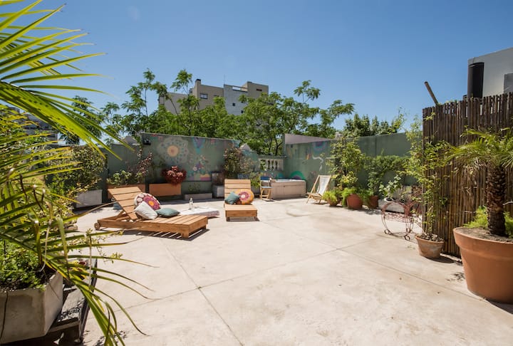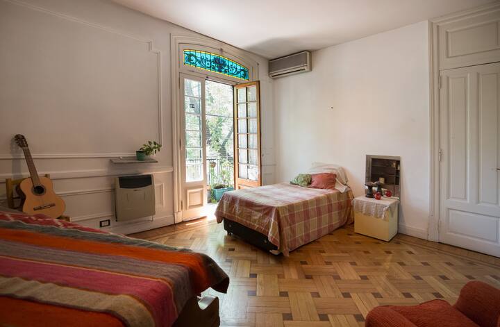 Casa antigua de estilo italiano en Chacarita, ubicada en el 1er piso por escalera. El espacio cuenta con varias habitaciones, con camas dobles y simples. Conserva pisos de pinotea, aberturas, herrería y vitrales originales, y tiene una terraza amplia con área de estar y parrilla interna para días de lluvia, además de jacuzzi y ducha exterior. La vivienda no permite fumar, excepto en la terraza.