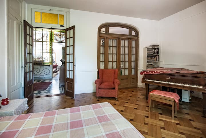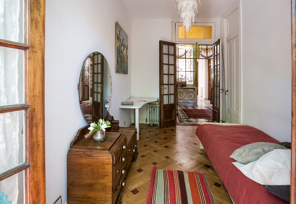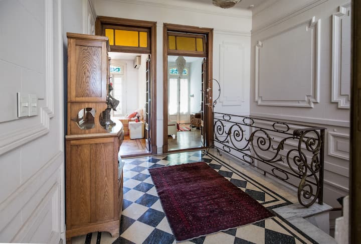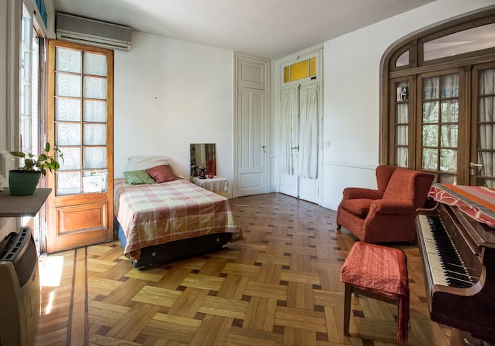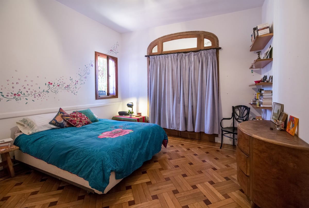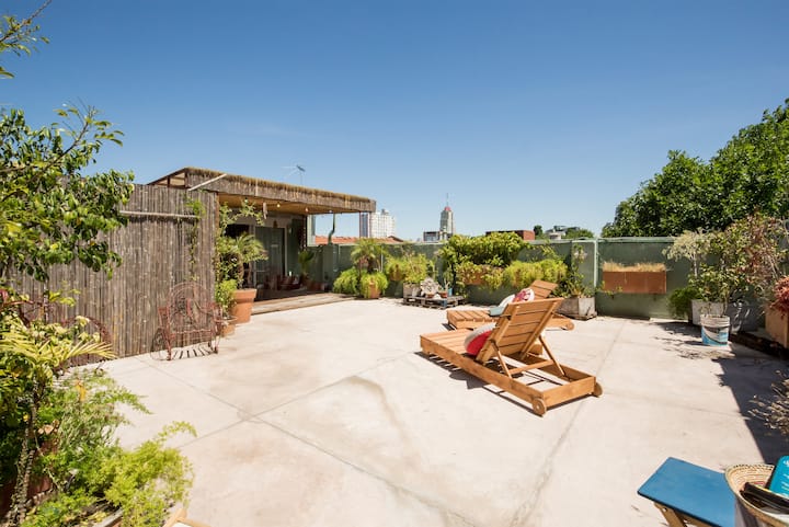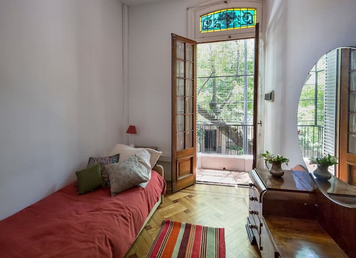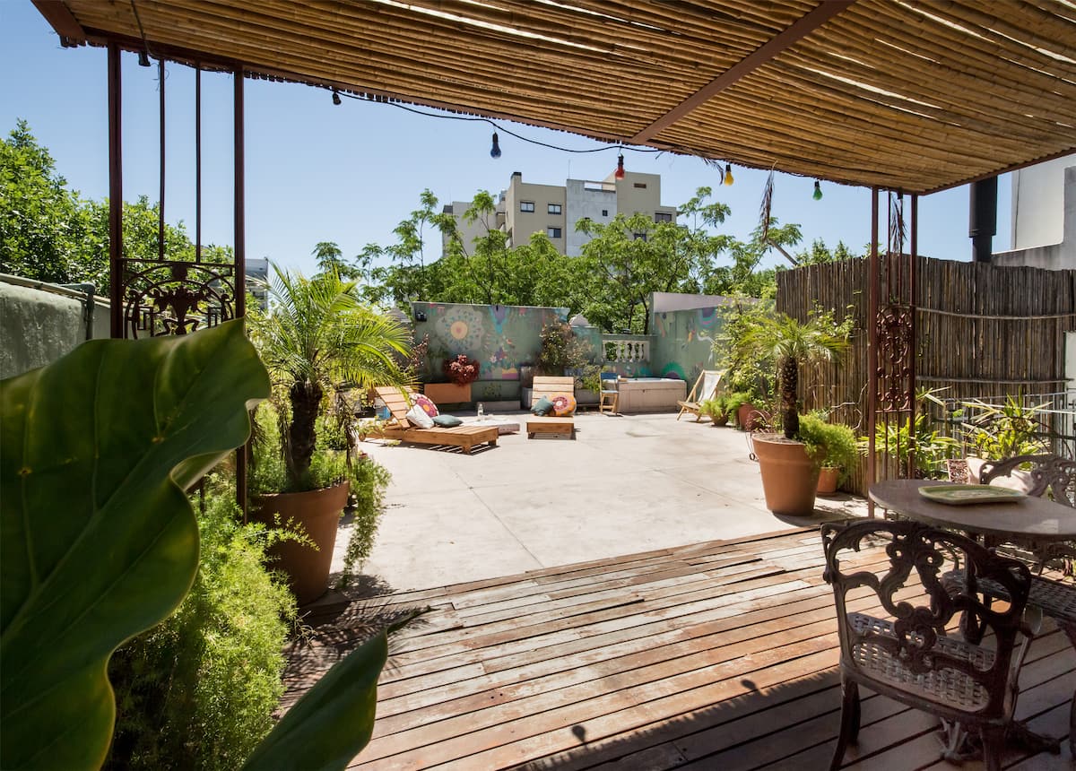 Casa antigua de estilo italiano en Chacarita, ubicada en el 1er piso por escalera. El espacio cuenta con varias habitaciones, con camas dobles y simples. Conserva pisos de pinotea, aberturas, herrería y vitrales originales, y tiene una terraza amplia con área de estar y parrilla interna para días de lluvia, además de jacuzzi y ducha exterior. La vivienda no permite fumar, excepto en la terraza.