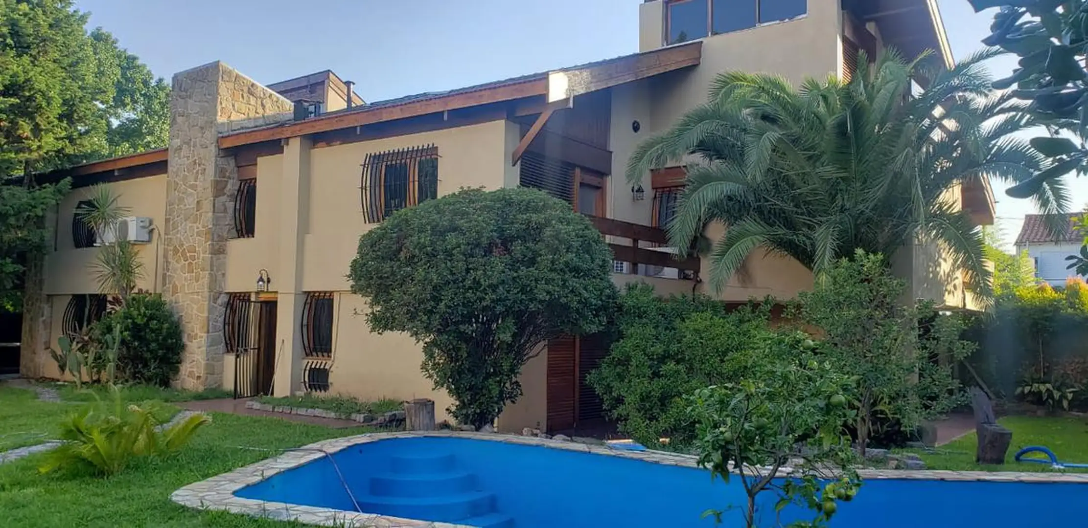 Chalet de 7 ambientes en alquiler en Martínez, con jardín y pileta. En planta baja cuenta con hall de recepción, toilette con ante baño, living de 7,5 x 9 m, comedor en desnivel, playroom de 4,5 x 7 m con ventanales al jardín, escritorio, cocina comedor con entrada independiente, garage cubierto para 2 autos, lavadero y habitación de servicio con baño. En planta alta hay 5 dormitorios en suite (uno al frente con entrepiso; el principal con vestidor de 5 x 6,5; otro con vestidor y jacuzzi; y uno