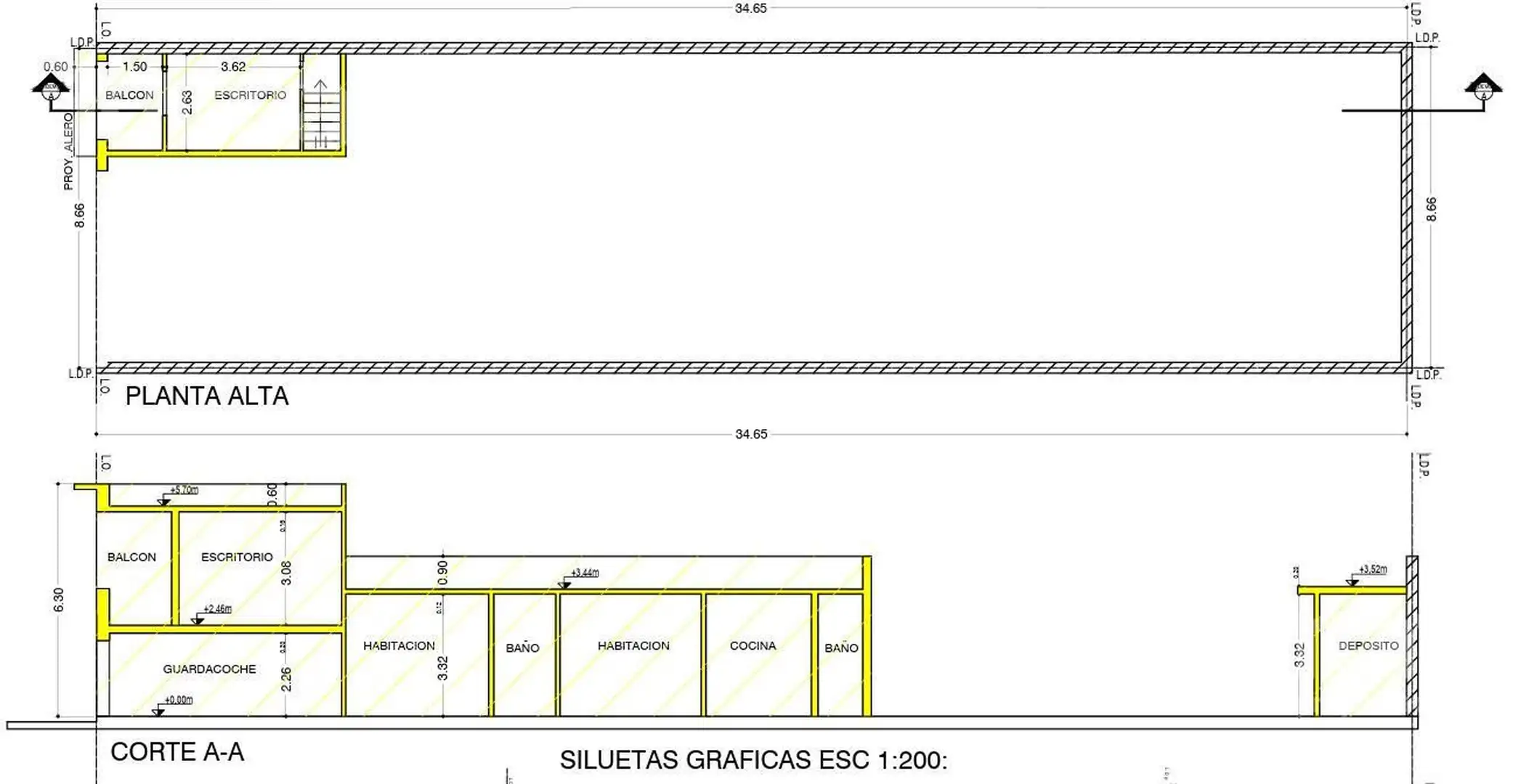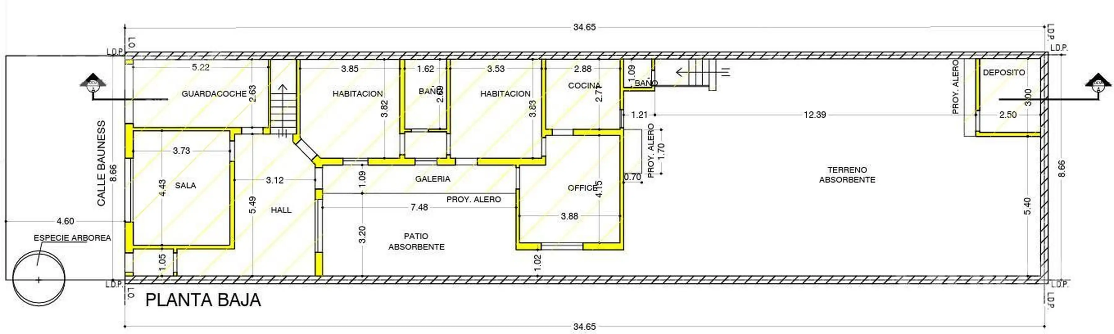 Casa para uso comercial o profesional en Villa Urquiza. No apta para vivienda. Lote propio de 8,66 x 34,64 m, con 300 m² totales y 179 m² cubiertos, a reciclar. Se desarrolla con un patio descubierto al contrafrente de 8,66 x 12,39 m. Tiene sala al frente de 4,43 x 3,73 m, hall de distribución y cochera fija cubierta, y cuenta con 6 dormitorios. A dos cuadras de Av. Triunvirato.