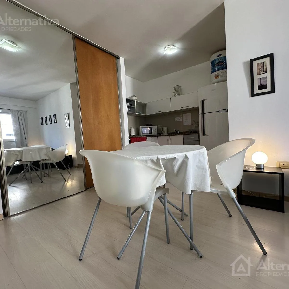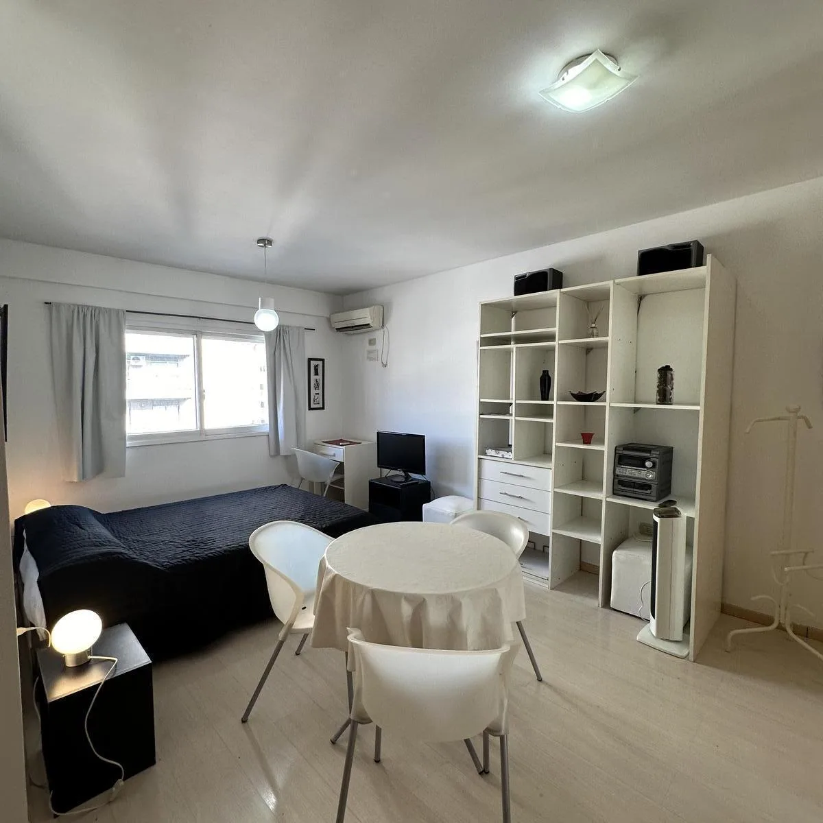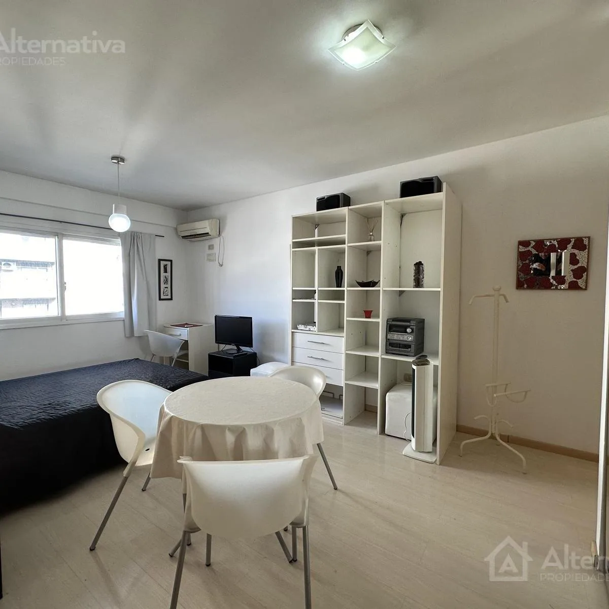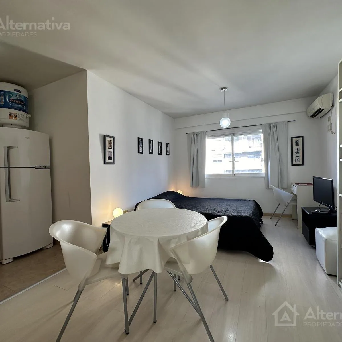 Departamento monoambiente amoblado para alquiler temporario en Almagro. El período máximo es de 3 meses, con posibilidad de renovación. La unidad cuenta con aire acondicionado split, sistema de doble ventana, mesa con 3 sillas, TV Smart, sistema de sonido, estufa eléctrica y placard empotrado con frente espejado; la cocina integrada incluye heladera con freezer, termotanque eléctrico, anafe eléctrico de 2 hornallas, horno, microondas, cafetera, pava eléctrica y utensilios. El baño es completo co