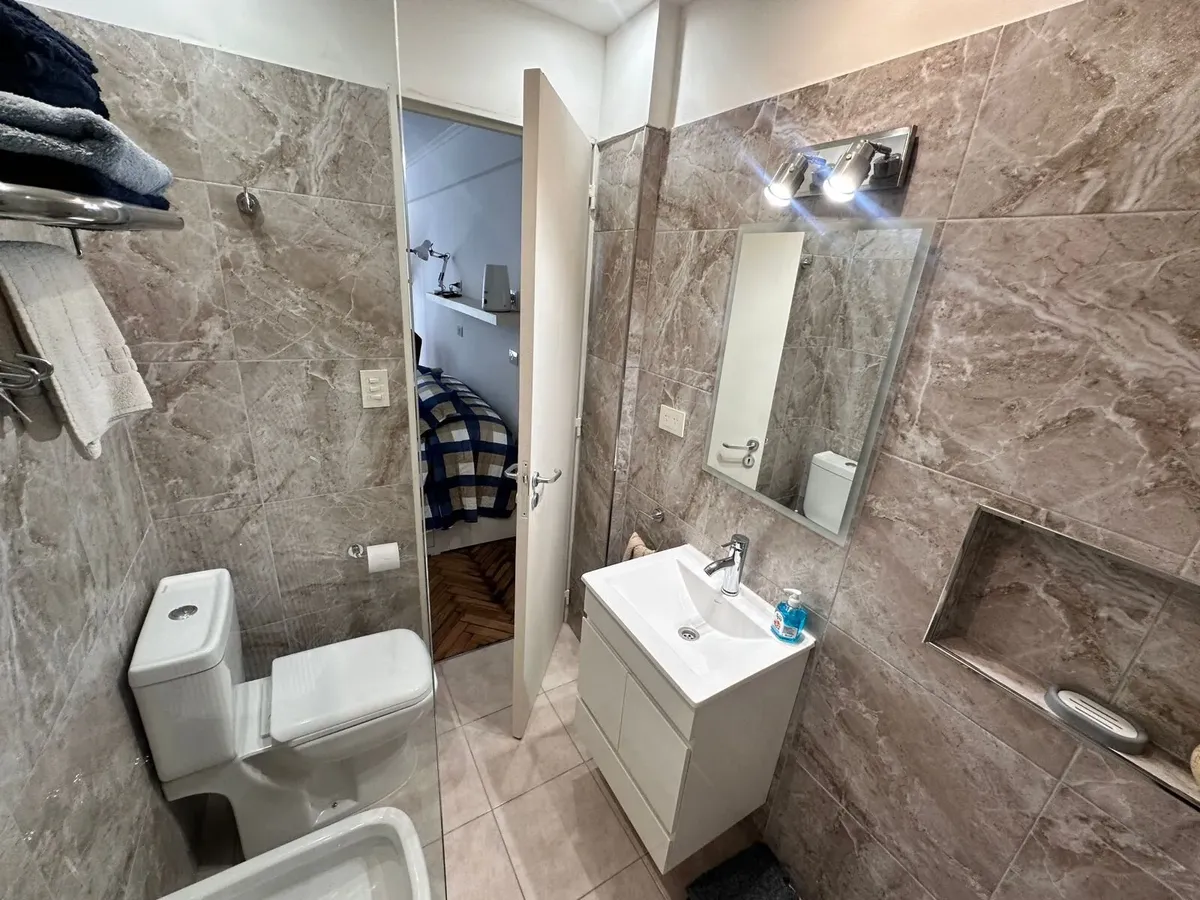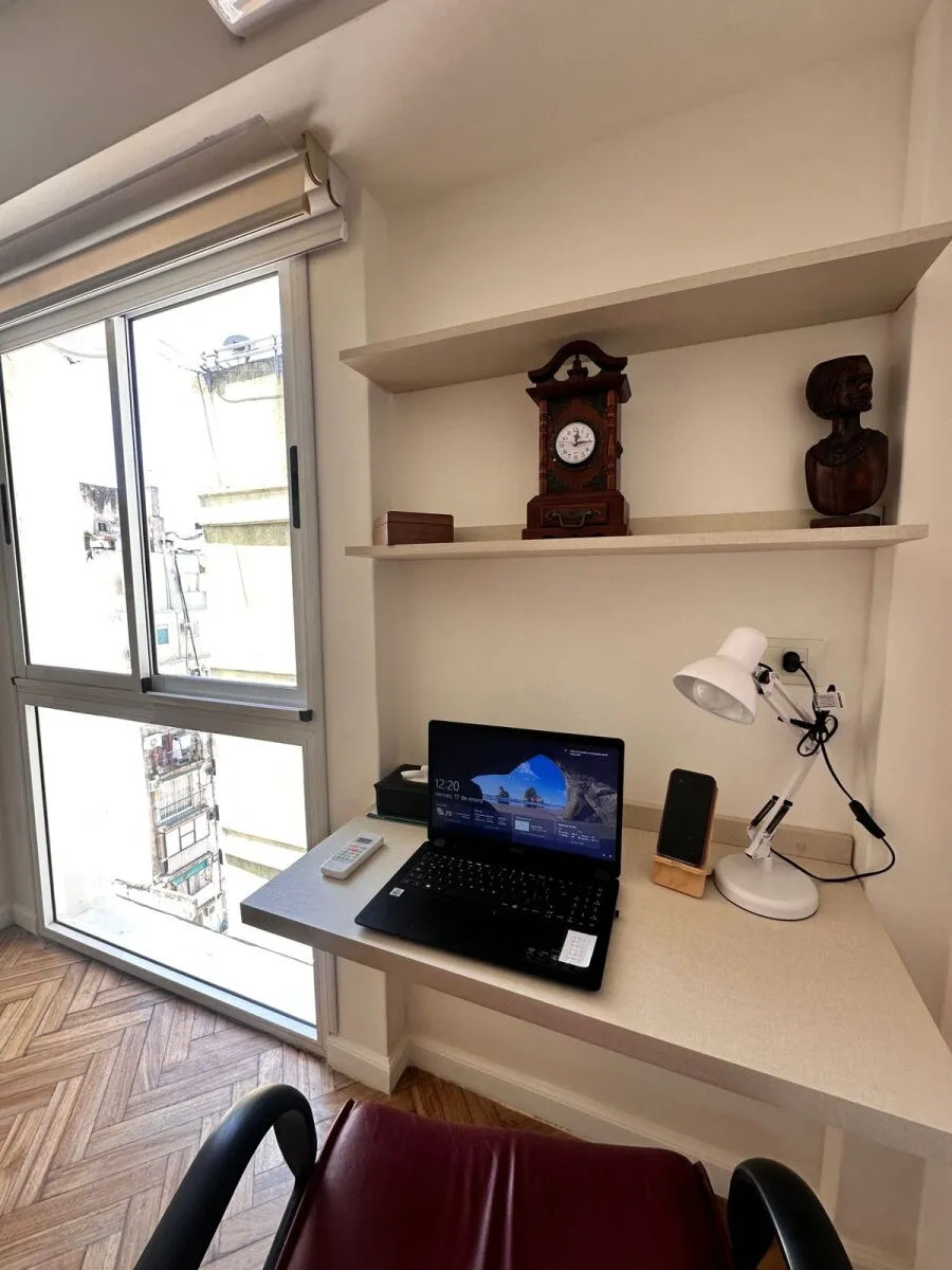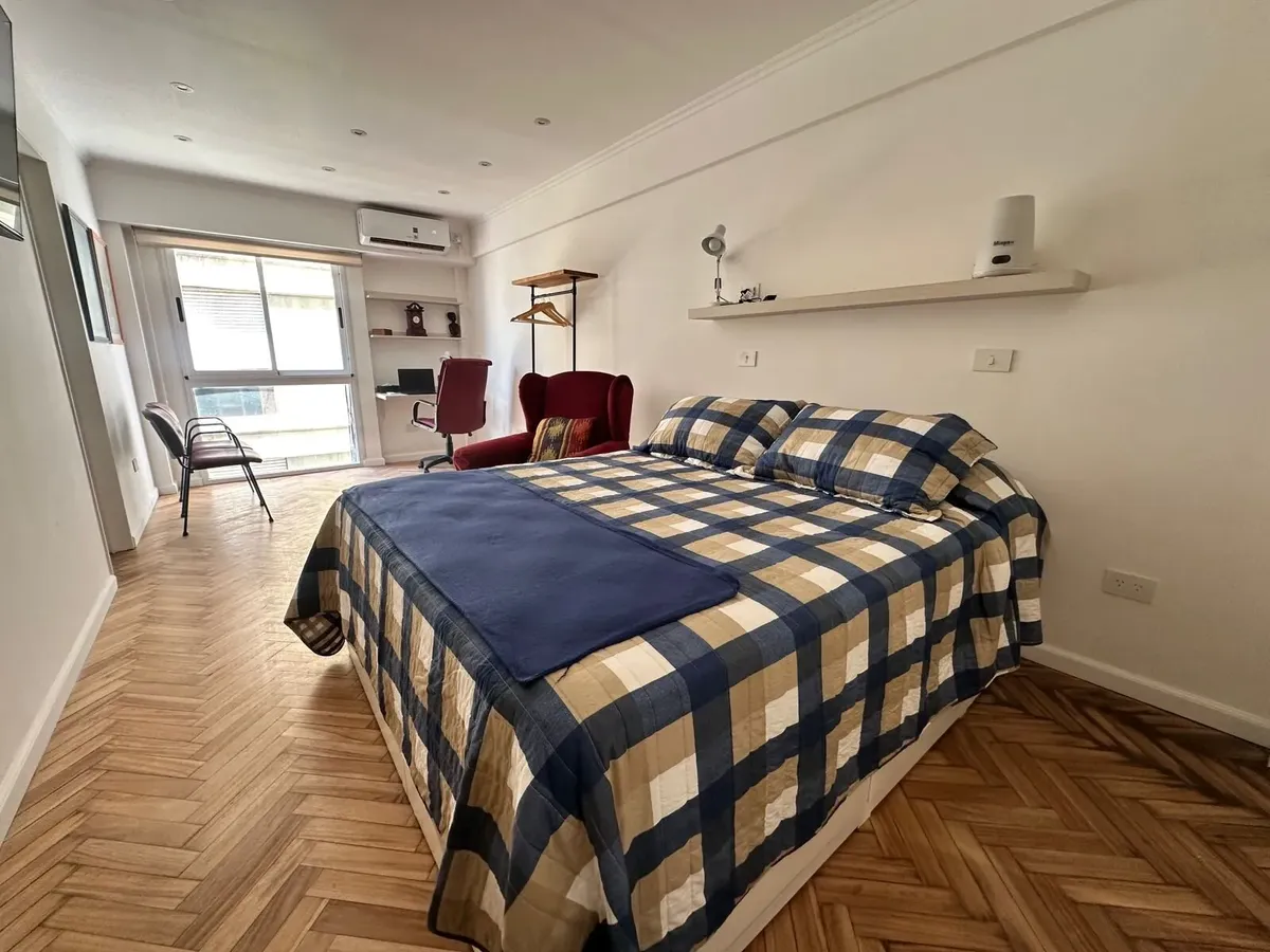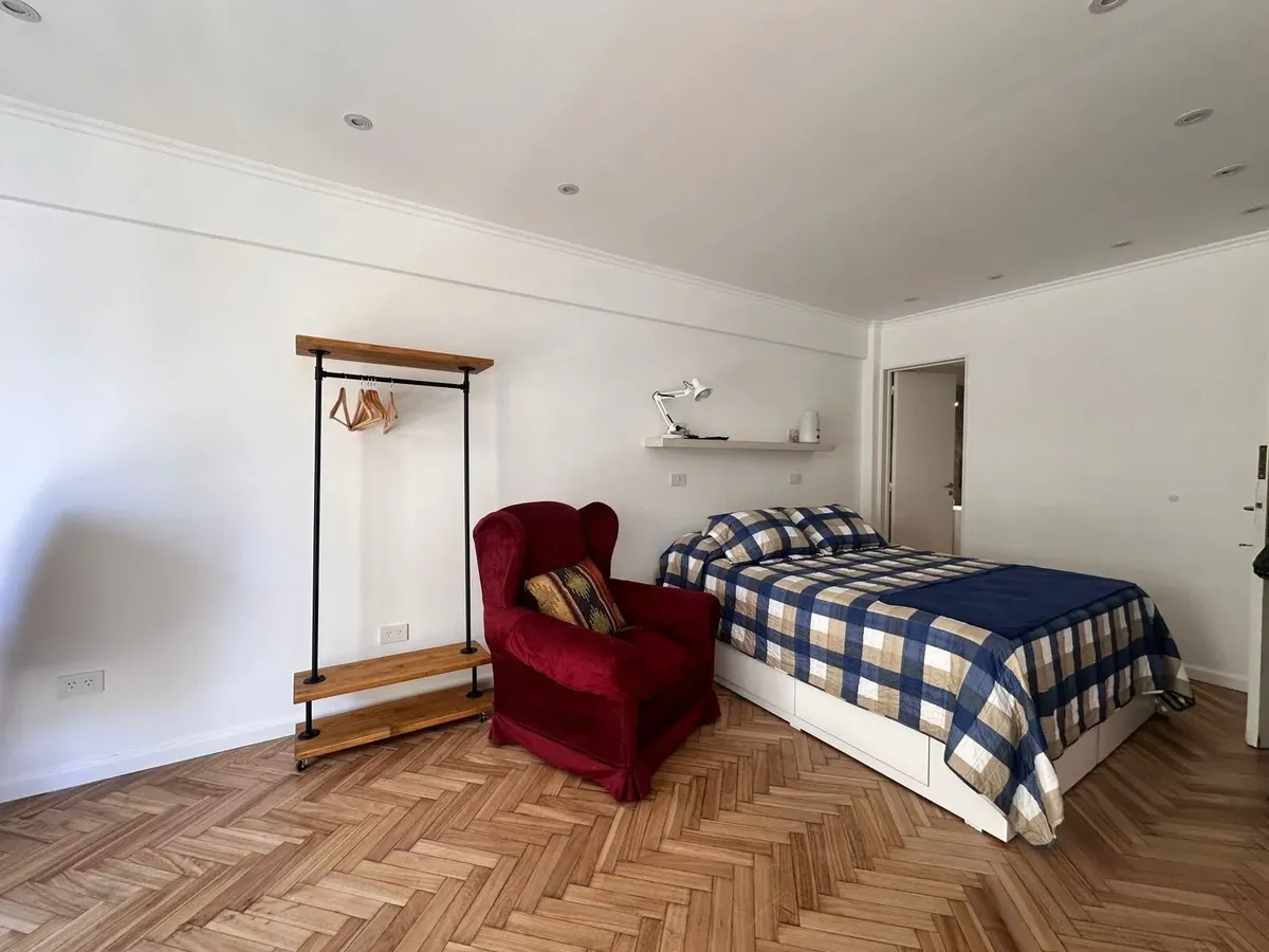 Monoambiente de 30 m² en Balvanera, en piso alto. Cocina refaccionada separada con cocina y horno a gas, microondas y heladera con freezer; dormitorio con cama doble con cajonera y escritorio. Baño con ducha y mampara, aire acondicionado frío-calor y agua caliente individual. Alquiler: USD 450 + servicios. Contrato de 6 meses.
