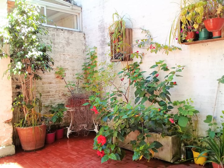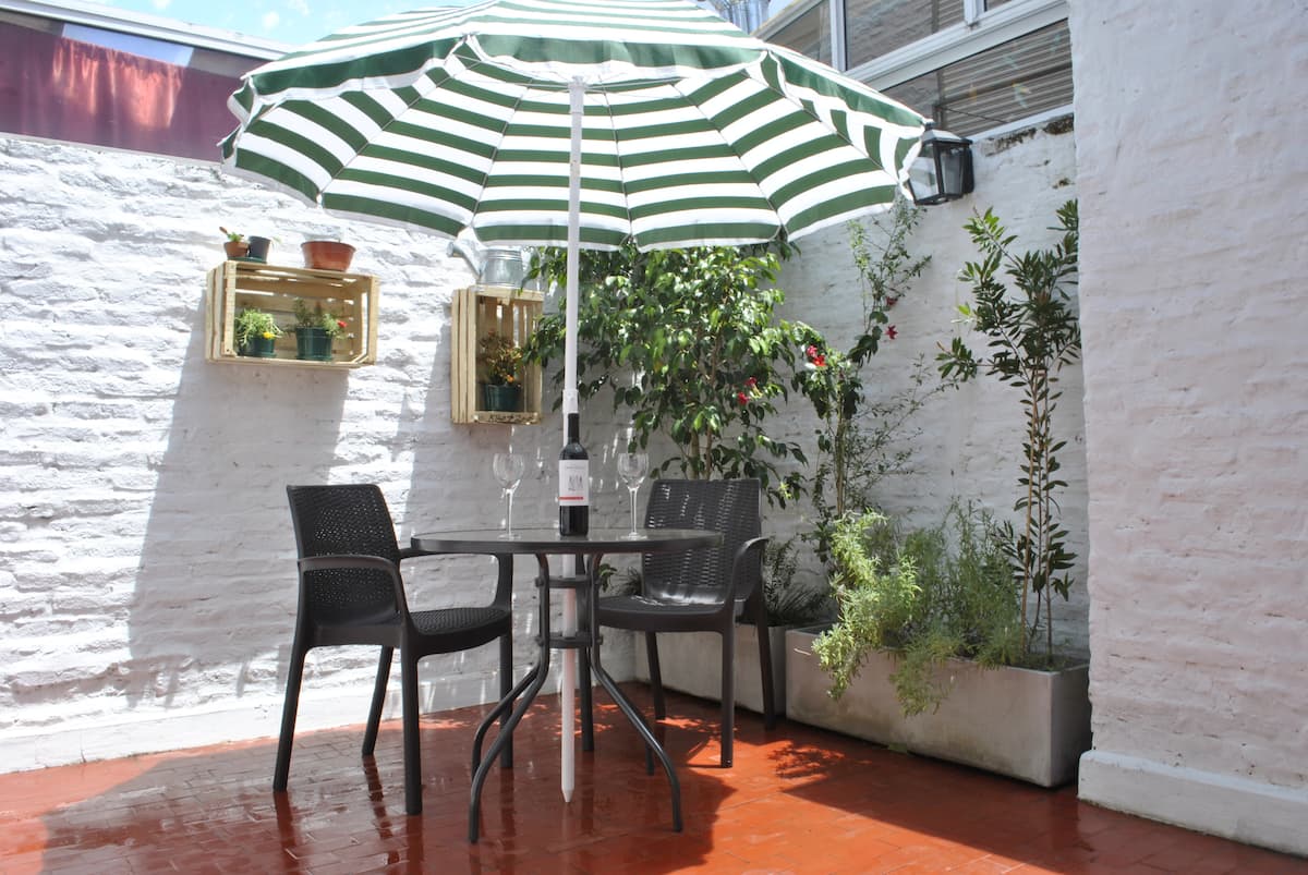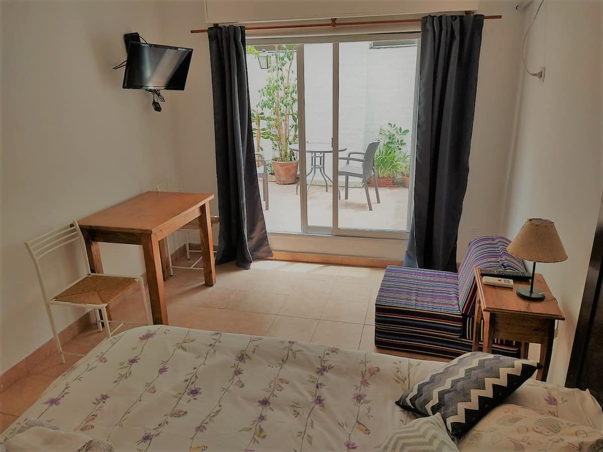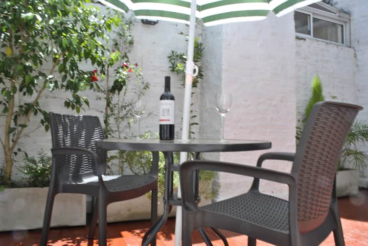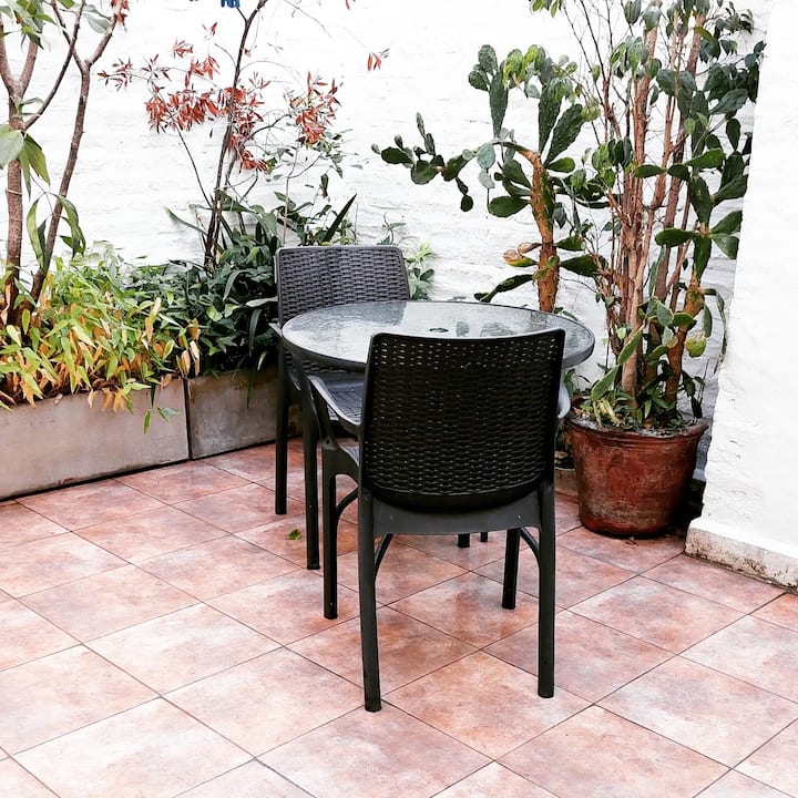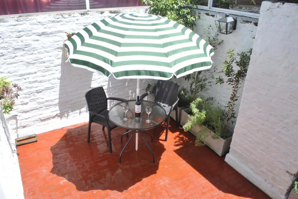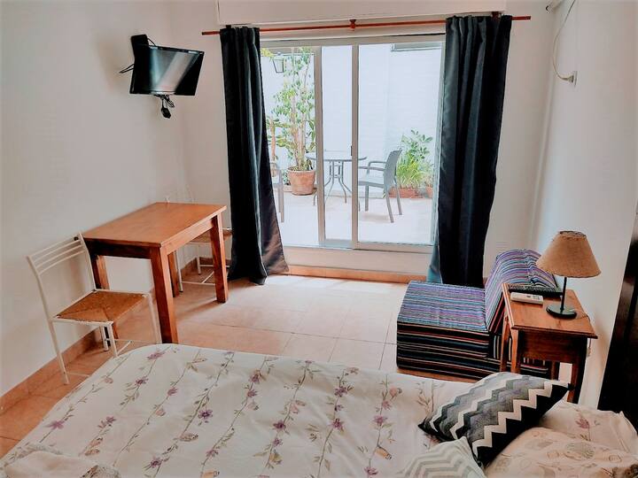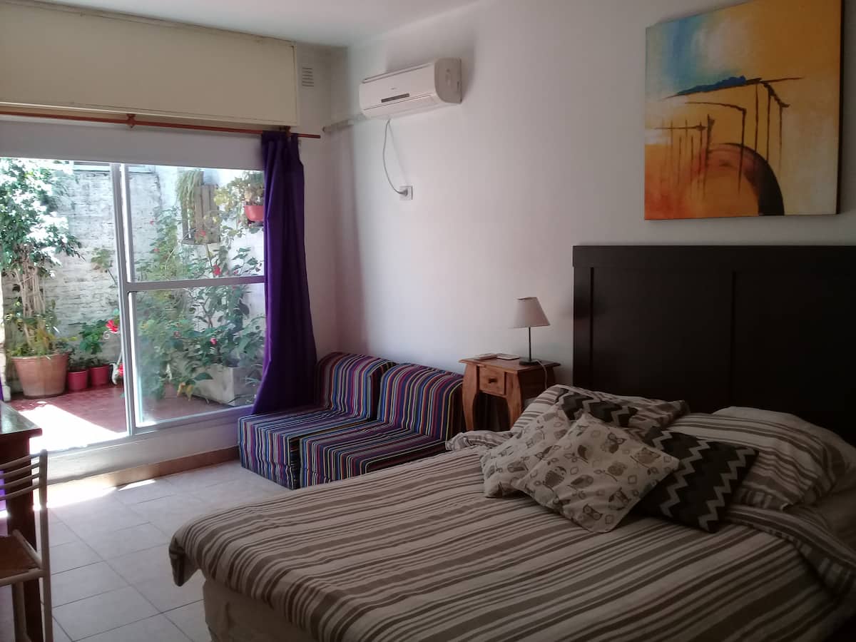 Monoambiente en Balvanera, en el 1er piso de un edificio tranquilo sobre una calle lateral de Av. Corrientes. Dispone de un ambiente con cama doble, placard doble y cajones incorporados, además de caja de seguridad, TV e internet WiFi. Cuenta con aire acondicionado frío/calor y cocina equipada con heladera con freezer, cocina, microondas, cafetera y tostadora. Incluye patio privado con mesa y sillas para uso al aire libre.