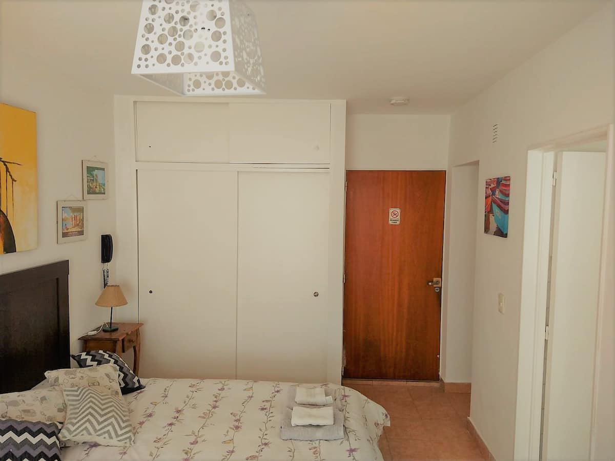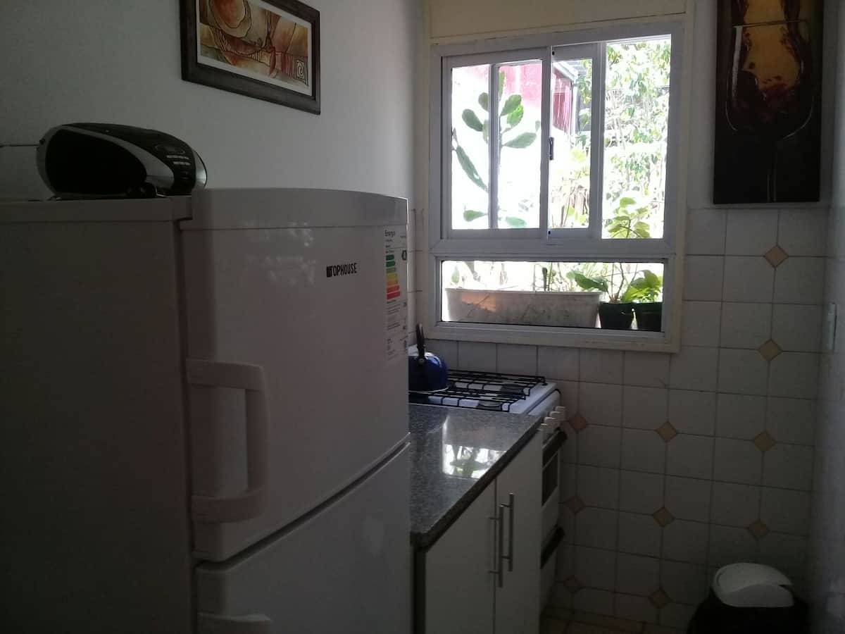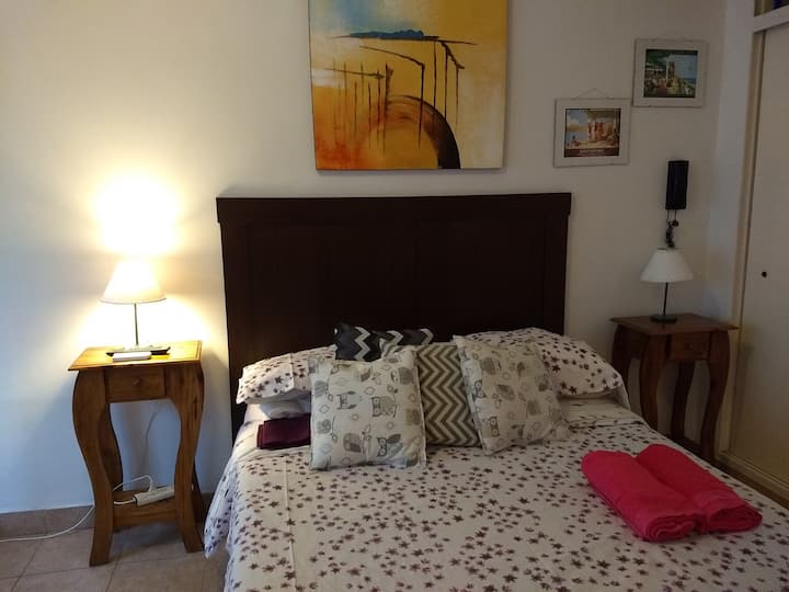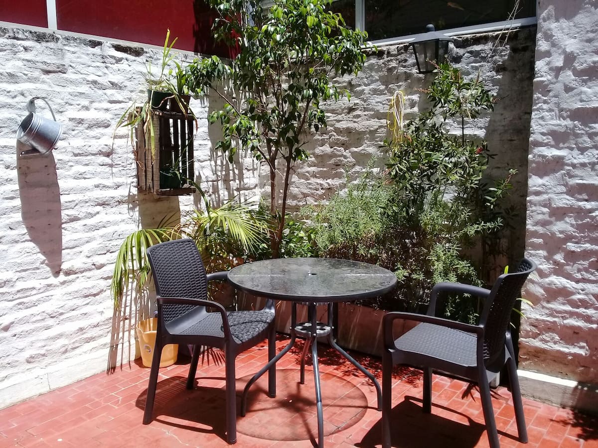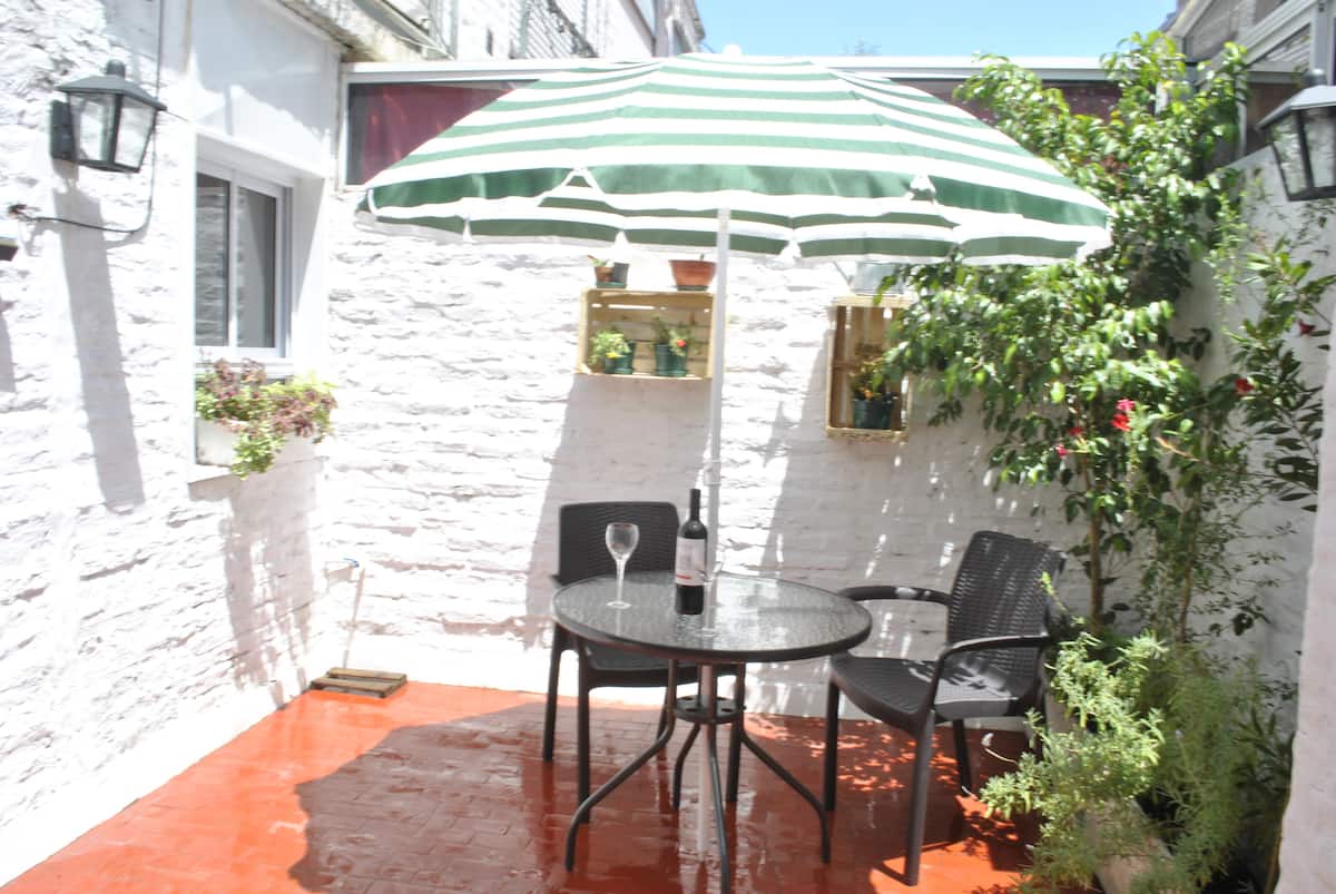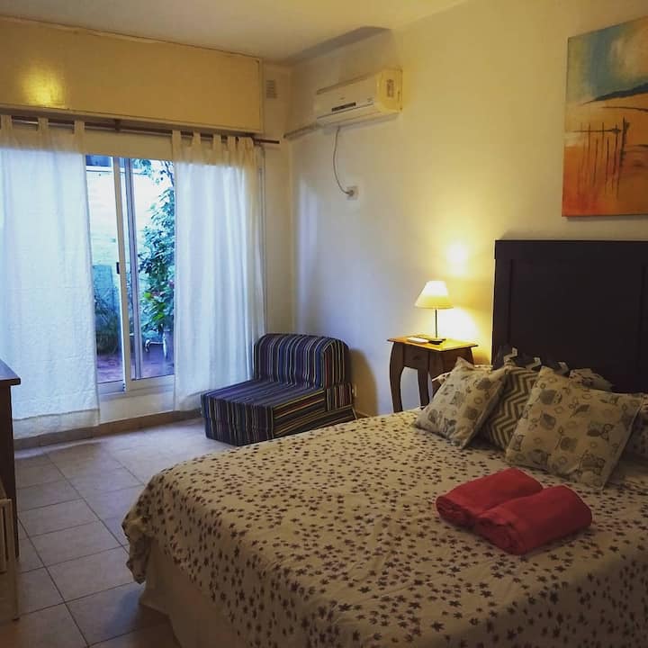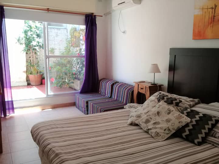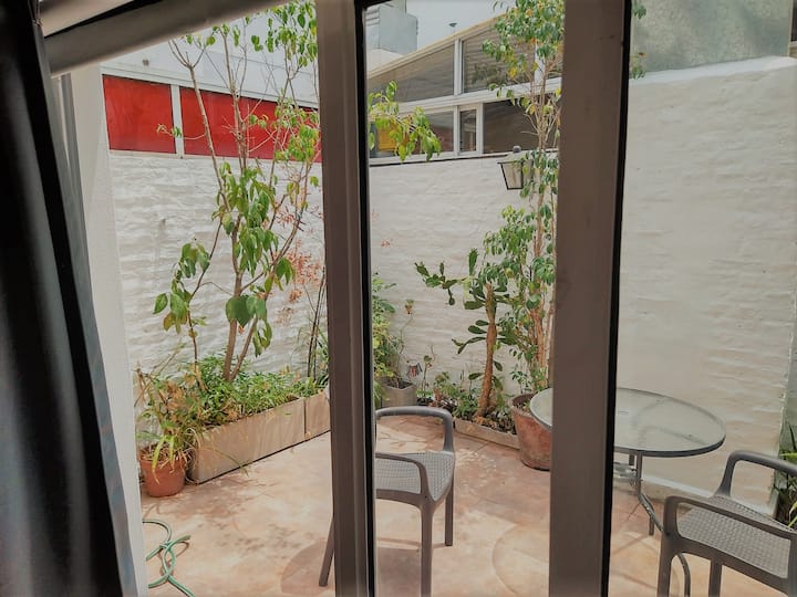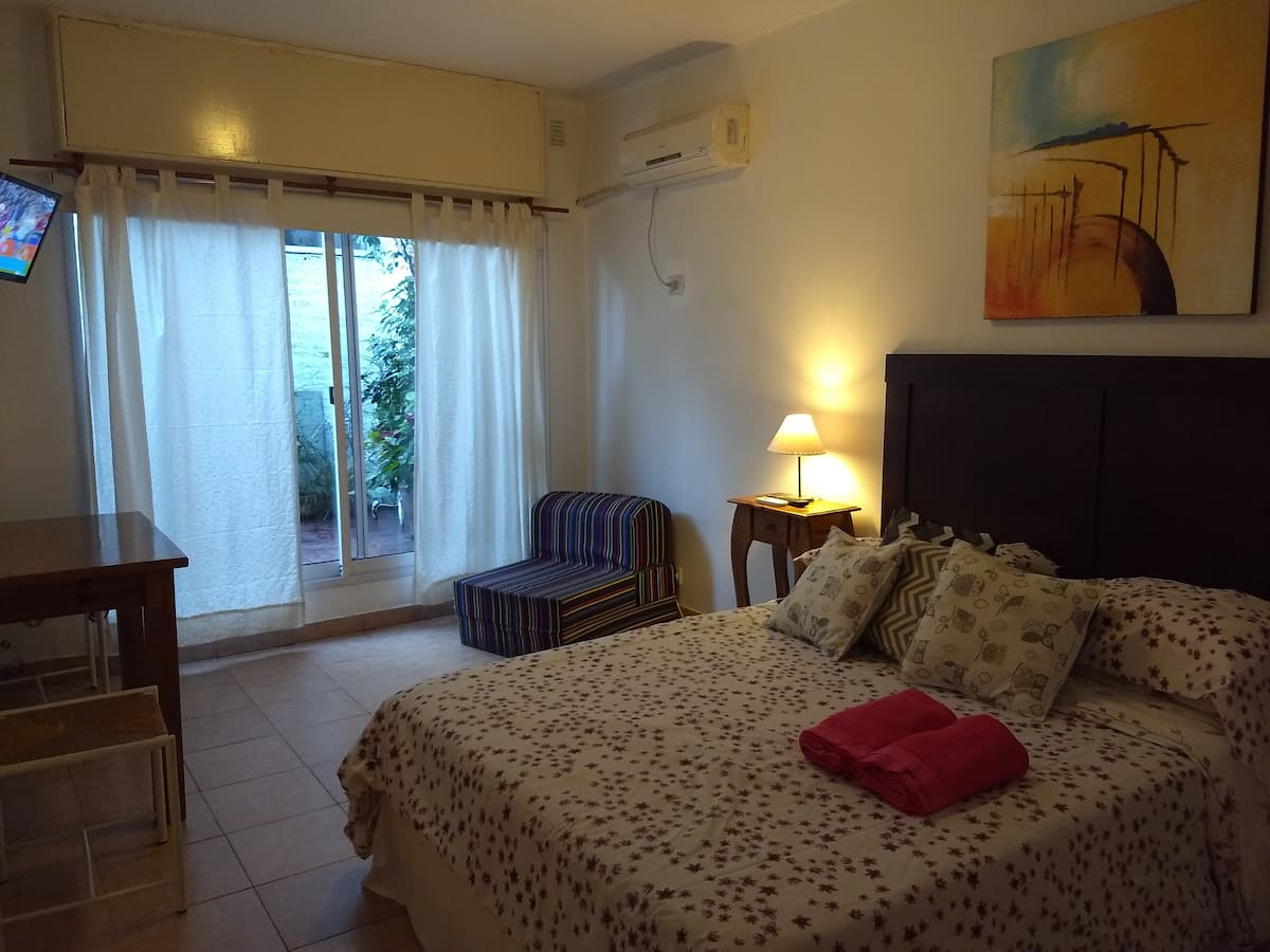 Monoambiente en Balvanera, en el 1er piso de un edificio tranquilo sobre una calle lateral de Av. Corrientes. Dispone de un ambiente con cama doble, placard doble y cajones incorporados, además de caja de seguridad, TV e internet WiFi. Cuenta con aire acondicionado frío/calor y cocina equipada con heladera con freezer, cocina, microondas, cafetera y tostadora. Incluye patio privado con mesa y sillas para uso al aire libre.