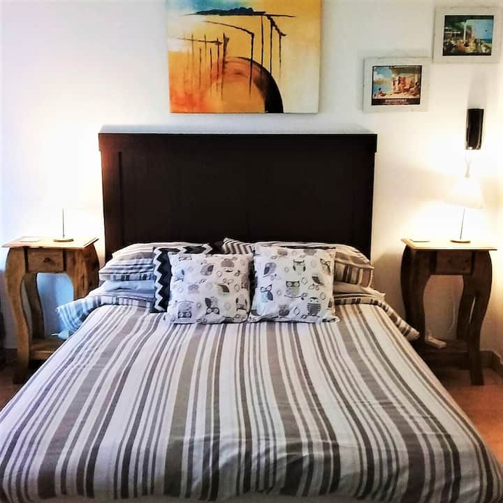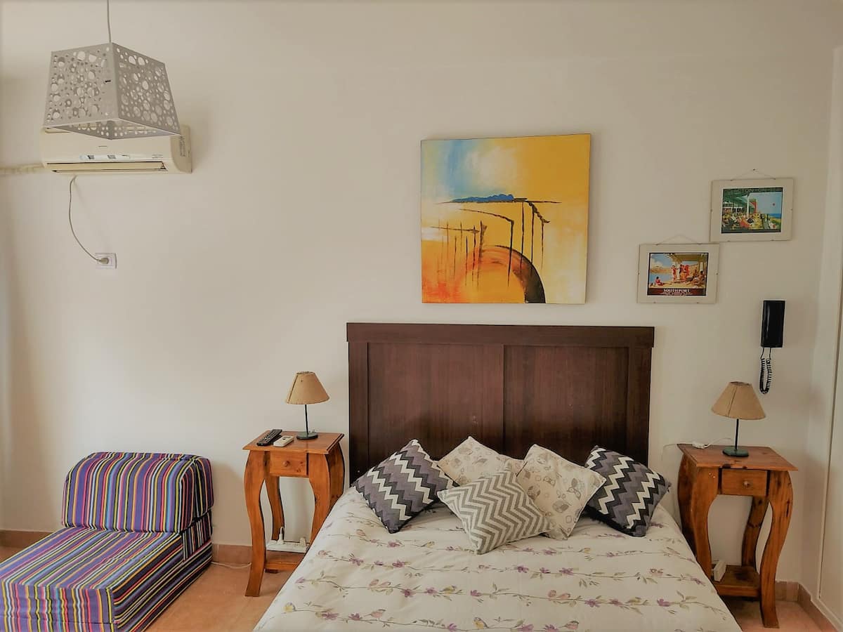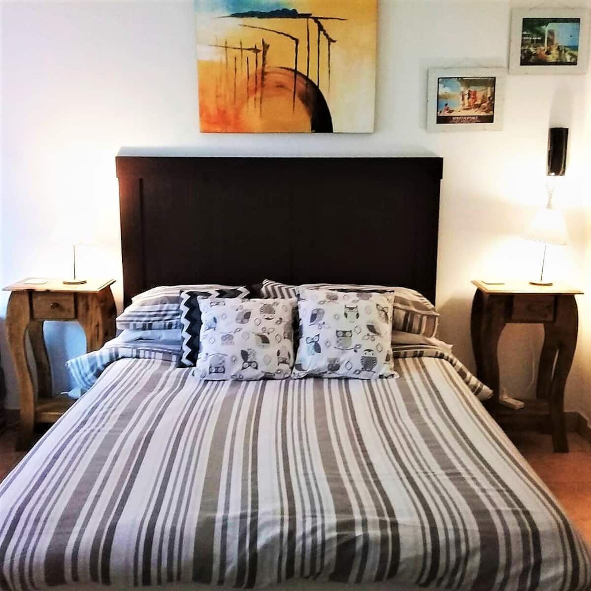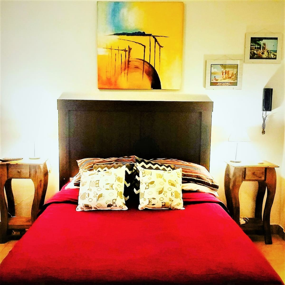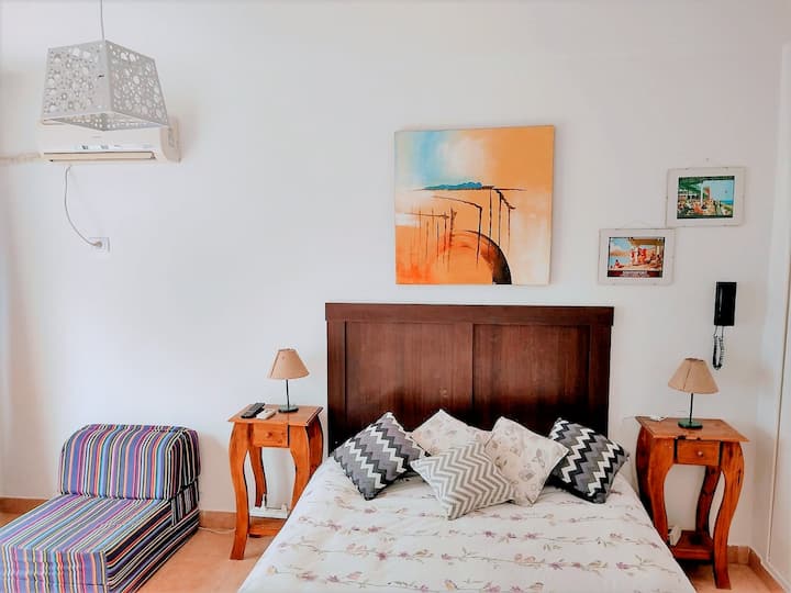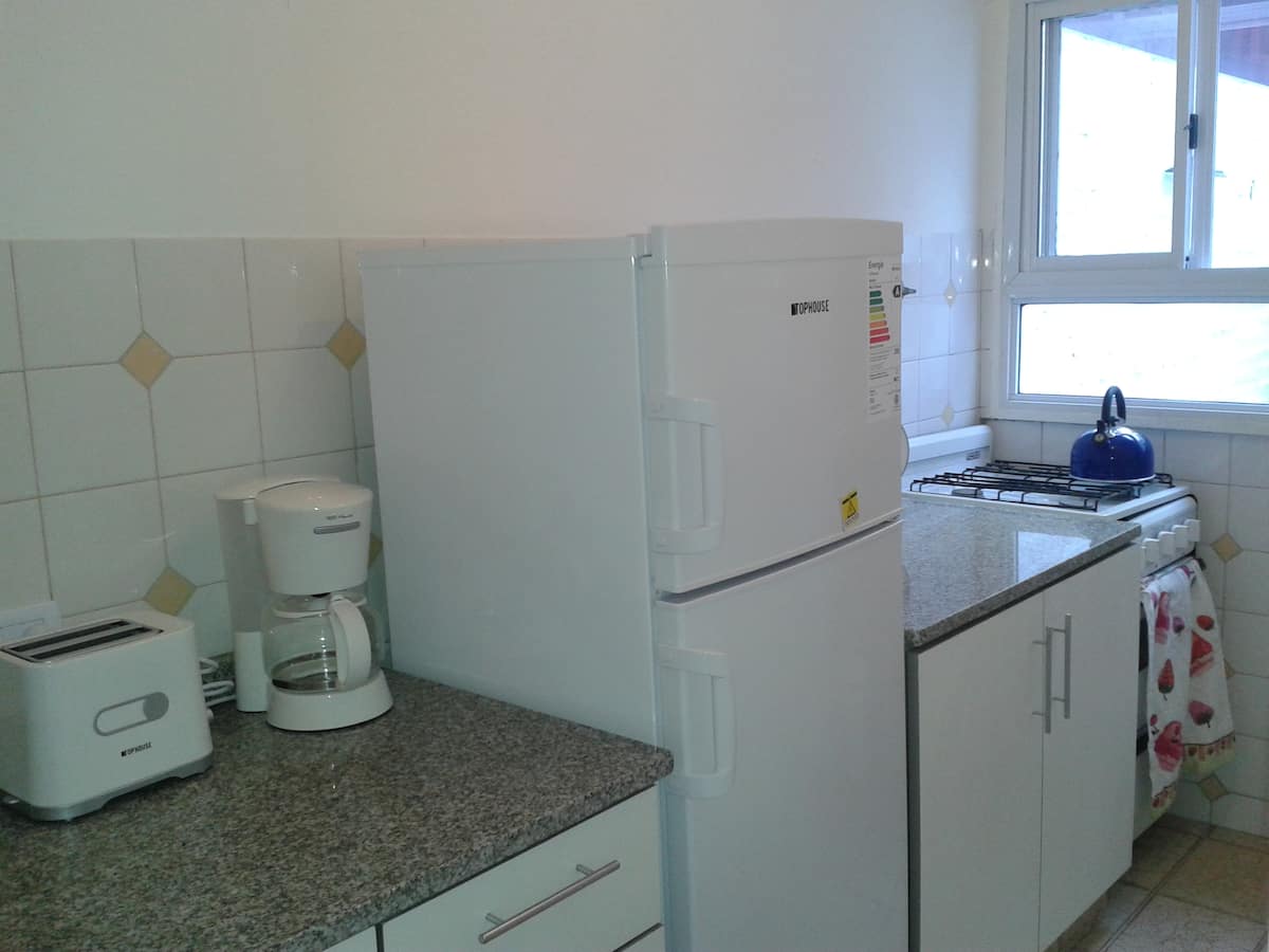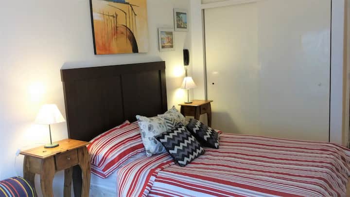 Monoambiente en Balvanera, en el 1er piso de un edificio tranquilo sobre una calle lateral de Av. Corrientes. Dispone de un ambiente con cama doble, placard doble y cajones incorporados, además de caja de seguridad, TV e internet WiFi. Cuenta con aire acondicionado frío/calor y cocina equipada con heladera con freezer, cocina, microondas, cafetera y tostadora. Incluye patio privado con mesa y sillas para uso al aire libre.