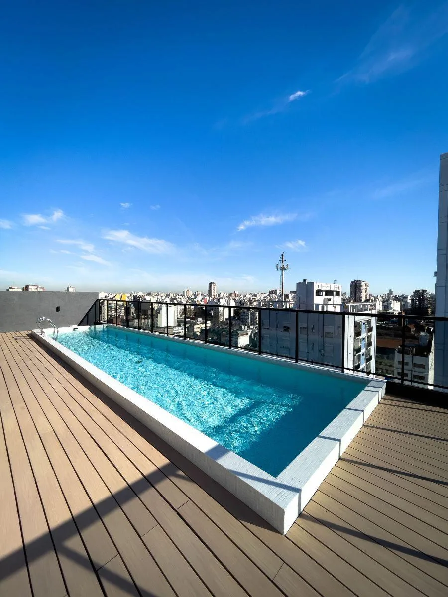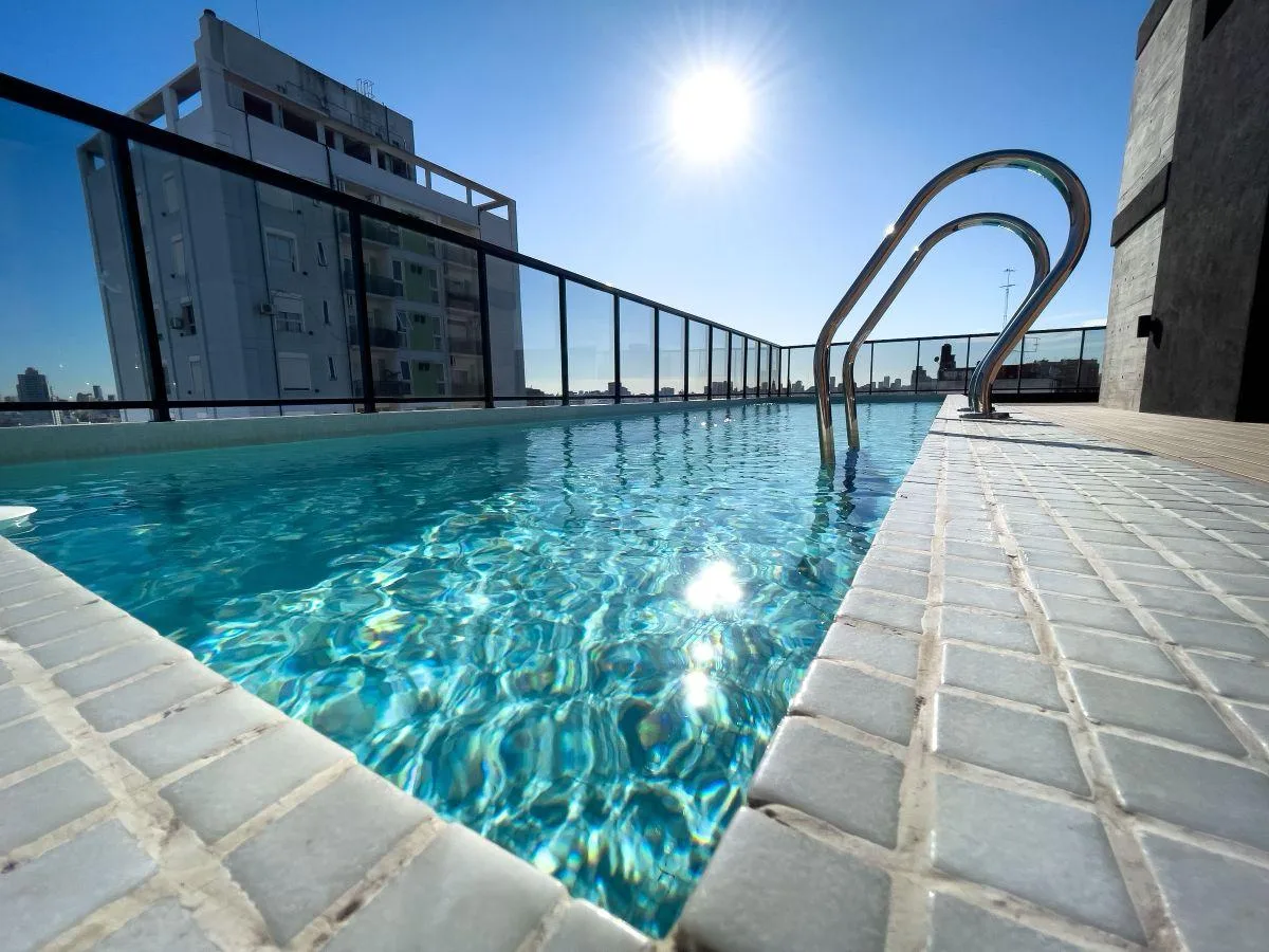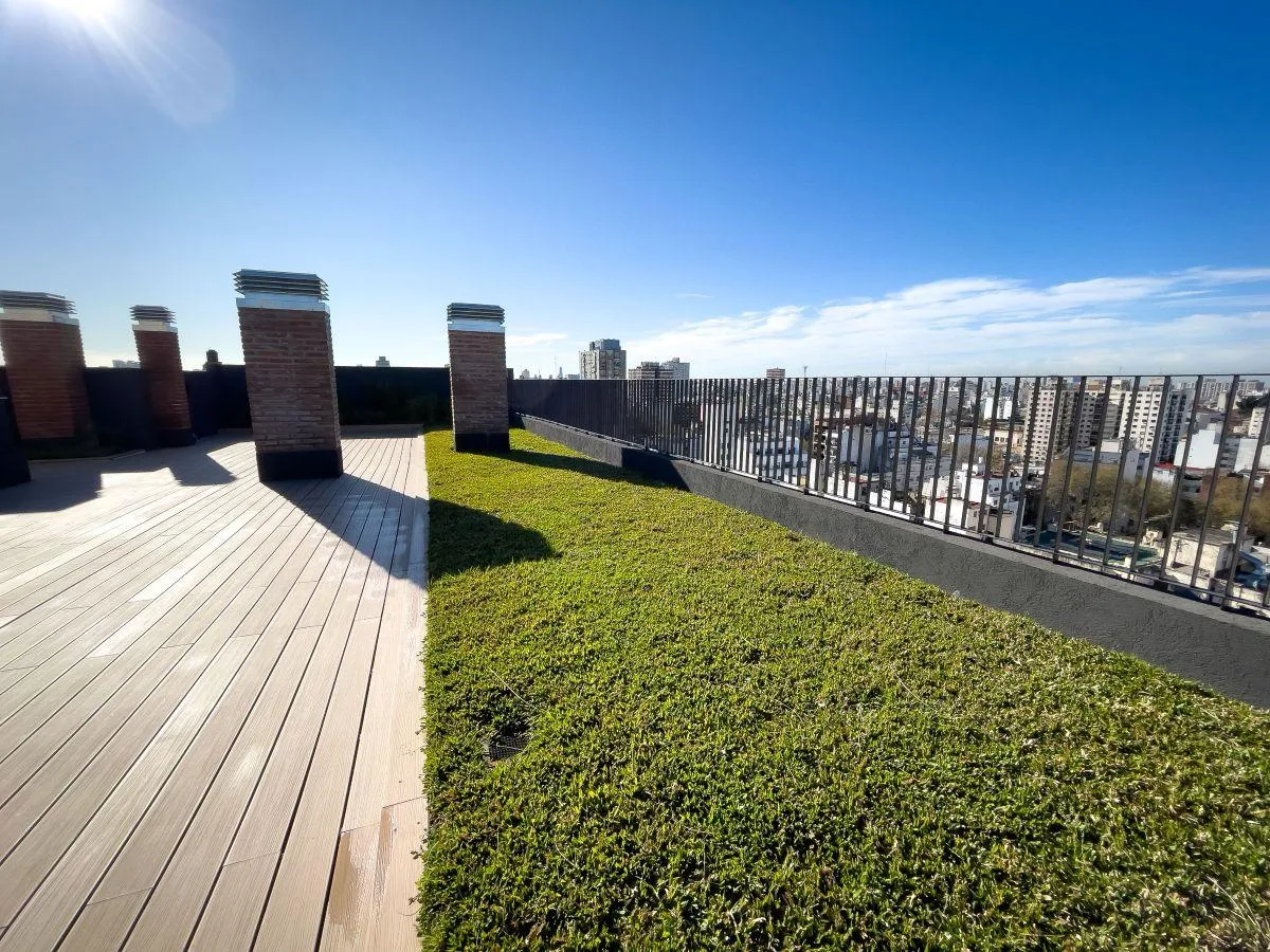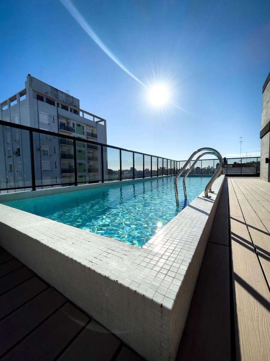 Monoambiente a estrenar con baño completo. Cuenta con gran ventanal y placard. El edificio ofrece SUM con parrilla, pantalla LCD, Wi‑Fi y terraza, gimnasio, piscina de 20 metros con solarium y deck de PVC, roof garden y zona de relax, laundry y vigilancia 24 horas.
