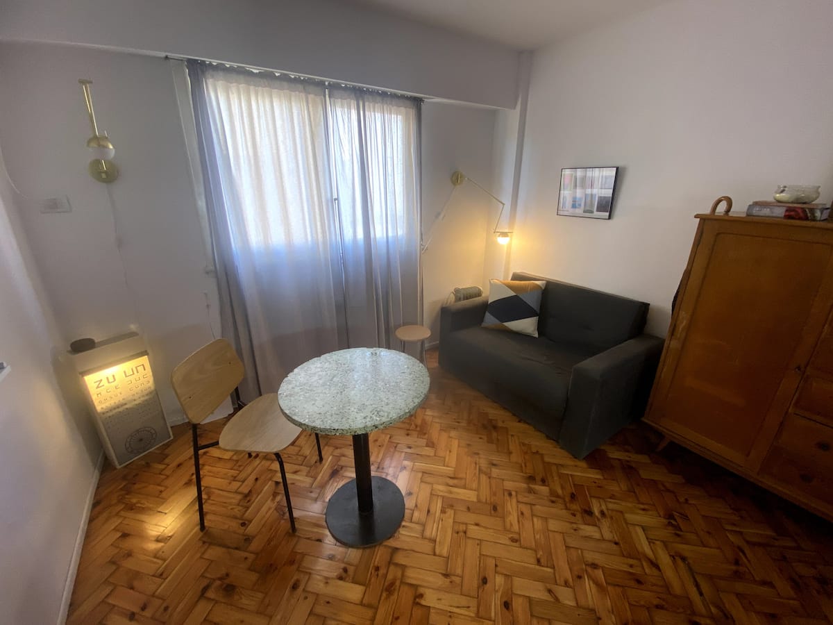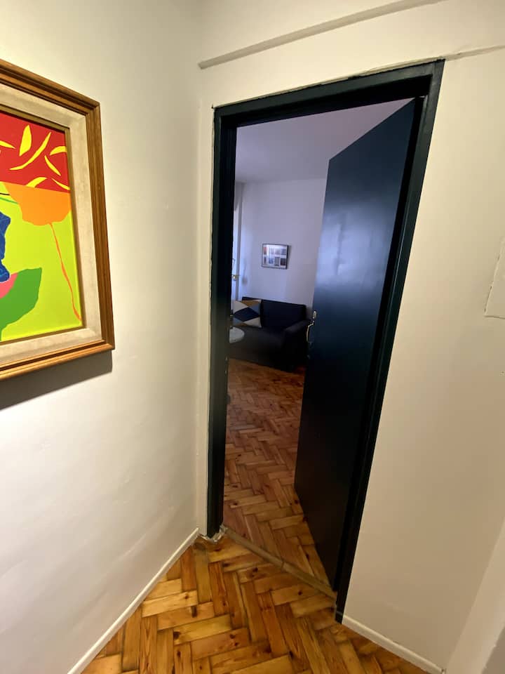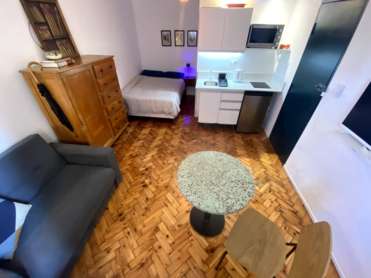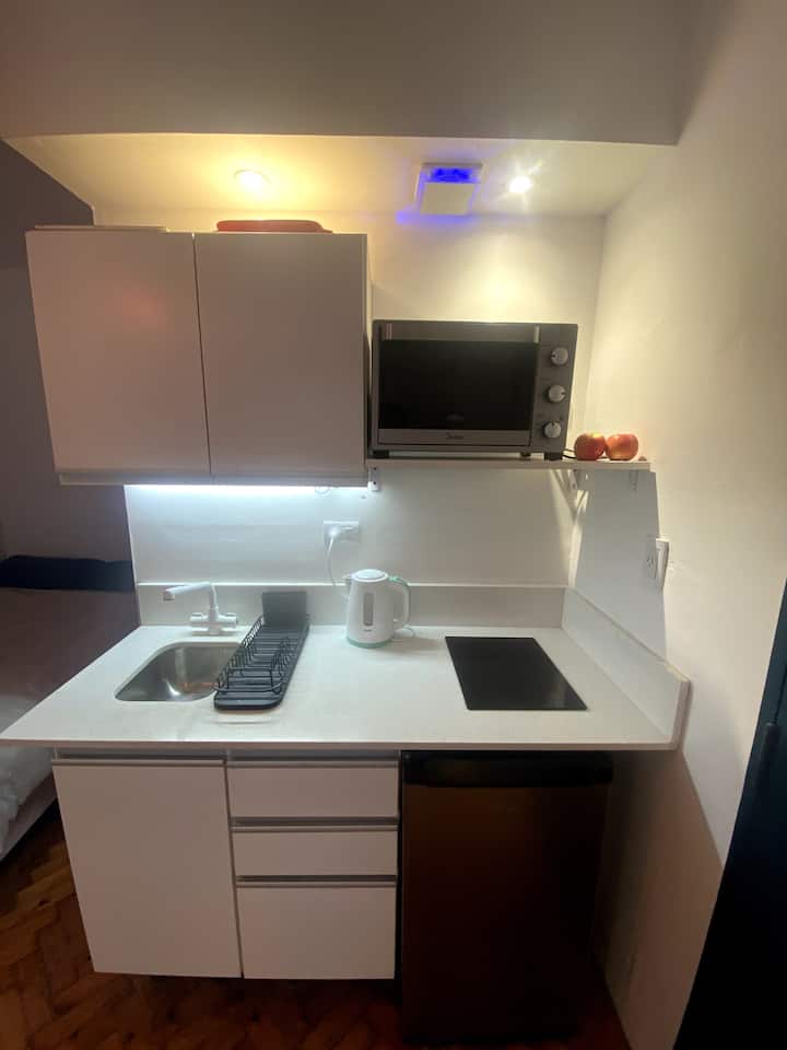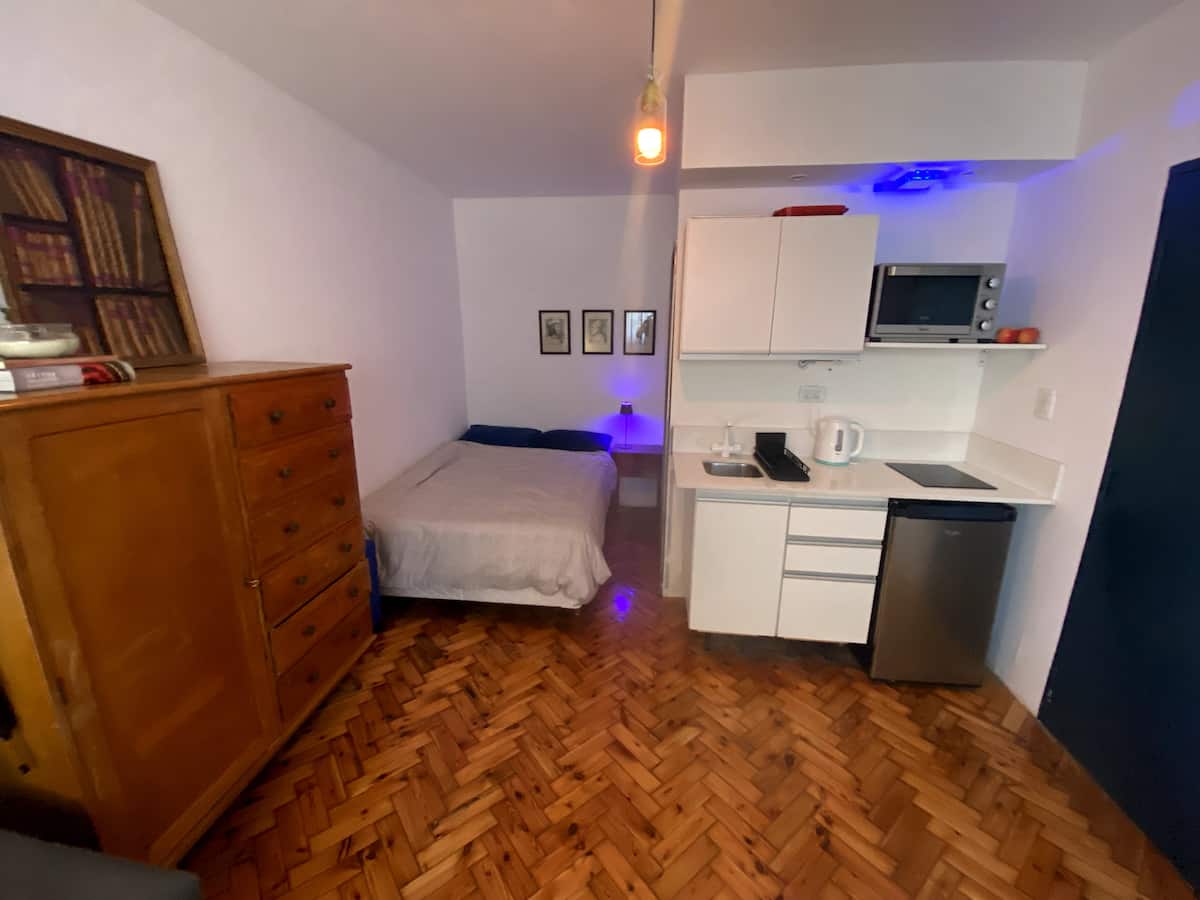 Monoambiente en edificio de contrafrente, muy silencioso. Es un departamento tipo dúplex: cuenta con baño propio, cocina y espacio de descanso; el acceso por la puerta principal del ingreso es compartido solo en los sectores que se ven en las fotos. Incluye sábanas, toallas y almohadas, además de internet de fibra óptica de alta velocidad.
