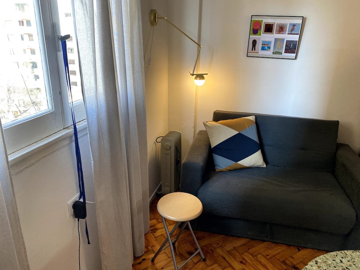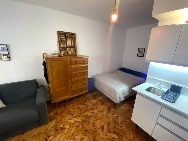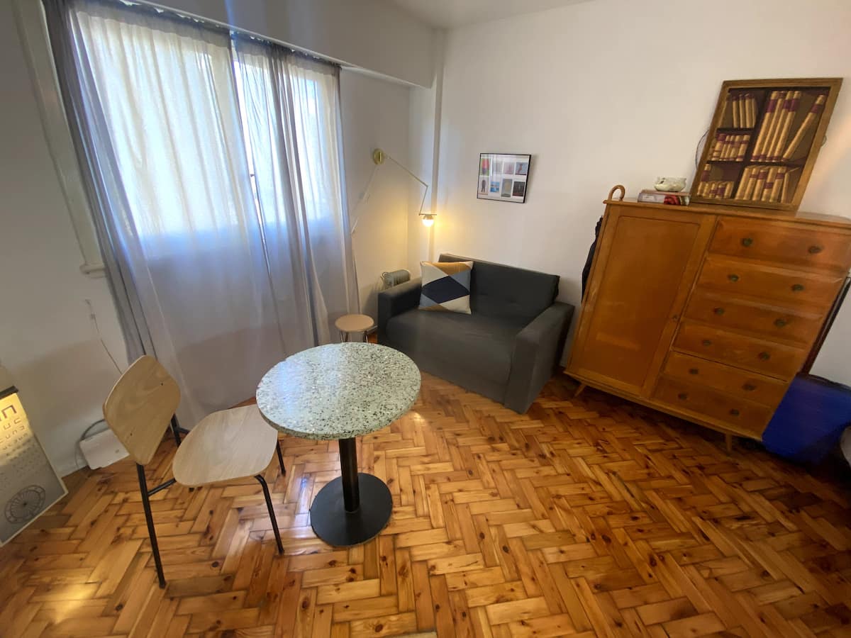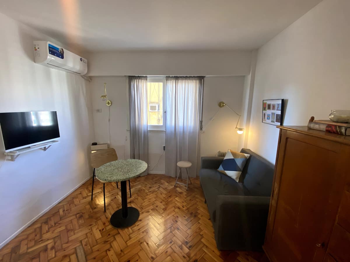 Monoambiente en edificio de contrafrente, muy silencioso. Es un departamento tipo dúplex: cuenta con baño propio, cocina y espacio de descanso; el acceso por la puerta principal del ingreso es compartido solo en los sectores que se ven en las fotos. Incluye sábanas, toallas y almohadas, además de internet de fibra óptica de alta velocidad.
