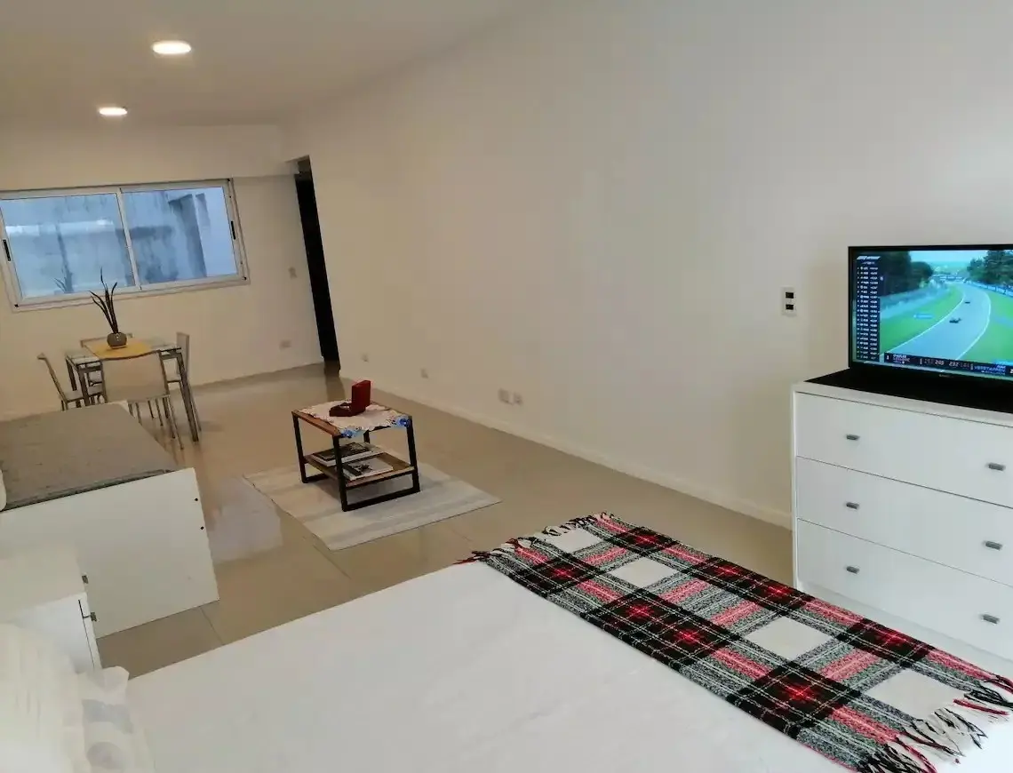 Monoambiente apto para 4 personas, con balcón y cochera cubierta en Balvanera. Tiene TV Led y aire acondicionado split frío/calor, cocina semi independiente completamente equipada y baño completo con bañera. El edificio cuenta con ascensor, terraza con parrilla y laundry; la unidad tiene ventana hacia el pulmón del edificio y ventanal con salida al balcón. El valor publicado corresponde a un mínimo de 6 meses e incluye expensas y servicios.