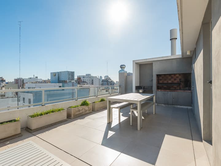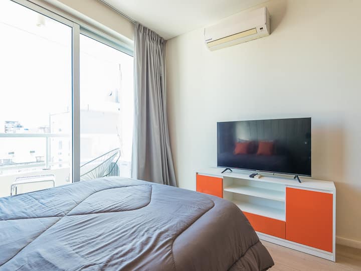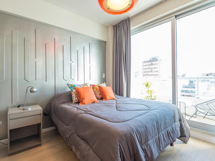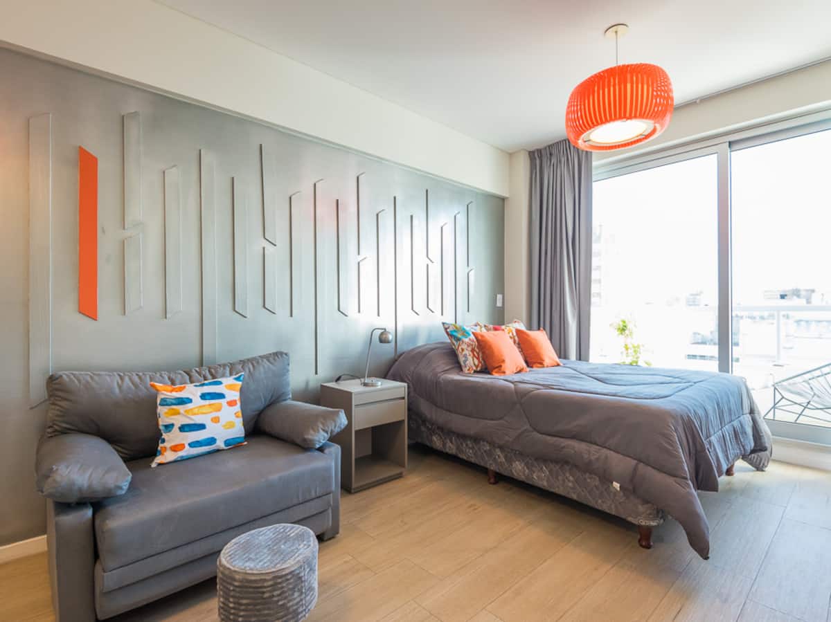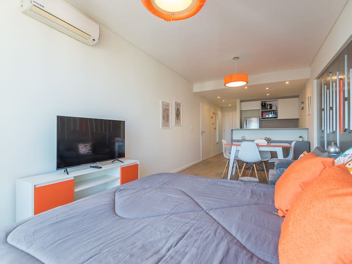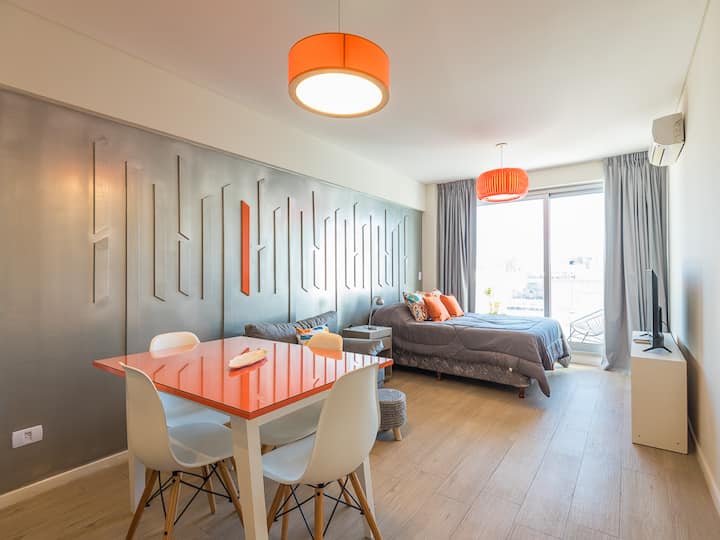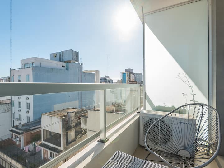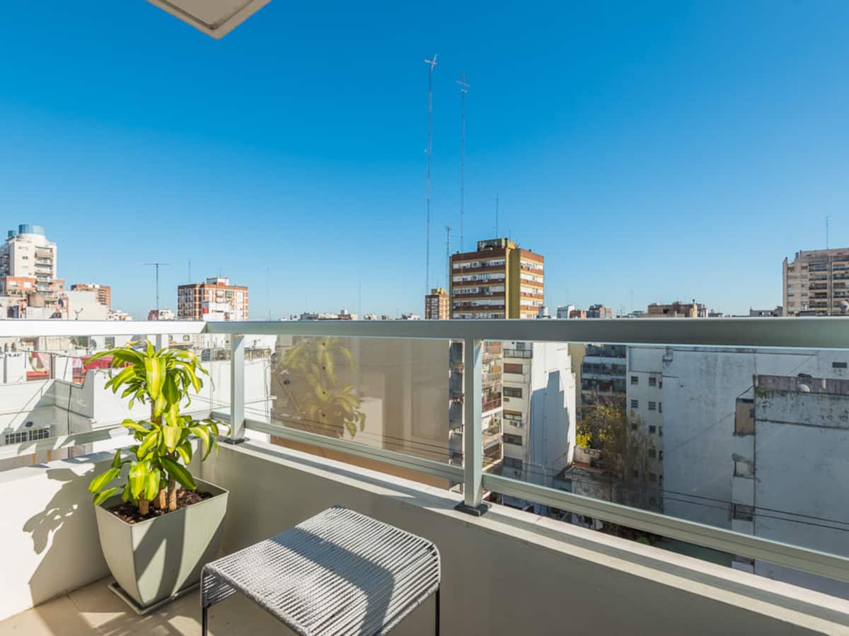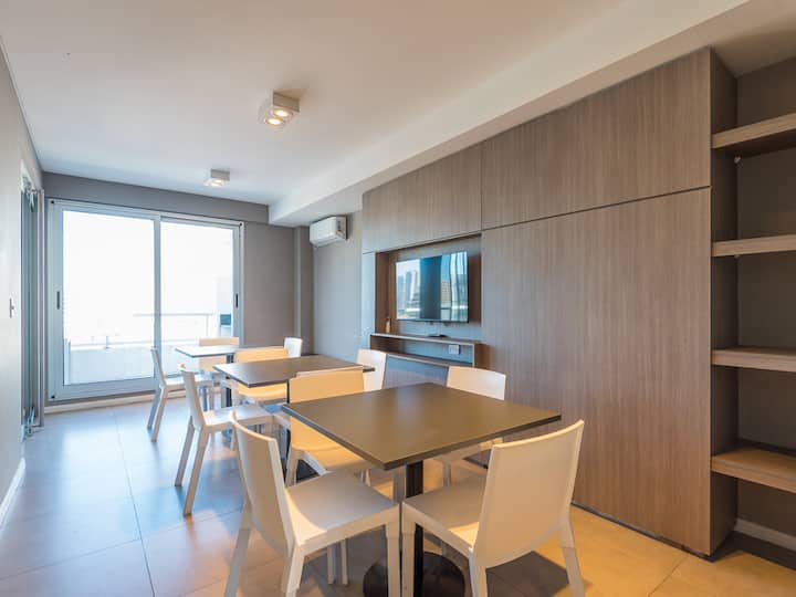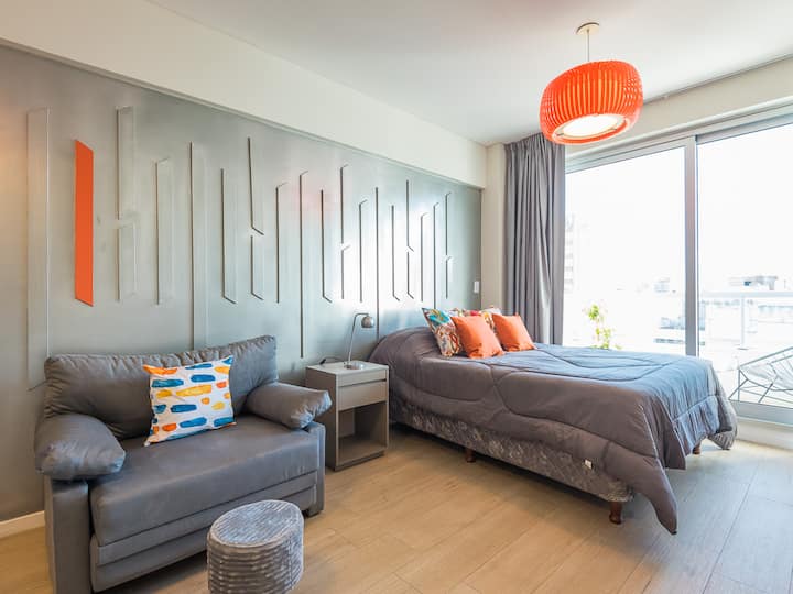 Monoambiente de 1 ambiente en Belgrano, con cocina integrada y baño completo con bañera. Tiene cama doble, sofá cama, mesa con sillas y balcón al frente. El edificio cuenta con lavadero y un SUM de uso con cargo, además de parrilla con cargo; incluye Wi-Fi.