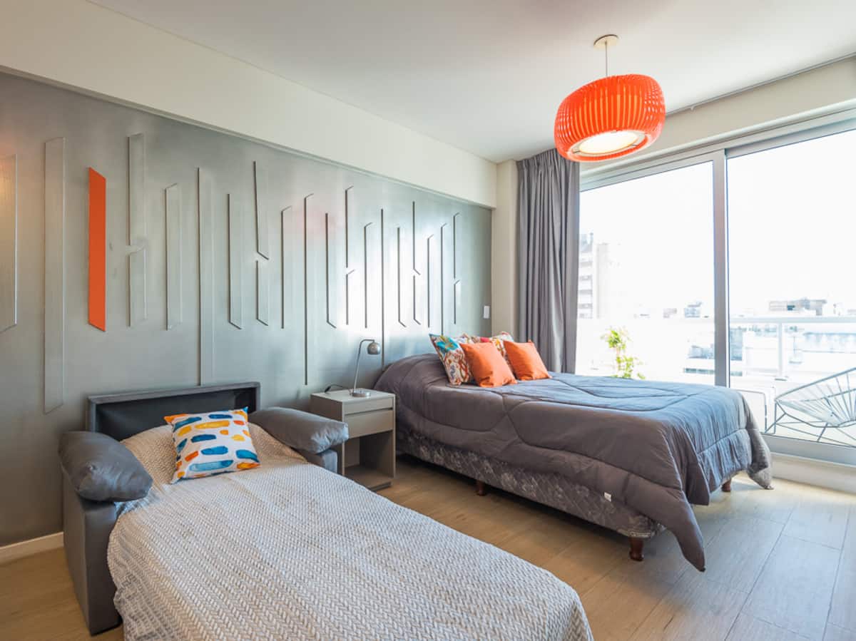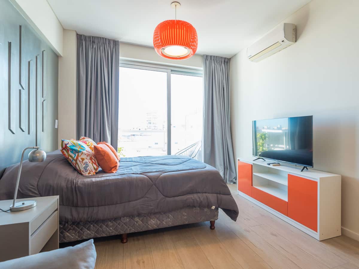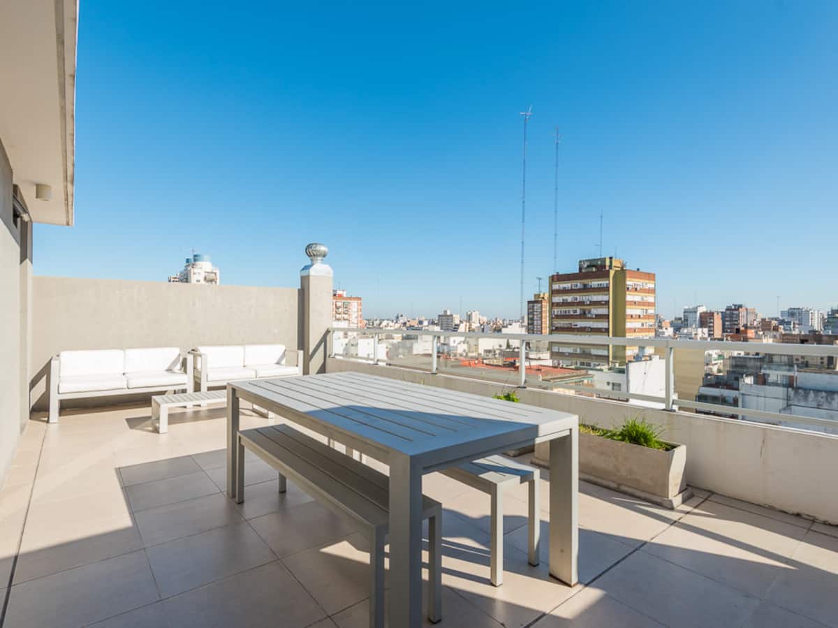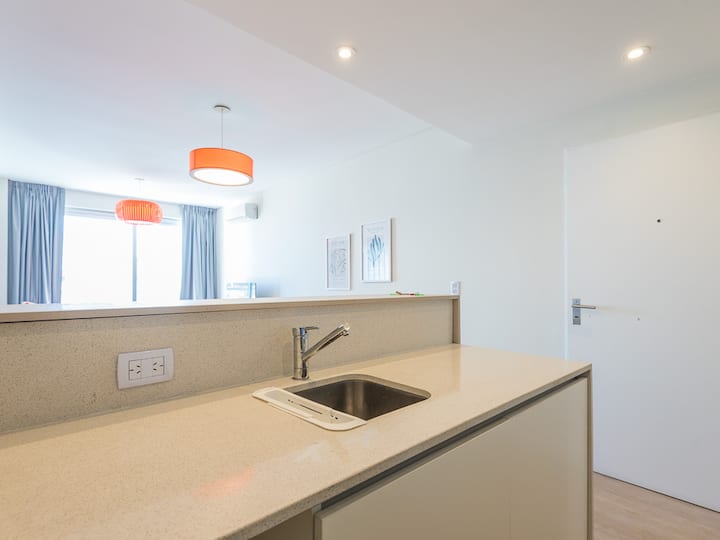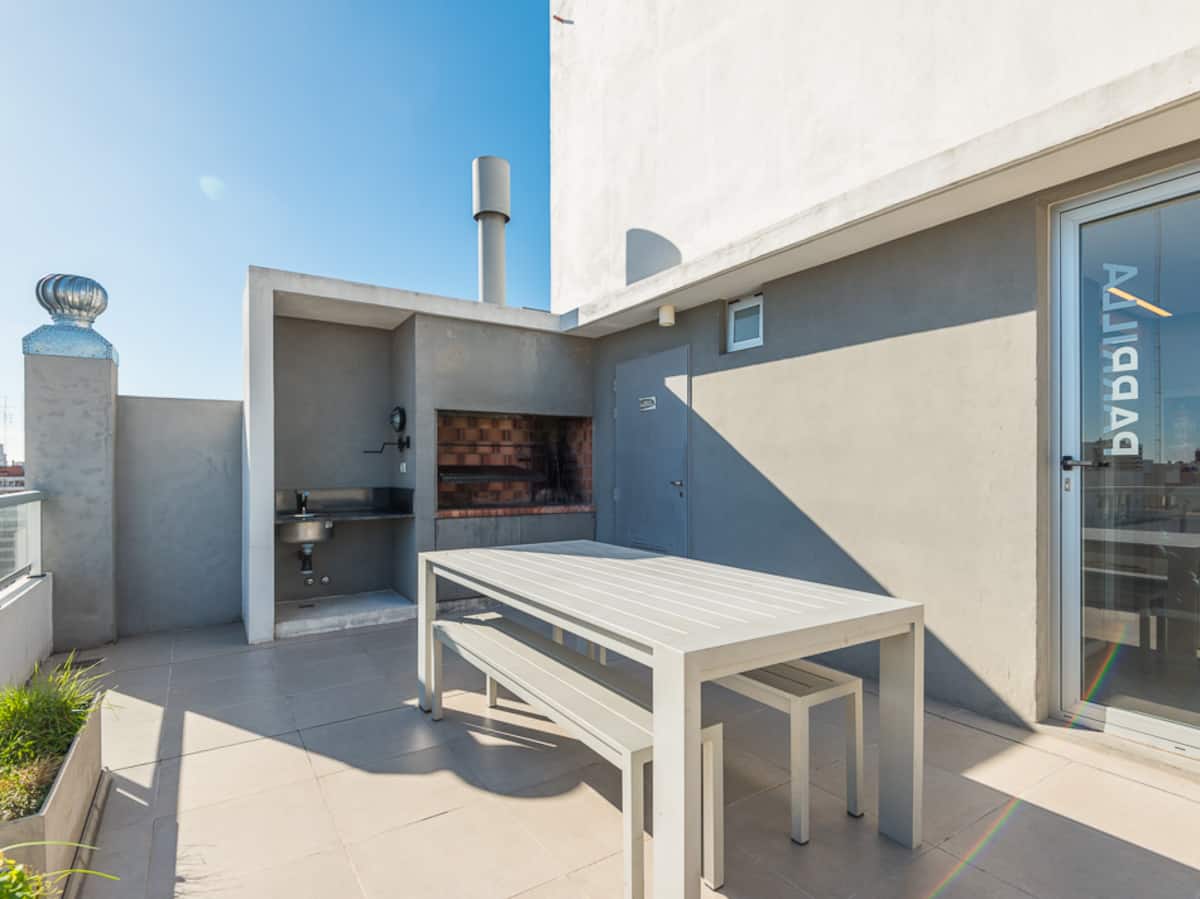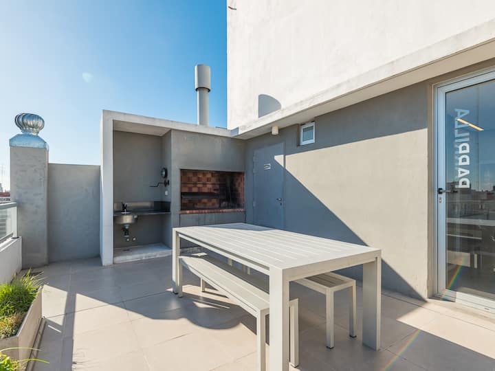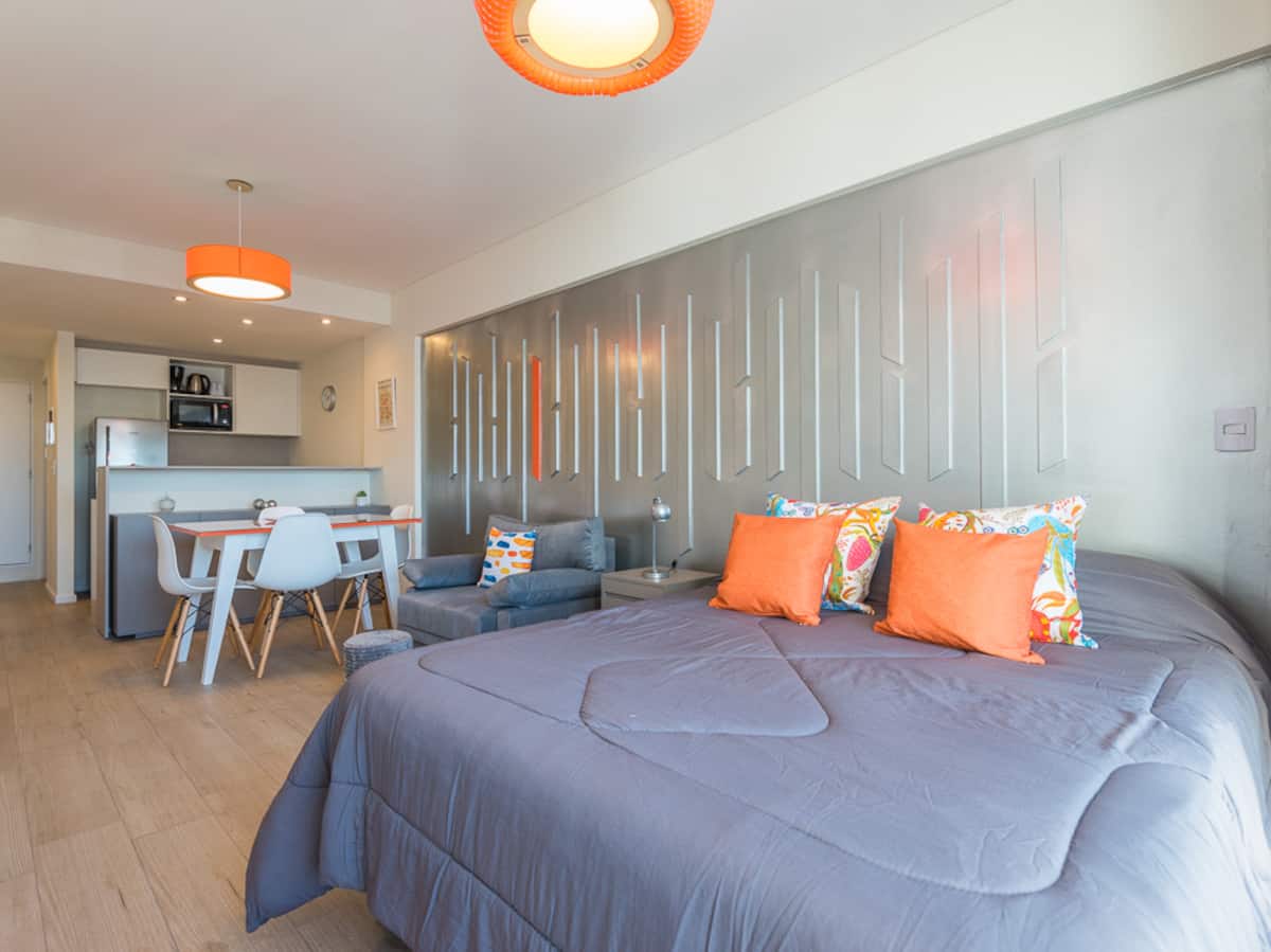 Monoambiente de 1 ambiente en Belgrano, con cocina integrada y baño completo con bañera. Tiene cama doble, sofá cama, mesa con sillas y balcón al frente. El edificio cuenta con lavadero y un SUM de uso con cargo, además de parrilla con cargo; incluye Wi-Fi.