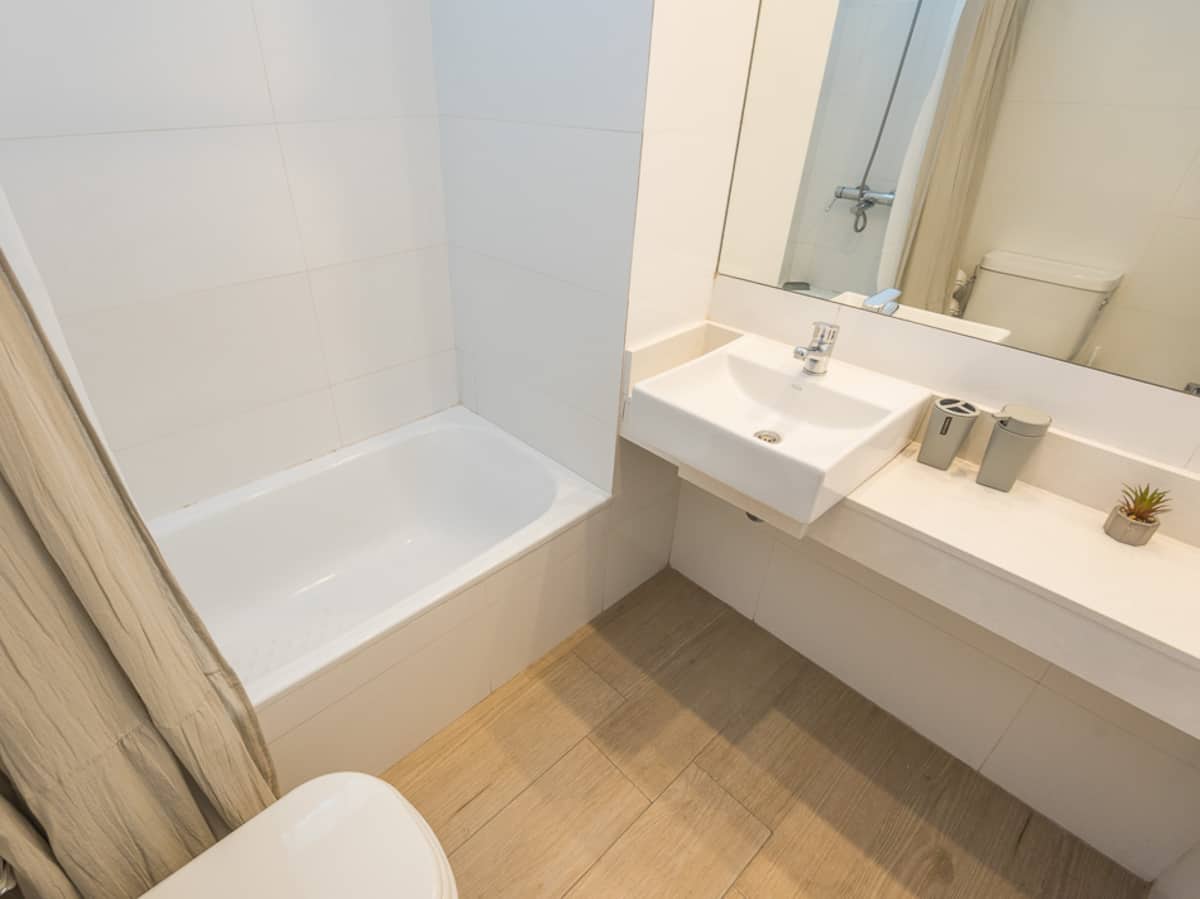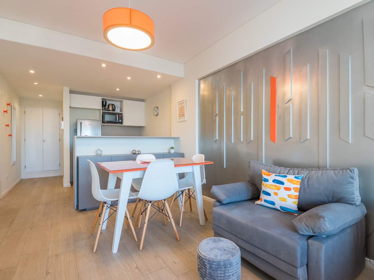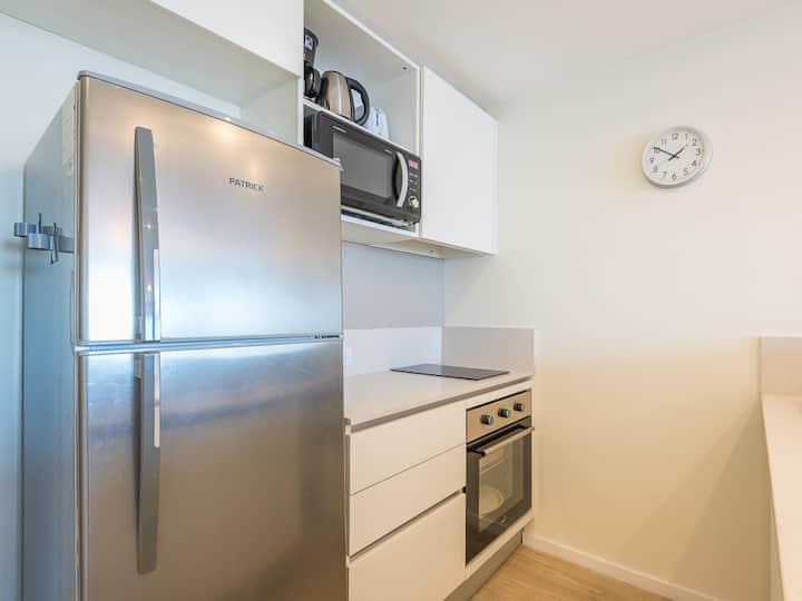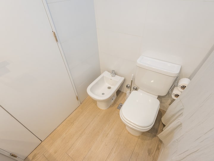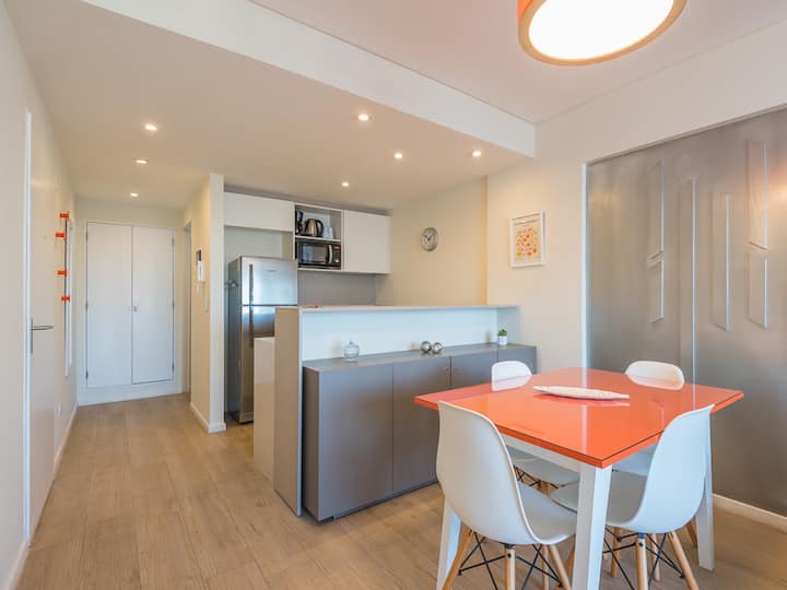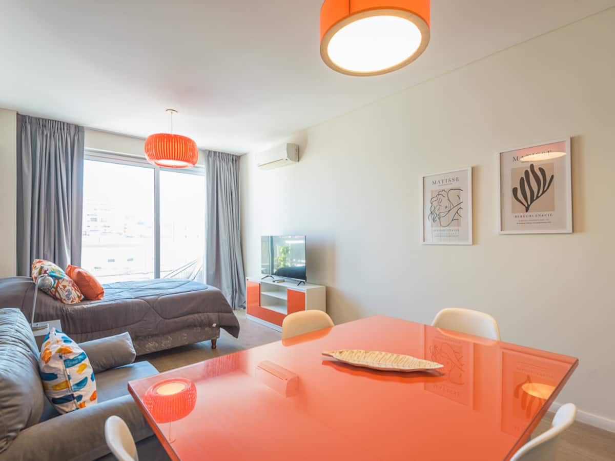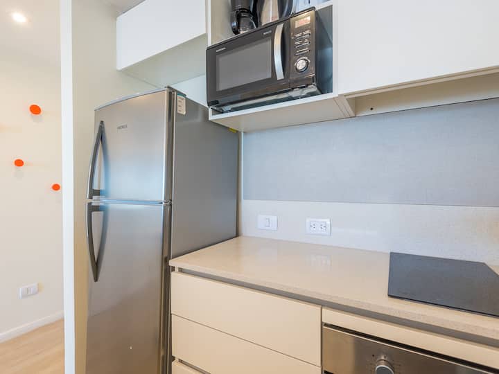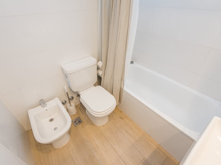 Monoambiente de 1 ambiente en Belgrano, con cocina integrada y baño completo con bañera. Tiene cama doble, sofá cama, mesa con sillas y balcón al frente. El edificio cuenta con lavadero y un SUM de uso con cargo, además de parrilla con cargo; incluye Wi-Fi.