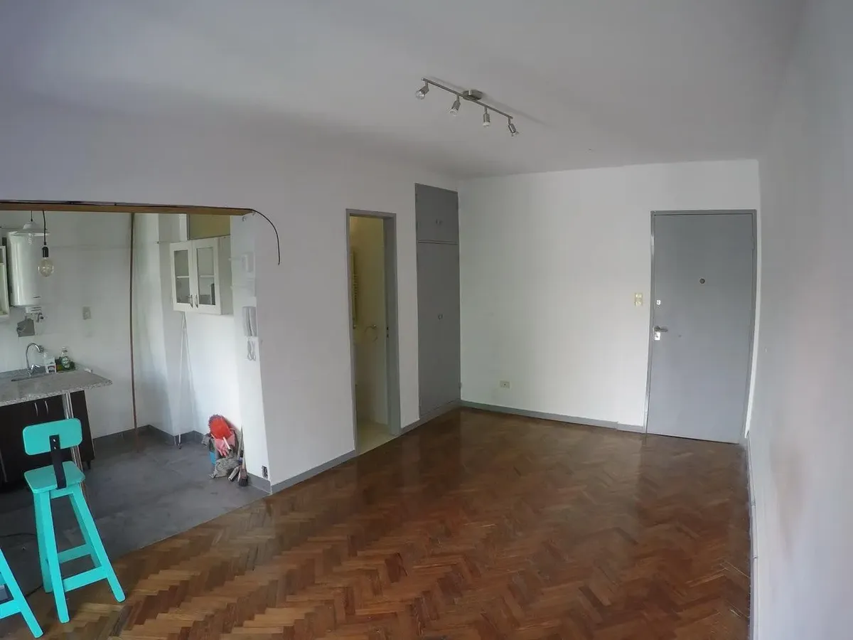 Monoambiente en Belgrano con placard, piso de parquet y balcón al frente. Está en el 3er piso por escalera y fue refaccionado. Cuenta con cocina con barra desayunadora con 2 taburetes e instalación para lavarropas.