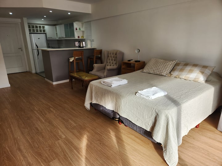 Monoambiente en edificio sobre Av. Libertador. Cuenta con equipamiento para cocina: horno y heladera. Incluye TV 43 pulgadas 4K. El edificio tiene laundry. Se puede estacionar libremente en la calle.