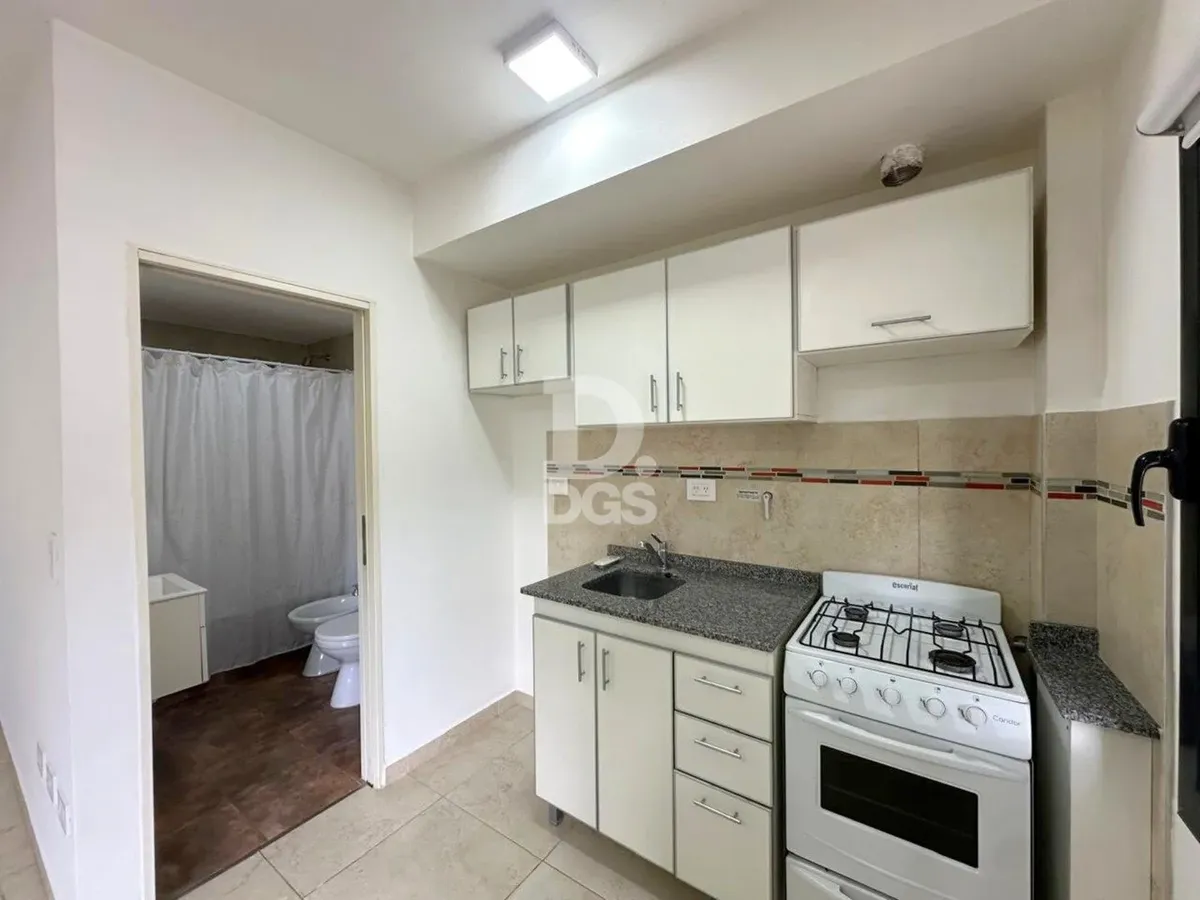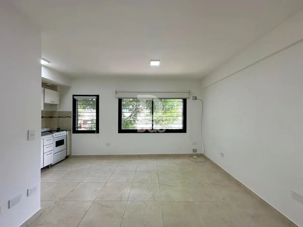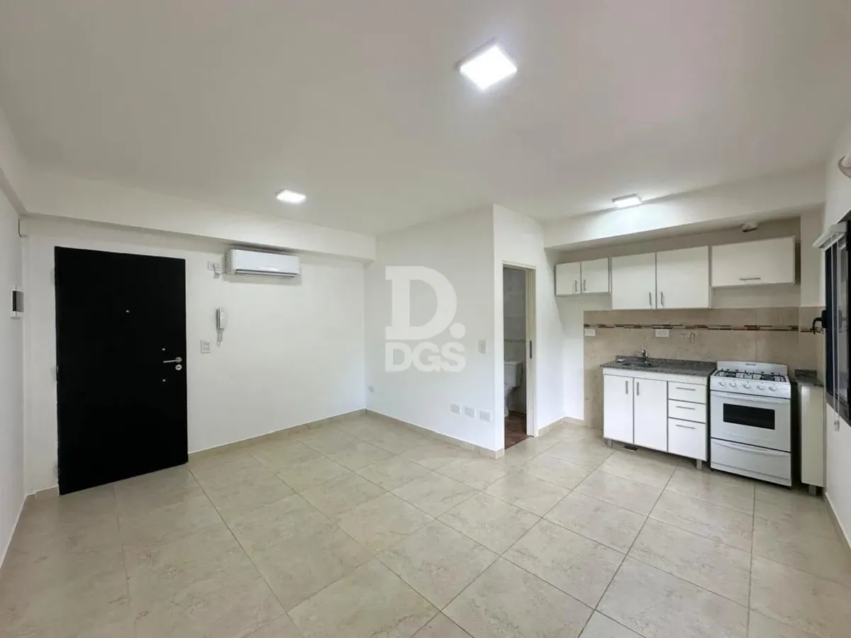 Monoambiente al frente en Banfield Este con cochera descubierta para 1 vehículo. Cuenta con aire acondicionado frío/calor y cortinas sunscreen y blackout. Tiene baño completo con bañera y cocina con muebles de alto y bajo mesada, en un edificio de pocas unidades. Las expensas incluyen luz, agua y municipal, y hay medidor individual de gas. El contrato es por 2 años con actualización cuatrimestral por IPC; ARBA a cargo del propietario.
